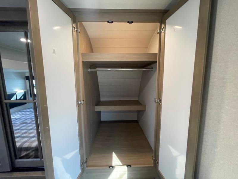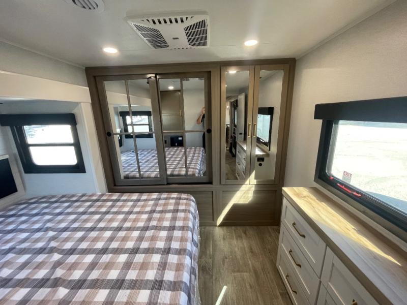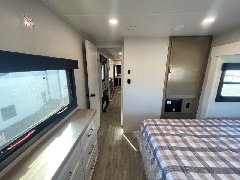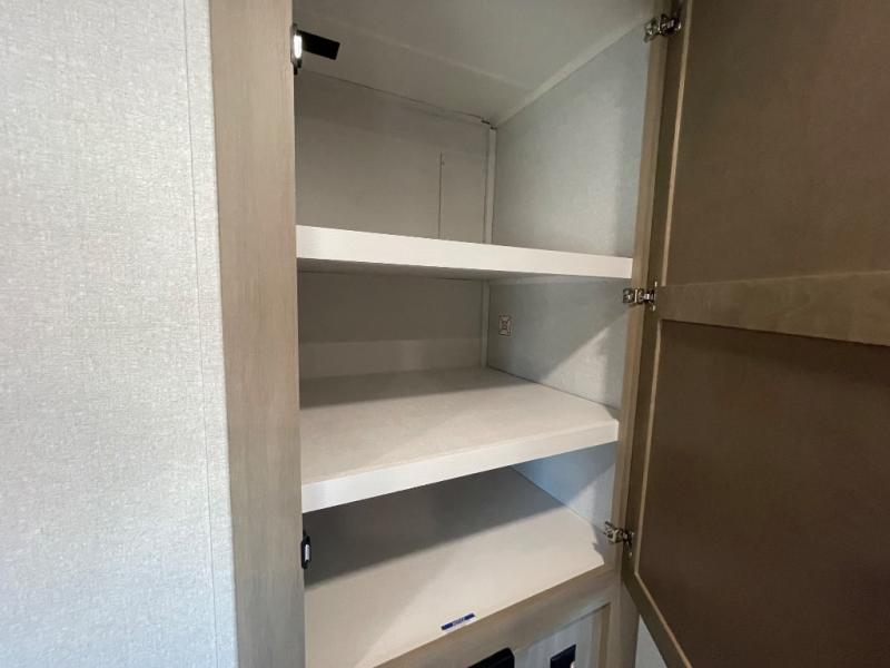 You will feel right at home camping in this travel trailer! It features a front private bedroom with an Olympic queen bed slide for more interior space, a dresser, a front wardrobe to hang your clothes, and a wardrobe with washer and dryer prep. Start each morning getting squeaky clean in the full bathroom with the shower, then head to the kitchen to fry up some eggs on the stainless steel range. The kitchen island provides more counter space to prep meals, and there are two pantries for dry goods and snacks. There is also a table and chairs with a bench seat plus a tri-fold sofa within the large slide out. And a desk with a bench seat lets you get some work done!