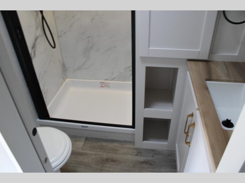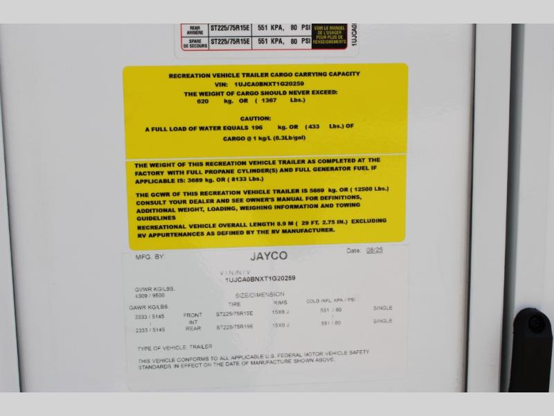 With any Eagle SLE fifth wheel by Jayco, you will enjoy a lighter tow weight, high-end finishes, and the same quality construction you've come to expect from Jayco! There is an Alpha Ply TPO roof membrane, a fully enclosed and heated underbelly, plus Stronghold VBL walls for added durability. There is also a rear 2" towing receiver outside, along with metal slam latch baggage doors, MORryde Step Above entry steps, and a Winegard Air 360 antenna with router prep if you want to stay connected as you camp. Once inside you'll enjoy the handcrafted and glazed door/drawer fronts, blackout pleated shades throughout, and residential vinyl flooring throughout with no carpet for an easier clean. The on-demand water heater, 30K BTU furnace, and 15K BTU "Whisper Quiet" A/C will ensure your comfort year around, and the optional Overland 1 Solar Package can be added if you need off-grid capabilities!