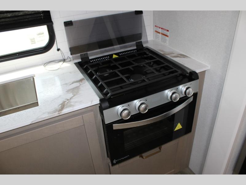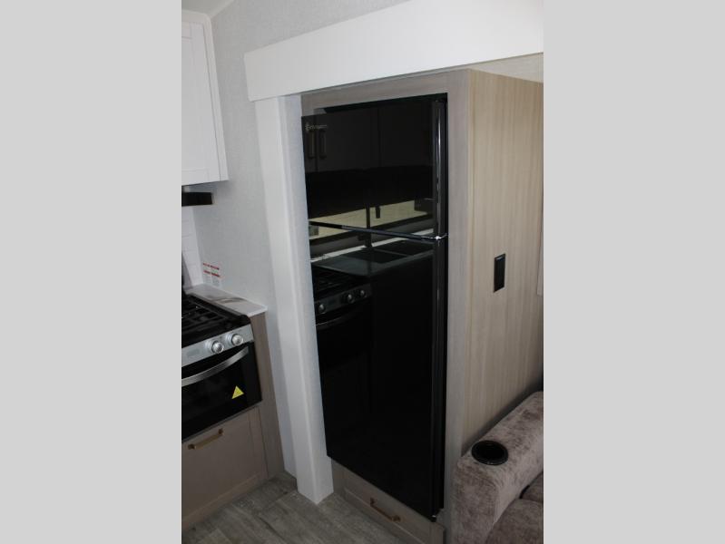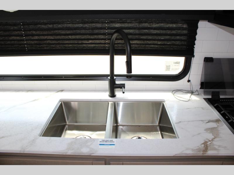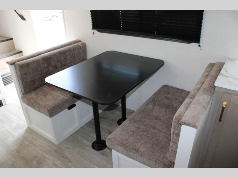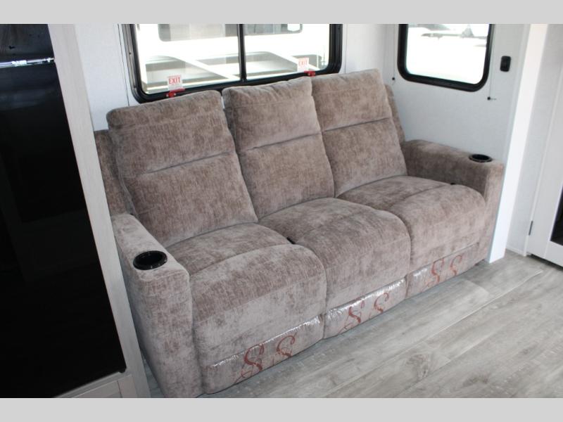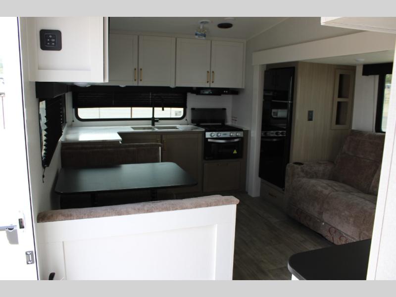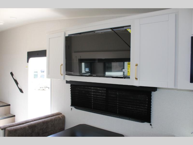 Camping just got a whole lot sweeter in this fifth wheel with double slides, a rear kitchen, and sleeping space for five to six. You'll love waking up each morning in the front private bedroom that includes a queen bed, dual nightstands and overhead cabinets, plus a wardrobe and dresser slide. Your guests who slept on the tri-fold sofa and booth dinette can convert these back to seating space in the morning, and breakfast can be made in the rear kitchen. Here, you'll find ample counter space, a microwave and range, plus a pantry and 12V refrigerator for food storage. Outside, gear can be stored in the pass-thru storage area, and you're sure to enjoy the 16' power awning with LED Lights!