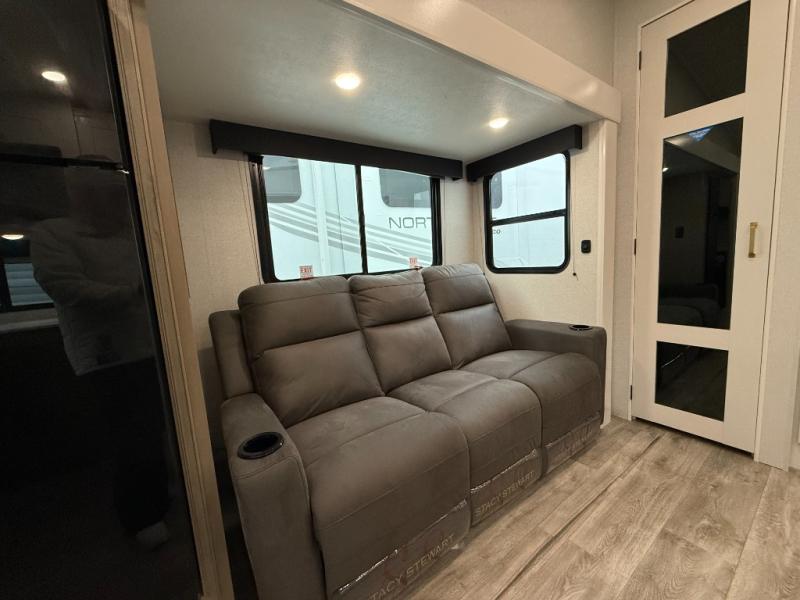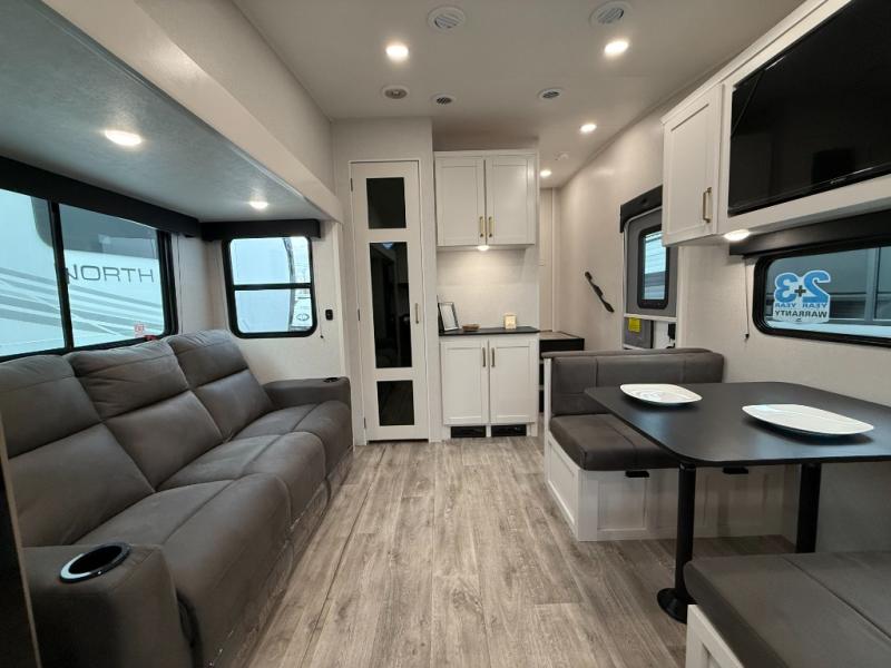 Camping just got a whole lot sweeter in this fifth wheel with double slides, a rear kitchen, and sleeping space for five to six. You'll love waking up each morning in the front private bedroom that includes a queen bed, dual nightstands and overhead cabinets, plus a wardrobe and dresser slide. Your guests who slept on the tri-fold sofa and booth dinette can convert these back to seating space in the morning, and breakfast can be made in the rear kitchen. Here, you'll find ample counter space, a microwave and range, plus a pantry and 12V refrigerator for food storage. Outside, gear can be stored in the pass-thru storage area, and you're sure to enjoy the 16' power awning with LED Lights!