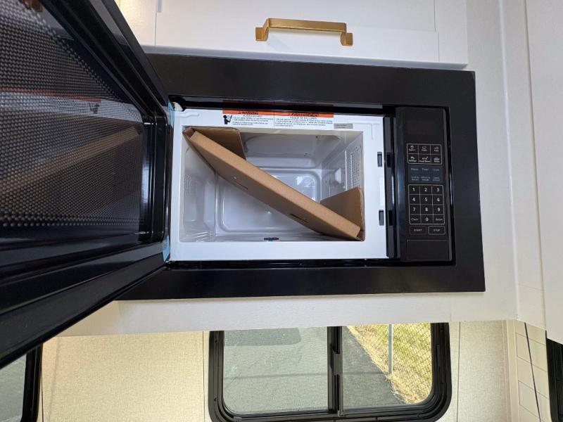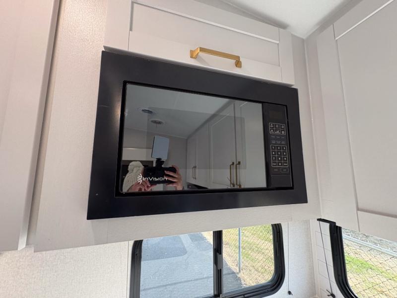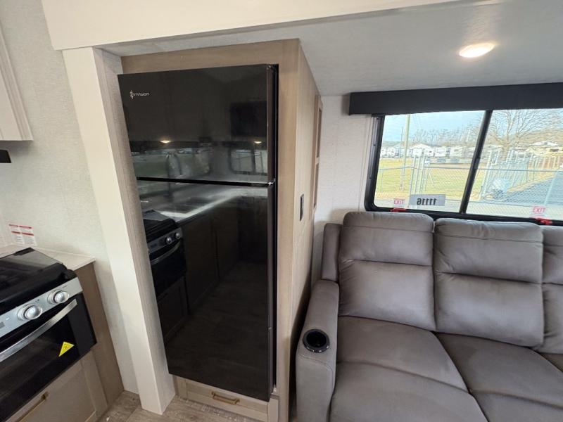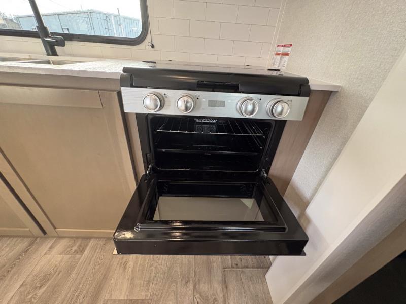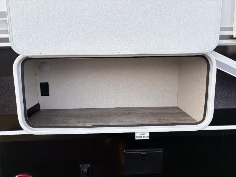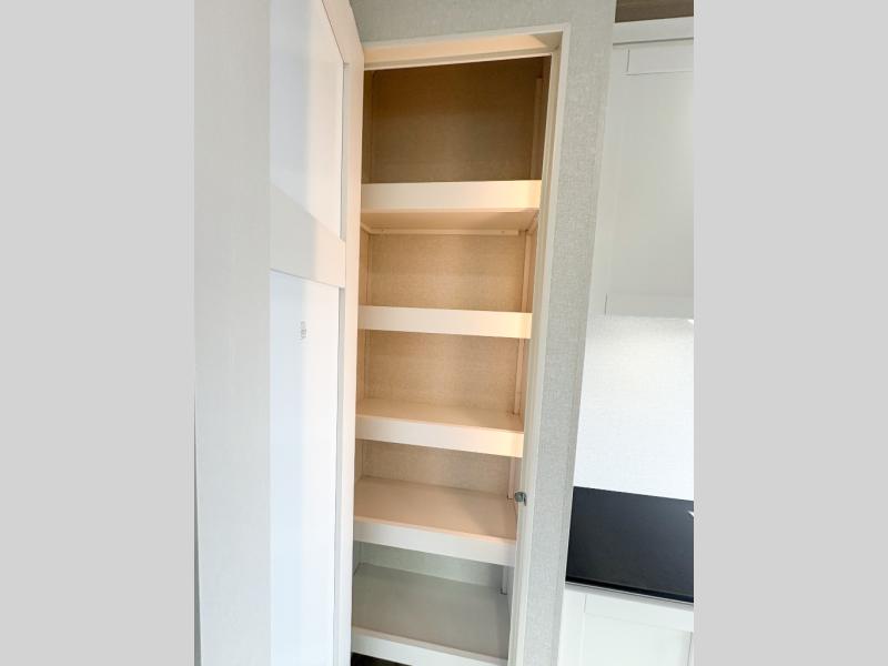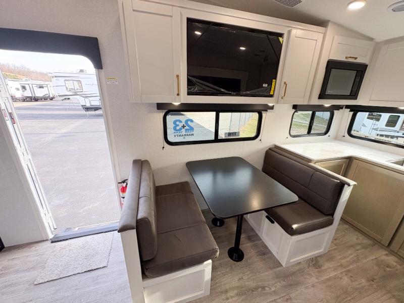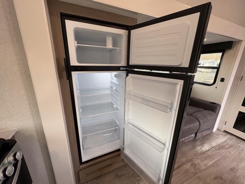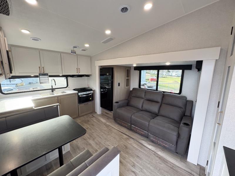 Camping just got a whole lot sweeter in this fifth wheel with double slides, a rear kitchen, and sleeping space for five to six. You'll love waking up each morning in the front private bedroom that includes a queen bed, dual nightstands and overhead cabinets, plus a wardrobe and dresser slide. Your guests who slept on the tri-fold sofa and booth dinette can convert these back to seating space in the morning, and breakfast can be made in the rear kitchen. Here, you'll find ample counter space, a microwave and range, plus a pantry and 12V refrigerator for food storage. Outside, gear can be stored in the pass-thru storage area, and you're sure to enjoy the 16' power awning with LED Lights!