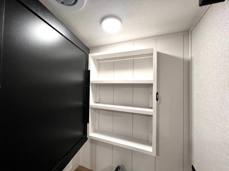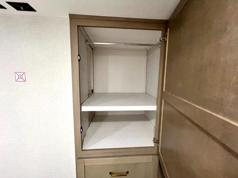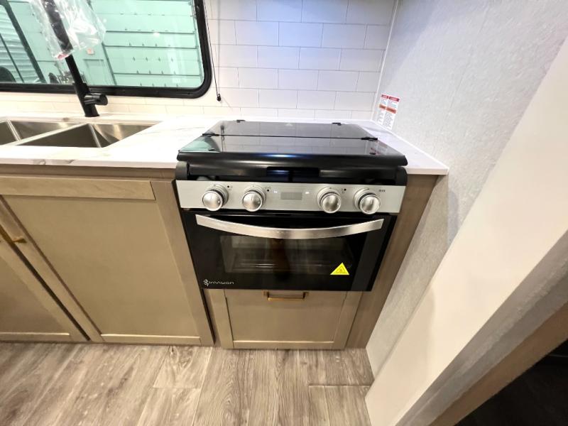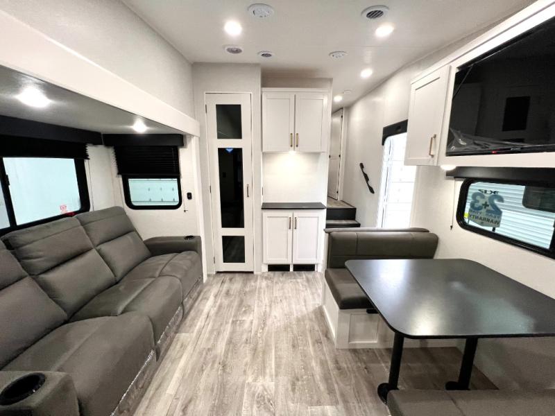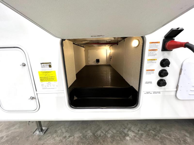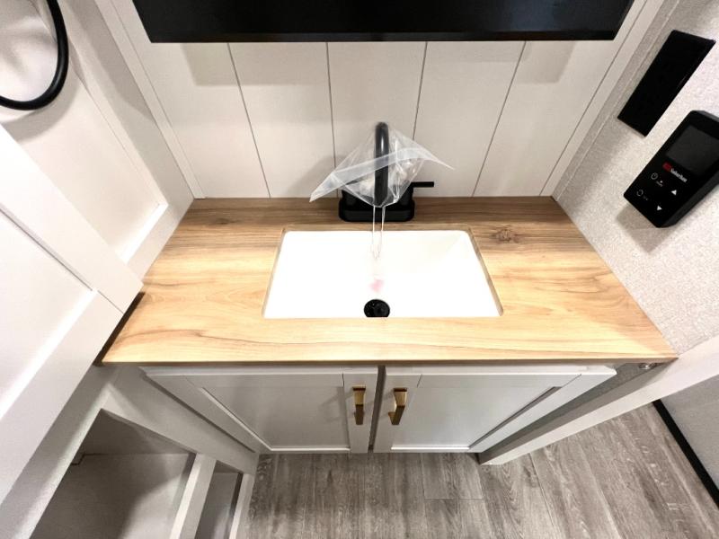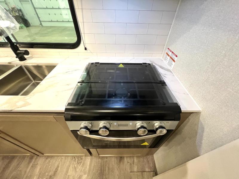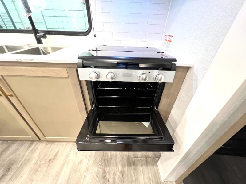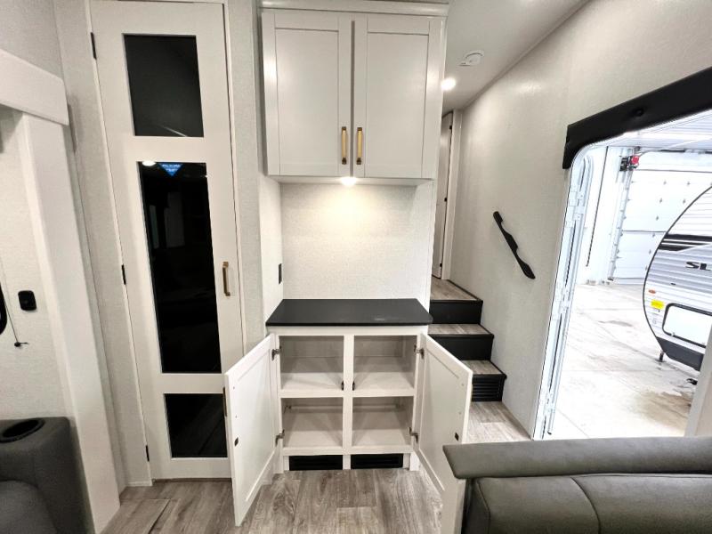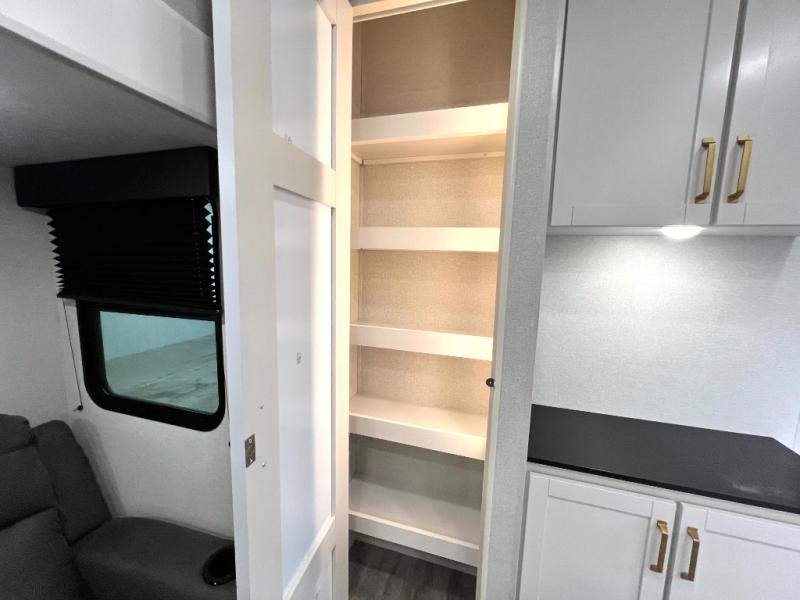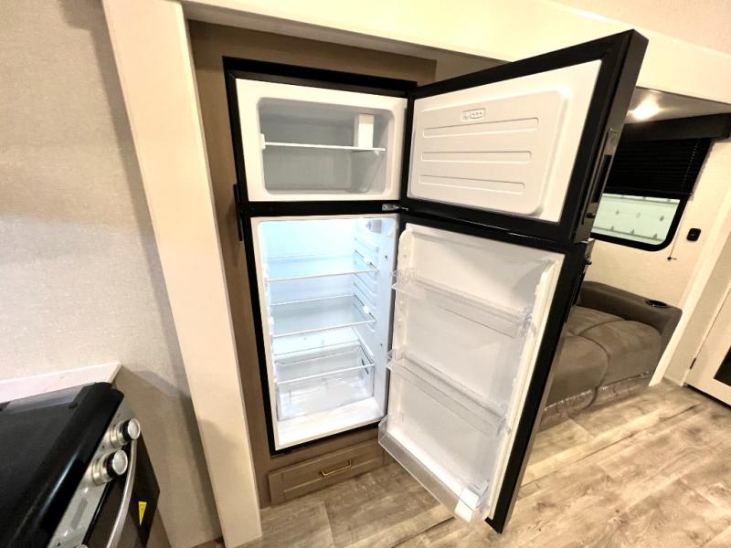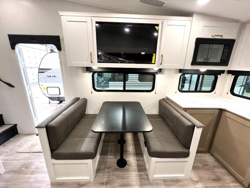 Camping just got a whole lot sweeter in this fifth wheel with double slides, a rear kitchen, and sleeping space for five to six. You'll love waking up each morning in the front private bedroom that includes a queen bed, dual nightstands and overhead cabinets, plus a wardrobe and dresser slide. Your guests who slept on the tri-fold sofa and booth dinette can convert these back to seating space in the morning, and breakfast can be made in the rear kitchen. Here, you'll find ample counter space, a microwave and range, plus a pantry and 12V refrigerator for food storage. Outside, gear can be stored in the pass-thru storage area, and you're sure to enjoy the 16' power awning with LED Lights!