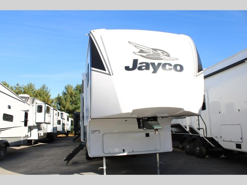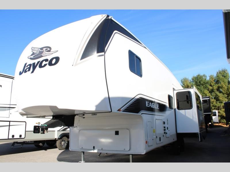 With any Eagle SLE fifth wheel by Jayco, you will enjoy a lighter tow weight, high-end finishes, and the same quality construction you've come to expect from Jayco! There is an Alpha Ply TPO roof membrane, a fully enclosed and heated underbelly, plus Stronghold VBL walls for added durability. There is also a rear 2" towing receiver outside, along with metal slam latch baggage doors, MORryde Step Above entry steps, and a Winegard Air 360 antenna with router prep if you want to stay connected as you camp. Once inside you'll enjoy the handcrafted and glazed door/drawer fronts, blackout pleated shades throughout, and residential vinyl flooring throughout with no carpet for an easier clean. The on-demand water heater, 30K BTU furnace, and 15K BTU "Whisper Quiet" A/C will ensure your comfort year around, and the optional Overland 1 Solar Package can be added if you need off-grid capabilities!