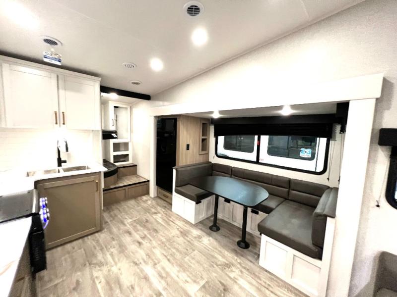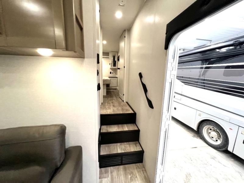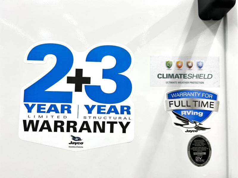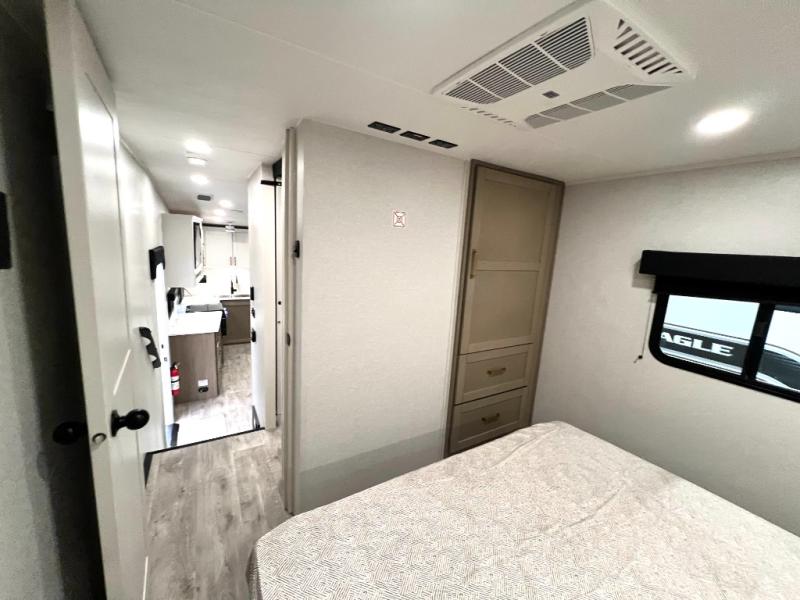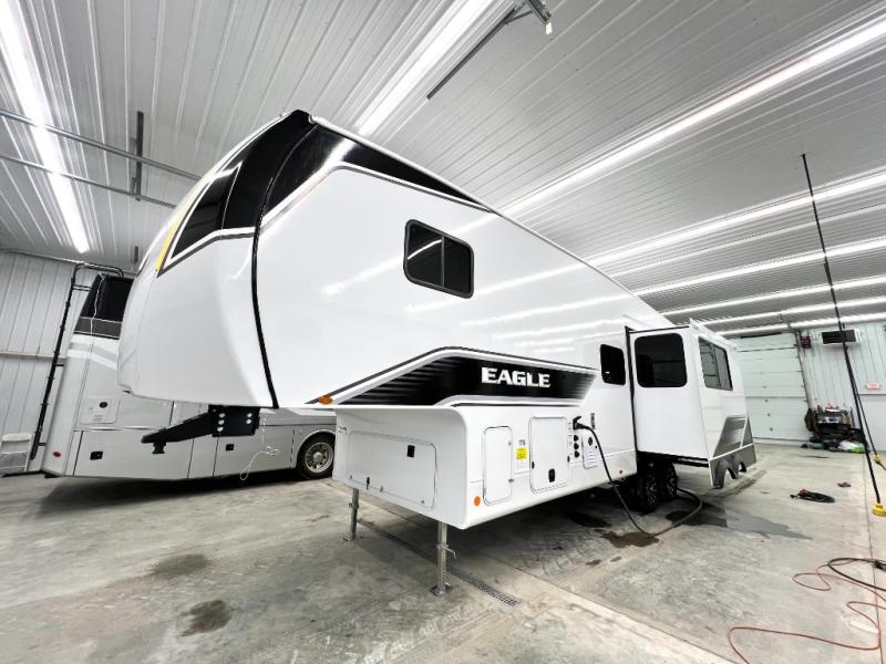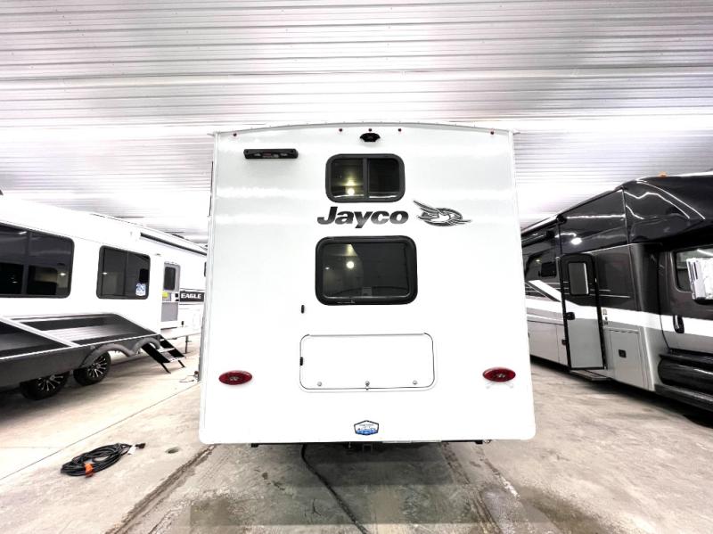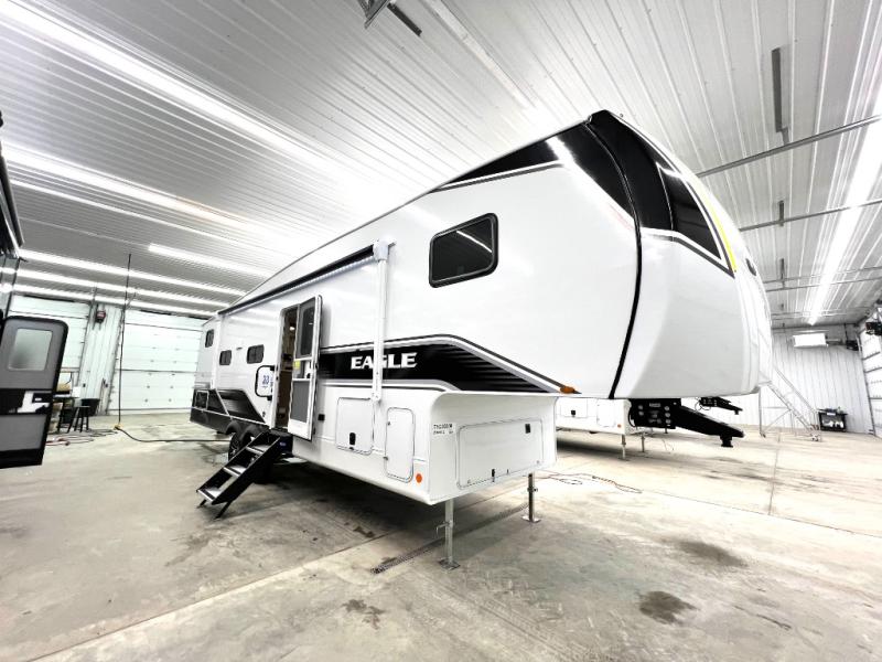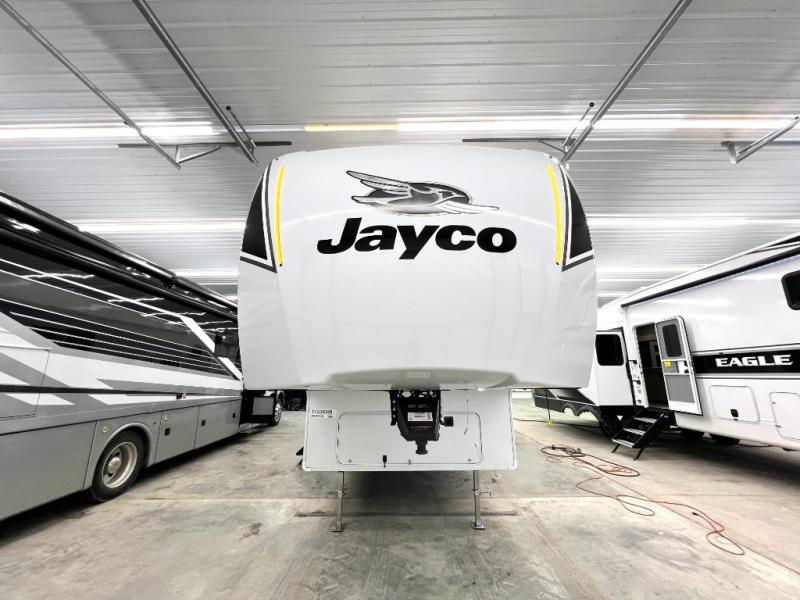 With any Eagle SLE fifth wheel by Jayco, you will enjoy a lighter tow weight, high-end finishes, and the same quality construction you've come to expect from Jayco! There is an Alpha Ply TPO roof membrane, a fully enclosed and heated underbelly, plus Stronghold VBL walls for added durability. There is also a rear 2" towing receiver outside, along with metal slam latch baggage doors, MORryde Step Above entry steps, and a Winegard Air 360 antenna with router prep if you want to stay connected as you camp. Once inside you'll enjoy the handcrafted door/drawer fronts, shower skylight, and residential vinyl flooring throughout with no carpet for an easier clean. The on-demand water heater, 30K BTU furnace, and 15K BTU "Whisper Quiet" A/C will ensure your comfort, and the Overland 1 Solar Package will provide off-grid capabilities!