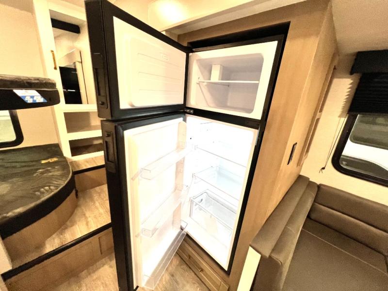 If you enjoy camping with a larger group, this fifth wheel is perfect for you! The rear bunkhouse includes double-size bunks, bunk storage and a wardrobe to keep this space tidy. You'll have the front private bedroom all to yourselves with a queen bed, and if you have any other guests, they can sleep on the tri-fold sofa and U-shaped dinette in the main living area. This space is also shared with the full kitchen, complete with a microwave and range, 12V refrigerator, and plenty of overhead cabinets for storage. After dinner, head outdoors to enjoy the 19' power awning with LED lights as you relax in your camp chairs!