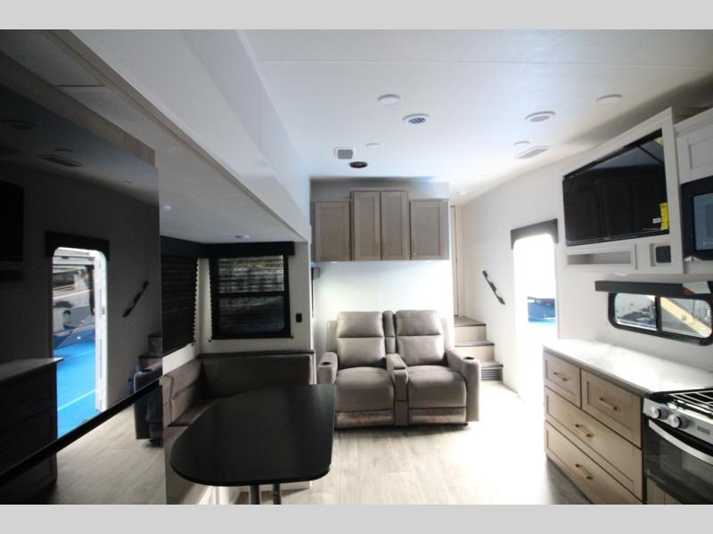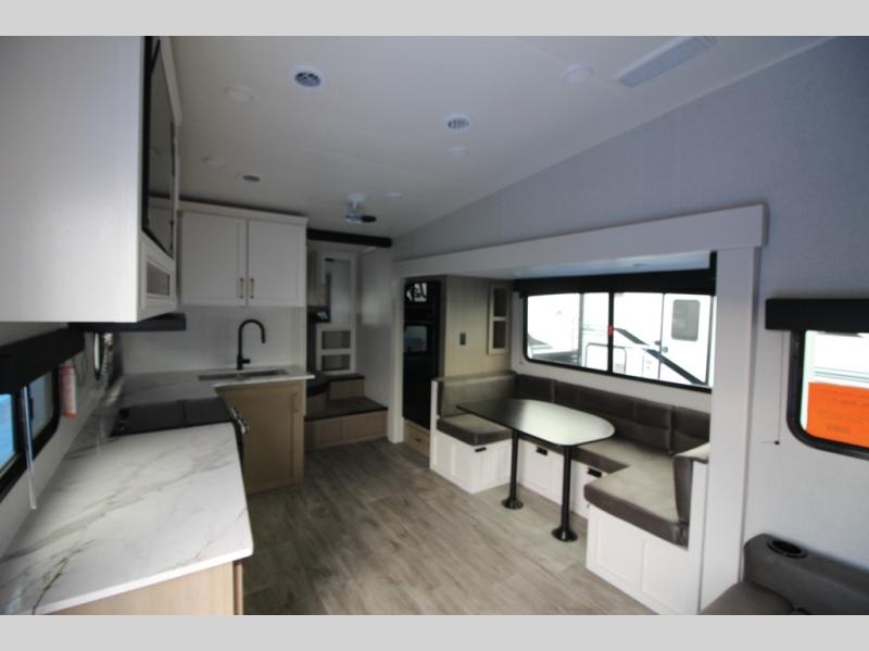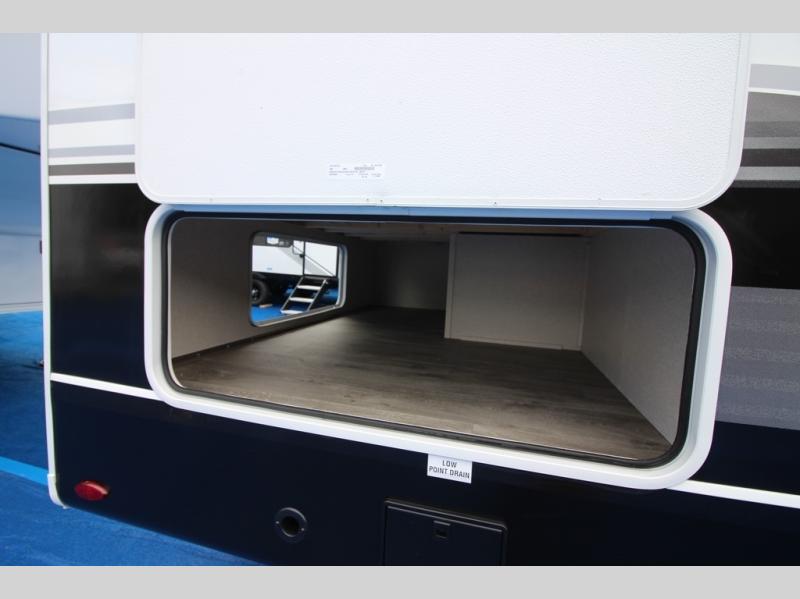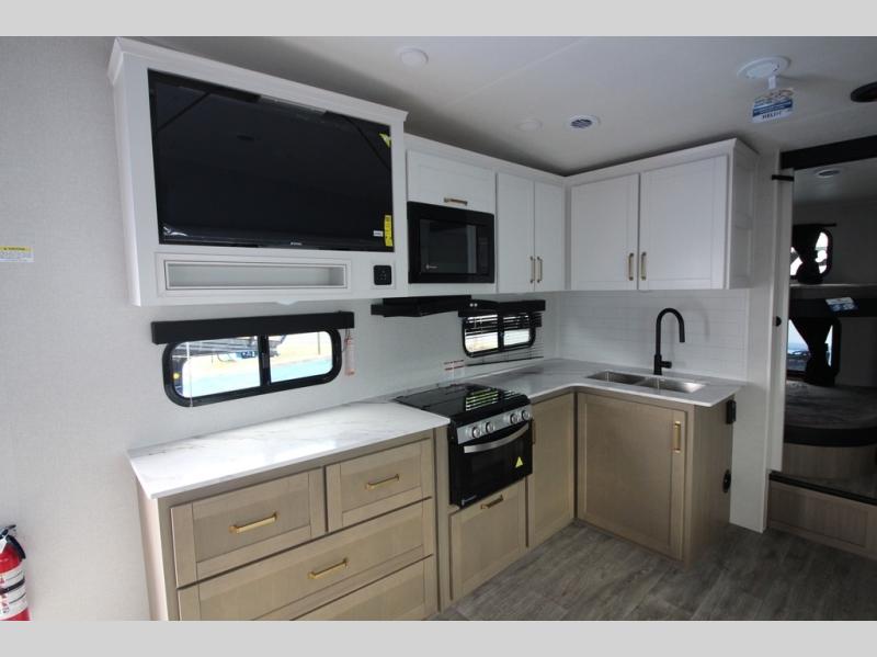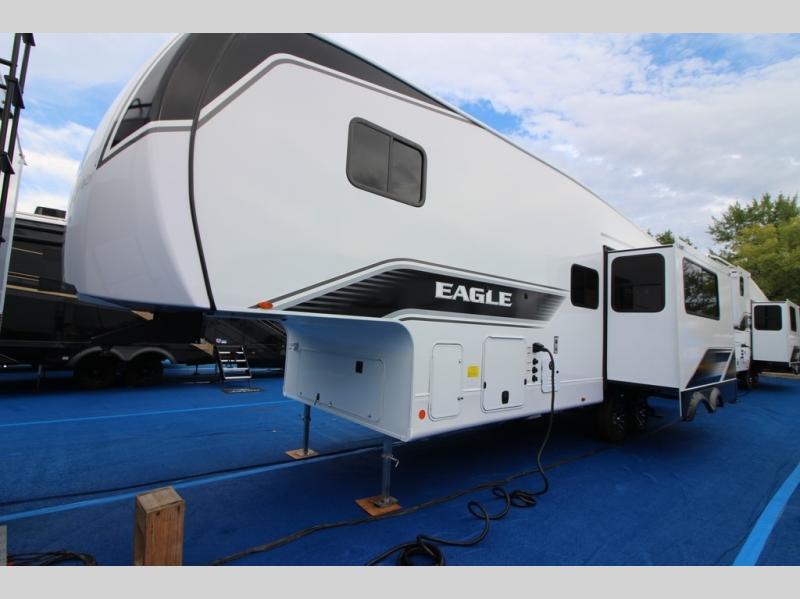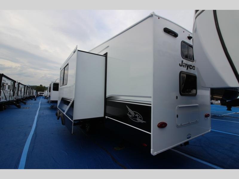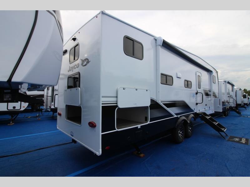 With any Eagle SLE fifth wheel by Jayco, you will enjoy a lighter tow weight, high-end finishes, and the same quality construction you've come to expect from Jayco! There is an Alpha Ply TPO roof membrane, a fully enclosed and heated underbelly, plus Stronghold VBL walls for added durability. There is also a rear 2" towing receiver outside, along with metal slam latch baggage doors, MORryde Step Above entry steps, and a Winegard Air 360 antenna with router prep if you want to stay connected as you camp. Once inside you'll enjoy the handcrafted door/drawer fronts, shower skylight, and residential vinyl flooring throughout with no carpet for an easier clean. The on-demand water heater, 30K BTU furnace, and 15K BTU "Whisper Quiet" A/C will ensure your comfort, and the Overland 1 Solar Package will provide off-grid capabilities!