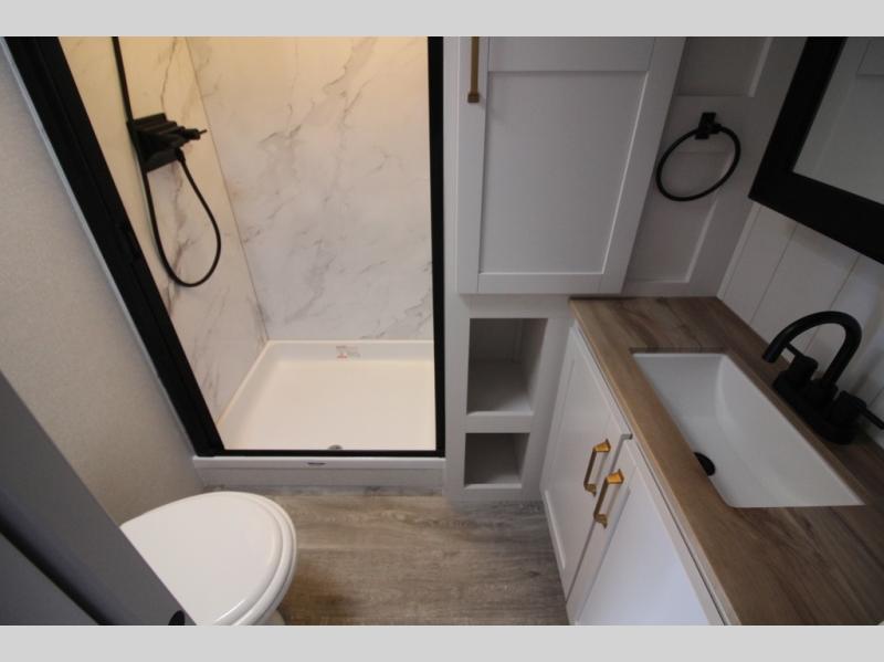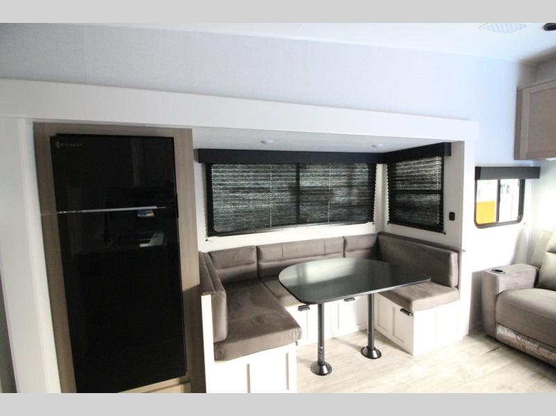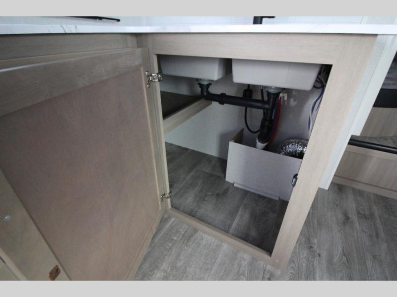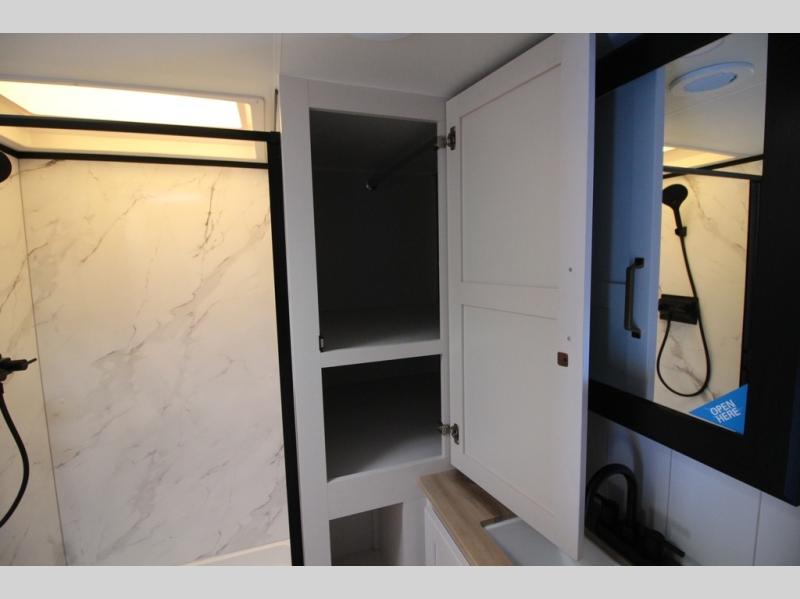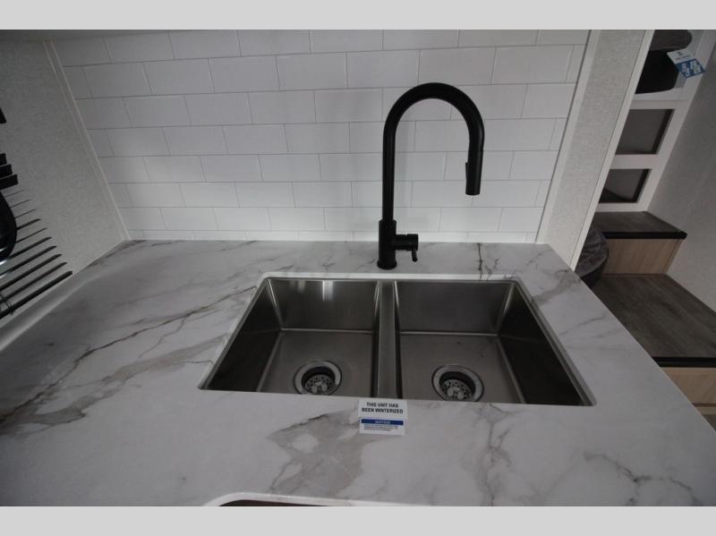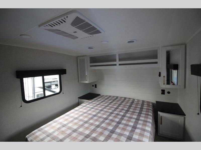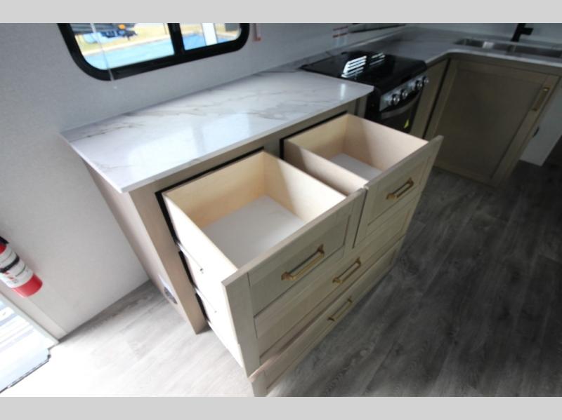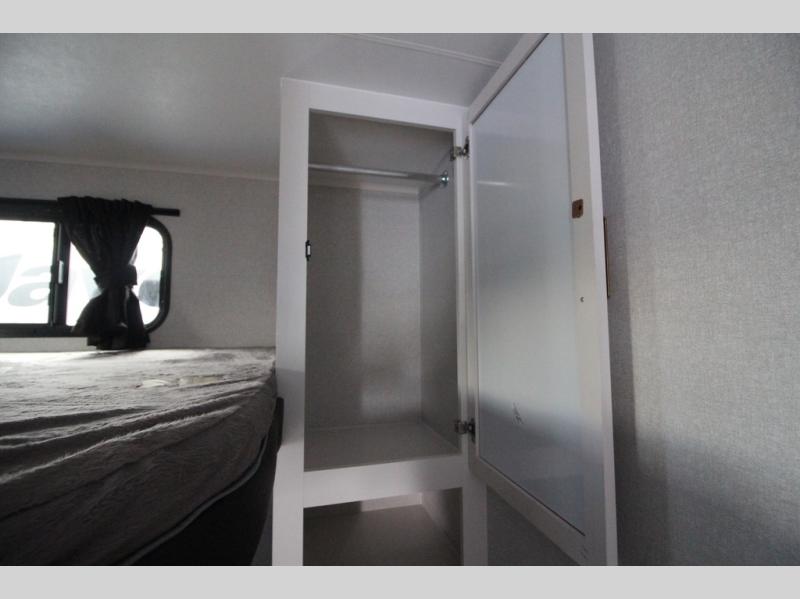 With any Eagle SLE fifth wheel by Jayco, you will enjoy a lighter tow weight, high-end finishes, and the same quality construction you've come to expect from Jayco! There is an Alpha Ply TPO roof membrane, a fully enclosed and heated underbelly, plus Stronghold VBL walls for added durability. There is also a rear 2" towing receiver outside, along with metal slam latch baggage doors, MORryde Step Above entry steps, and a Winegard Air 360 antenna with router prep if you want to stay connected as you camp. Once inside you'll enjoy the handcrafted door/drawer fronts, shower skylight, and residential vinyl flooring throughout with no carpet for an easier clean. The on-demand water heater, 30K BTU furnace, and 15K BTU "Whisper Quiet" A/C will ensure your comfort, and the Overland 1 Solar Package will provide off-grid capabilities!