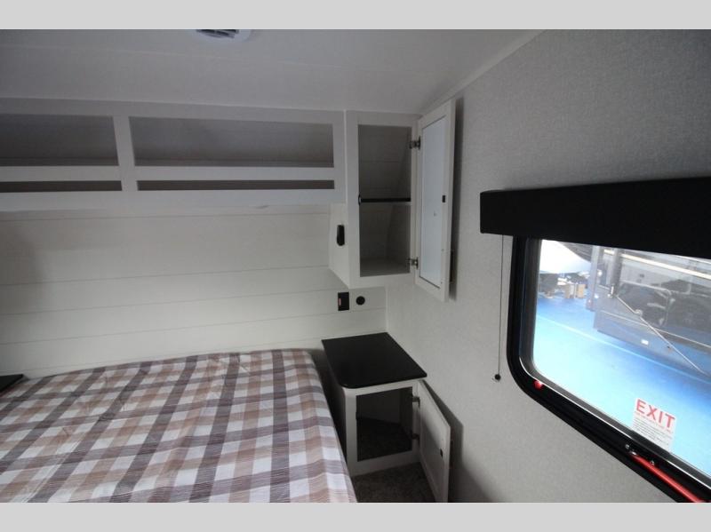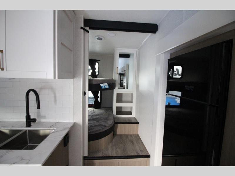 If you enjoy camping with a larger group, this fifth wheel is perfect for you! The rear bunkhouse includes double-size bunks, bunk storage and a wardrobe to keep this space tidy. You'll have the front private bedroom all to yourselves with a queen bed, and if you have any other guests, they can sleep on the tri-fold sofa and U-shaped dinette in the main living area. This space is also shared with the full kitchen, complete with a microwave and range, 12V refrigerator, and plenty of overhead cabinets for storage. After dinner, head outdoors to enjoy the 19' power awning with LED lights as you relax in your camp chairs!