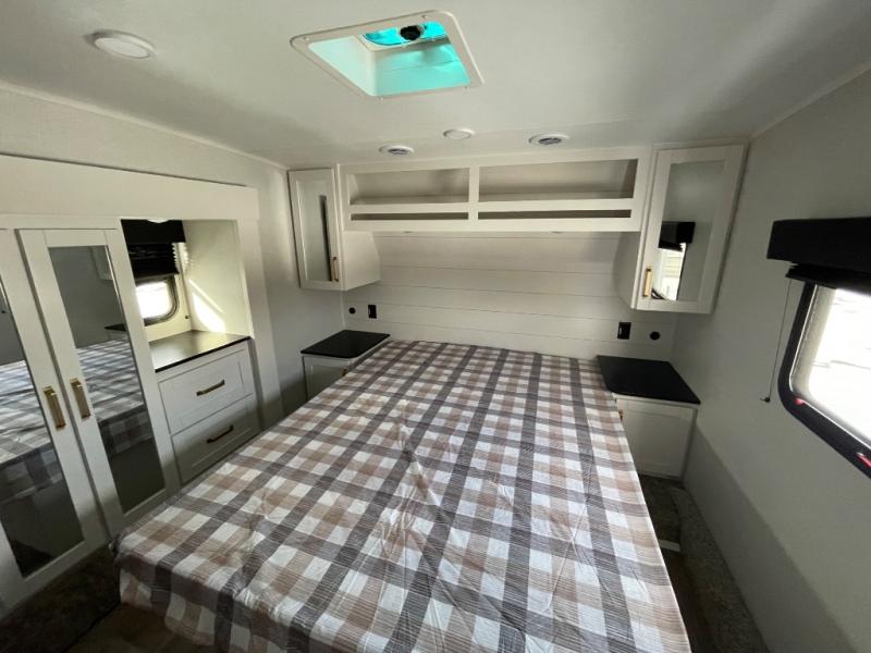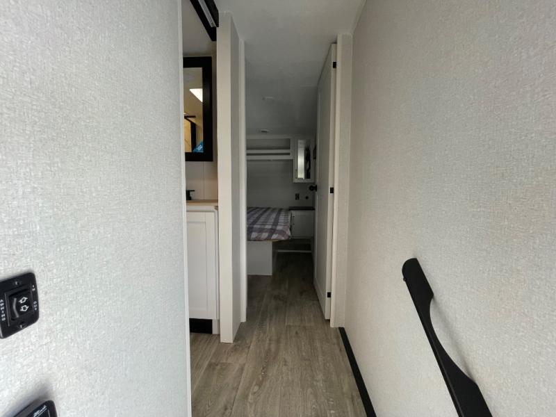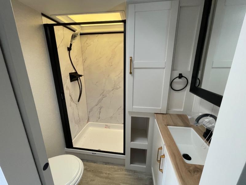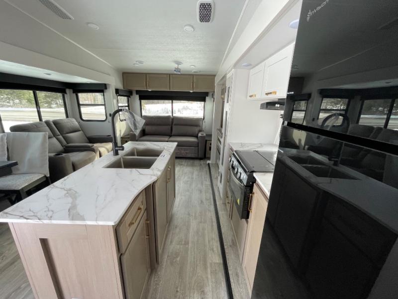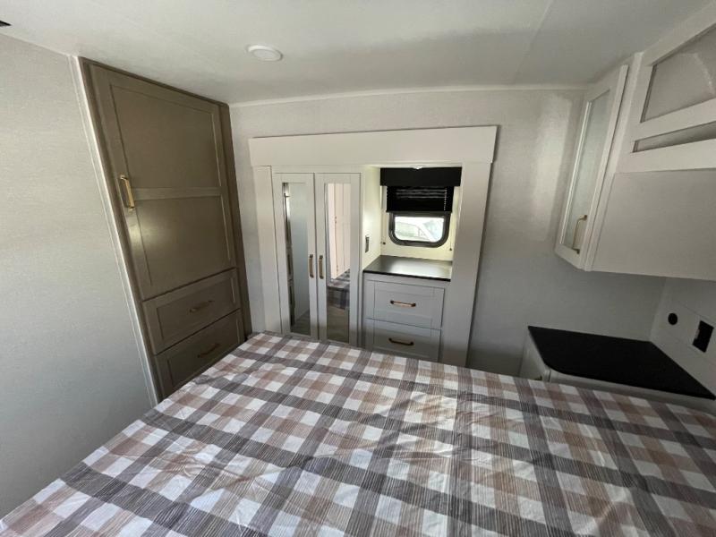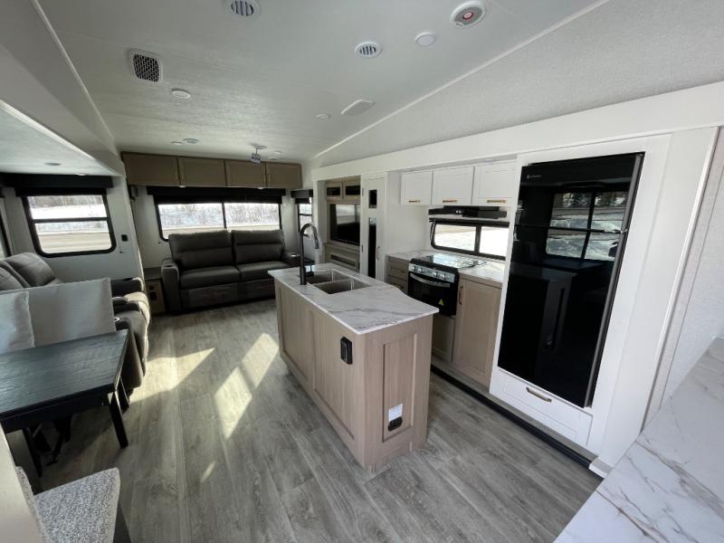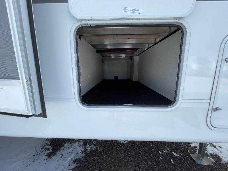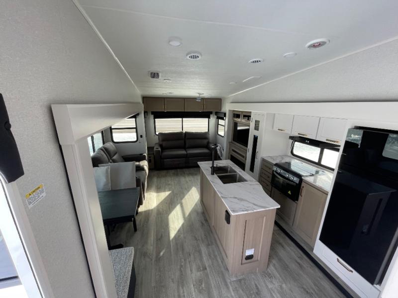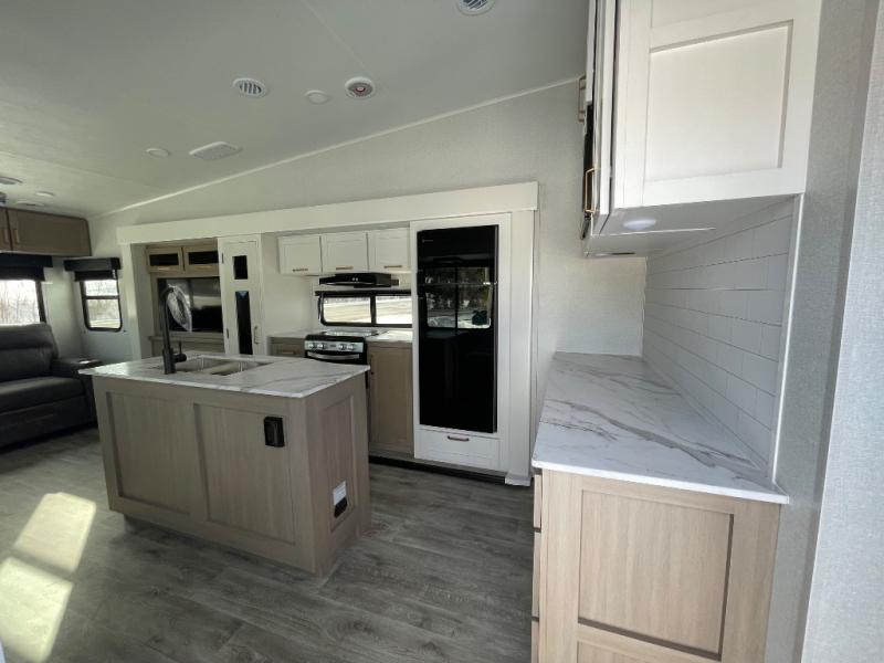 With any Eagle SLE fifth wheel by Jayco, you will enjoy a lighter tow weight, high-end finishes, and the same quality construction you've come to expect from Jayco! There is an Alpha Ply TPO roof membrane, a fully enclosed and heated underbelly, plus Stronghold VBL walls for added durability. There is also a rear 2" towing receiver outside, along with metal slam latch baggage doors, MORryde Step Above entry steps, and a Winegard Air 360 antenna with router prep if you want to stay connected as you camp. Once inside you'll enjoy the handcrafted door/drawer fronts, shower skylight, and residential vinyl flooring throughout with no carpet for an easier clean. The on-demand water heater, 30K BTU furnace, and 15K BTU "Whisper Quiet" A/C will ensure your comfort, and the Overland 1 Solar Package will provide off-grid capabilities!