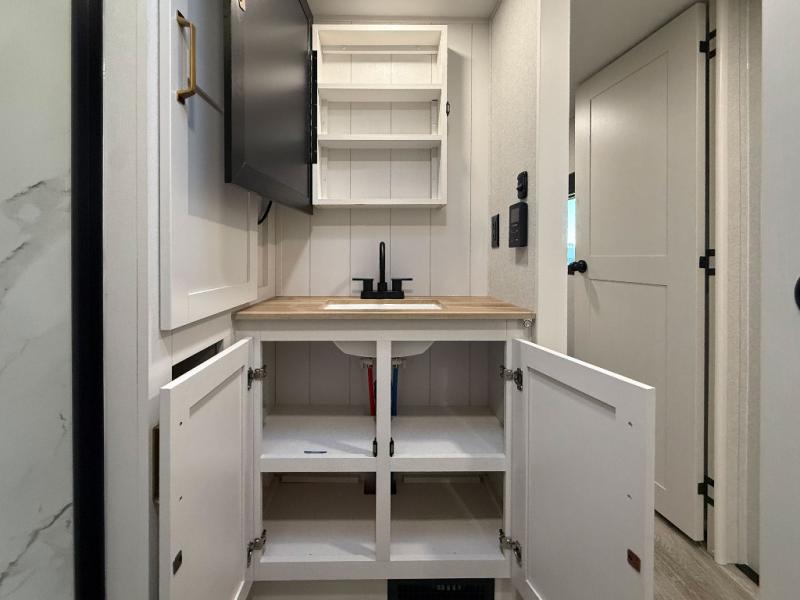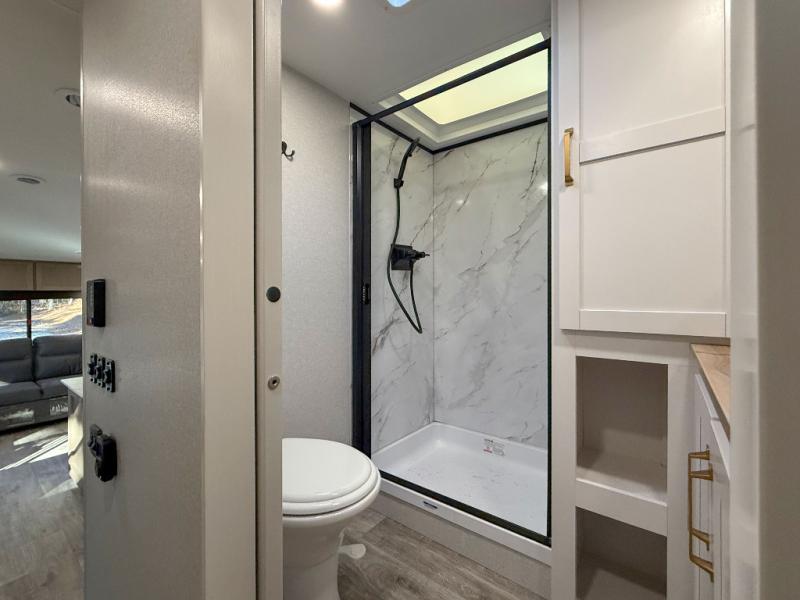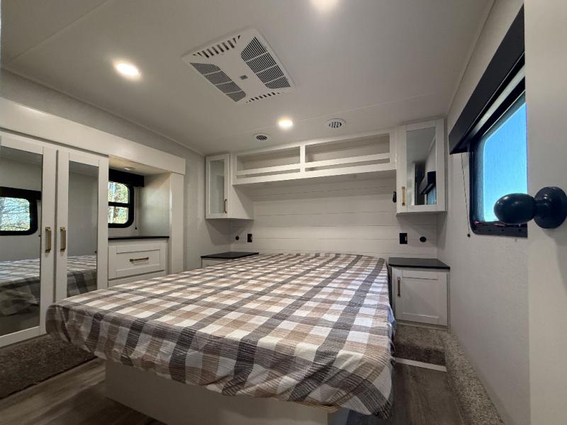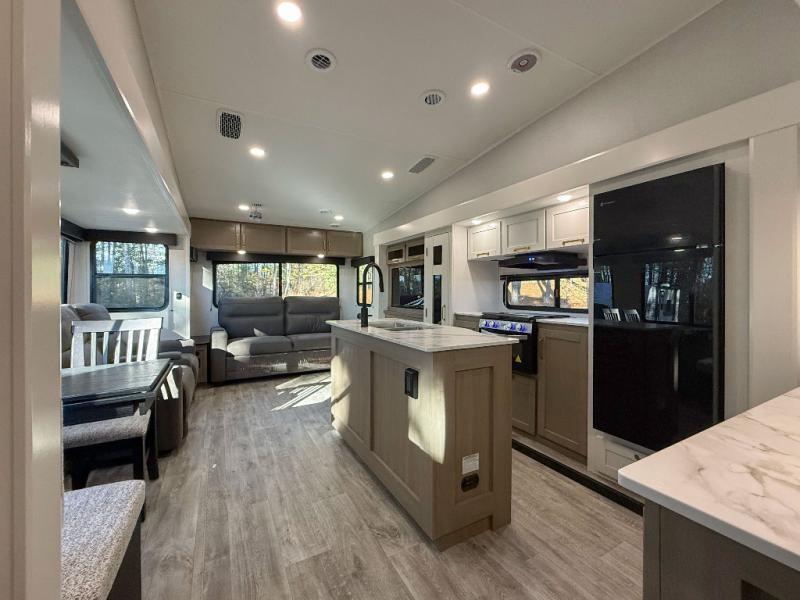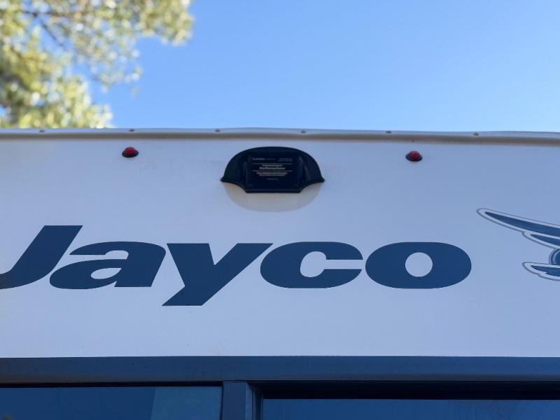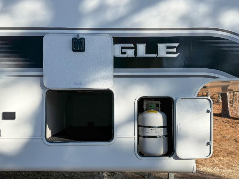 With any Eagle SLE fifth wheel by Jayco, you will enjoy a lighter tow weight, high-end finishes, and the same quality construction you've come to expect from Jayco! There is an Alpha Ply TPO roof membrane, a fully enclosed and heated underbelly, plus Stronghold VBL walls for added durability. There is also a rear 2" towing receiver outside, along with metal slam latch baggage doors, MORryde Step Above entry steps, and a Winegard Air 360 antenna with router prep if you want to stay connected as you camp. Once inside you'll enjoy the handcrafted door/drawer fronts, shower skylight, and residential vinyl flooring throughout with no carpet for an easier clean. The on-demand water heater, 30K BTU furnace, and 15K BTU "Whisper Quiet" A/C will ensure your comfort, and the Overland 1 Solar Package will provide off-grid capabilities!