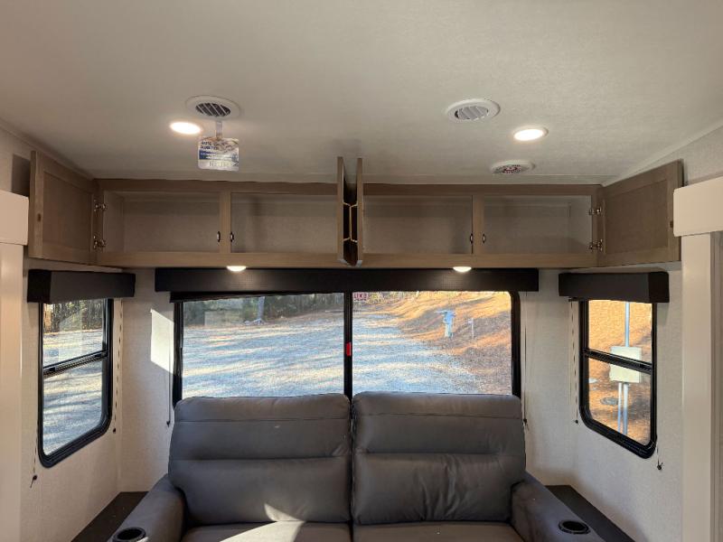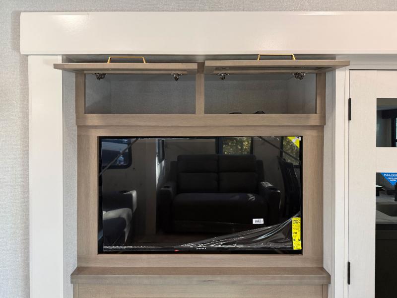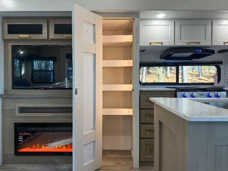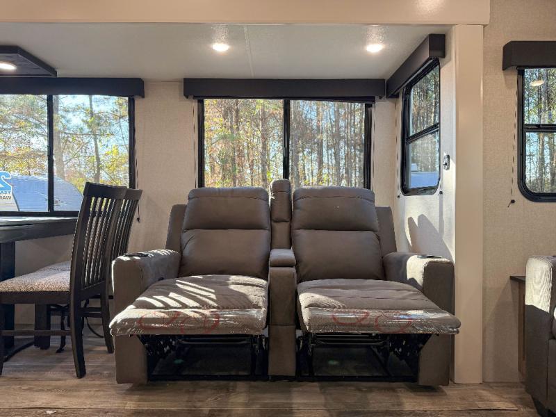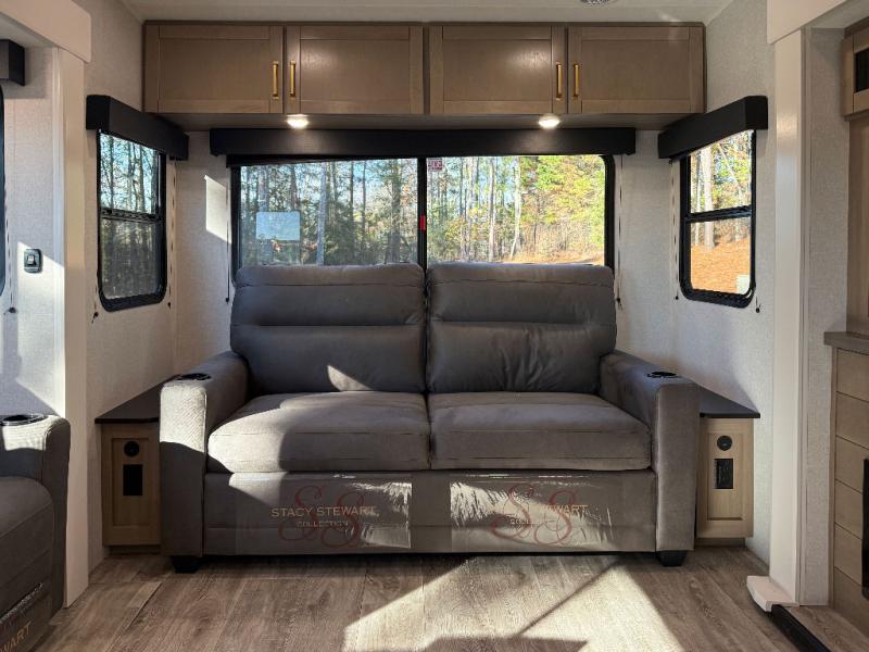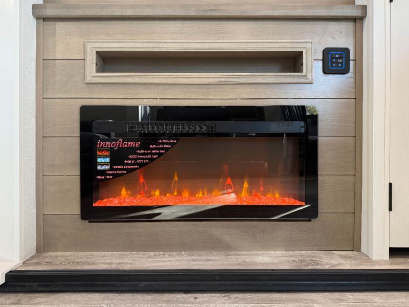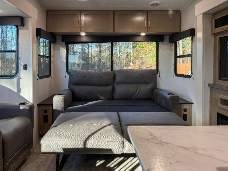 You can't go wrong when camping in this spacious fifth wheel! There are dual opposing slides in the living room, giving your crew plenty of space to prep dinner on the kitchen island, relax on the theater sofa, or dine at the booth dinette. There is also a rear tri-fold sofa where your guests can sleep! An entertainment center with a fireplace will make this space feel even more like home, and there are plenty of storage spaces for all your belongings. The full bath towards the front will let you freshen up each day, and the front private bedroom with a queen bed is sure to bring comfort. There are also dual nightstands, overhead cabinets, plus a wardrobe and dresser slide out, so everything has a place!