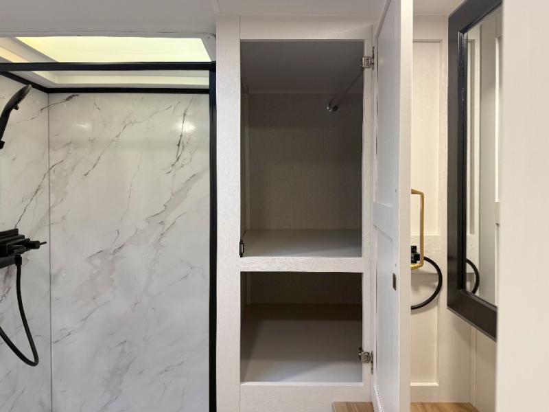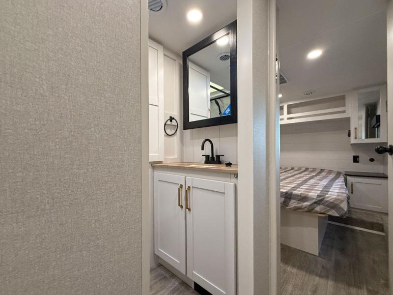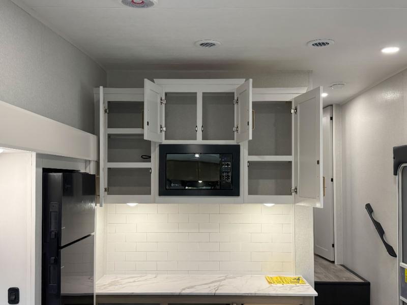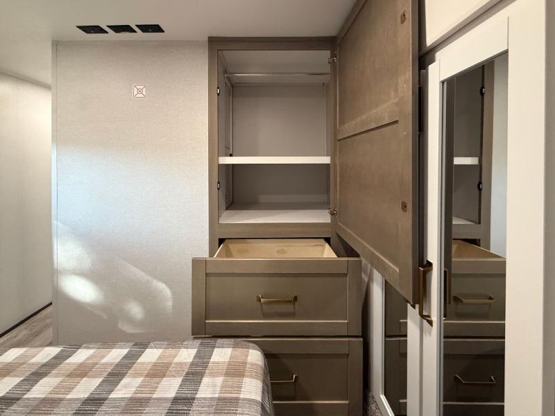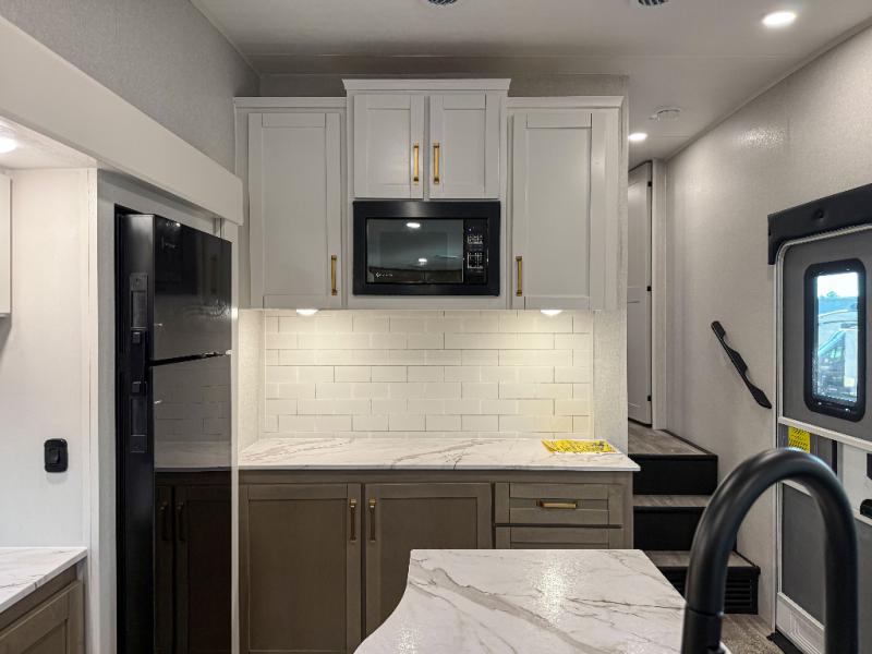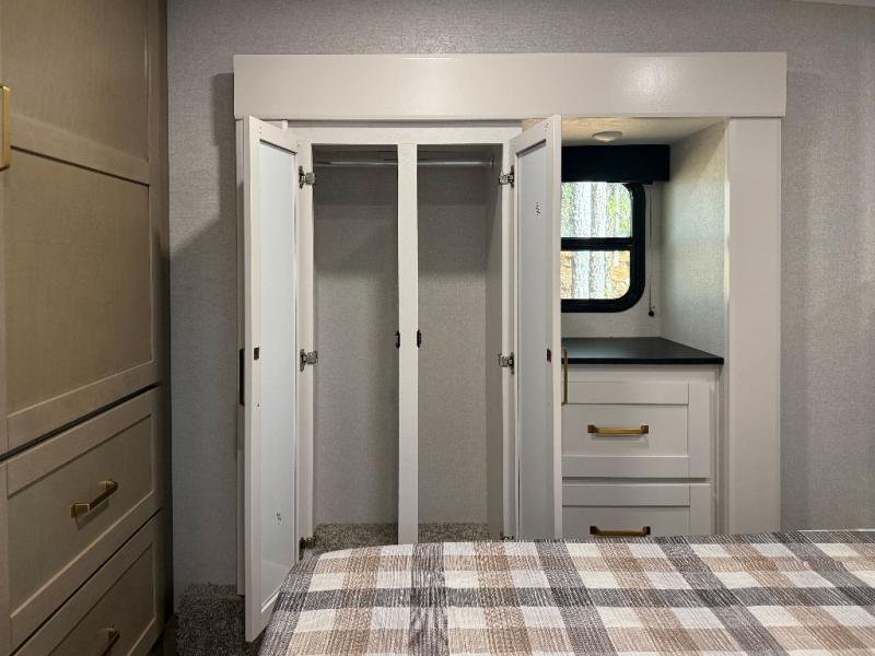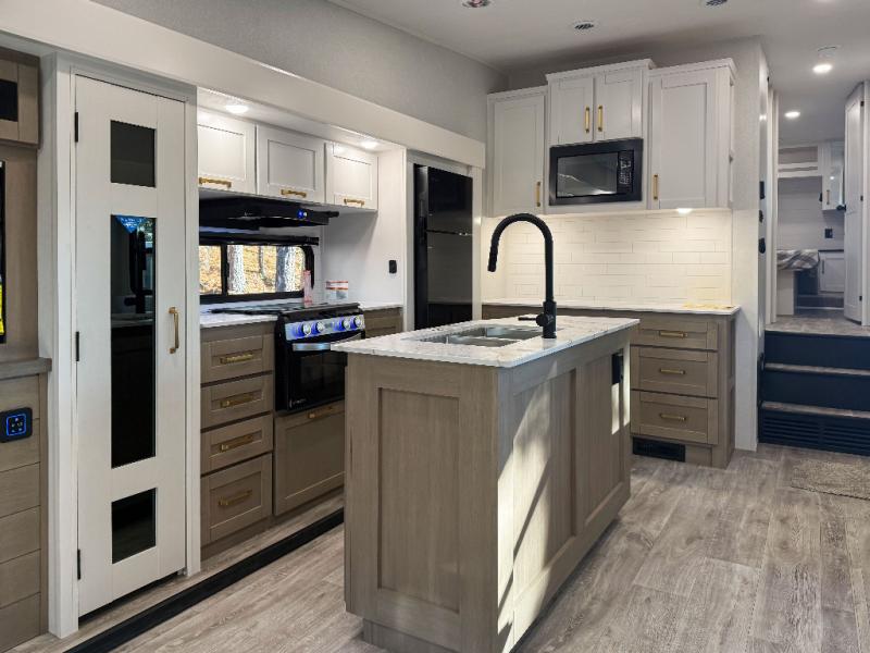 You can't go wrong when camping in this spacious fifth wheel! There are dual opposing slides in the living room, giving your crew plenty of space to prep dinner on the kitchen island, relax on the theater sofa, or dine at the booth dinette. There is also a rear tri-fold sofa where your guests can sleep! An entertainment center with a fireplace will make this space feel even more like home, and there are plenty of storage spaces for all your belongings. The full bath towards the front will let you freshen up each day, and the front private bedroom with a queen bed is sure to bring comfort. There are also dual nightstands, overhead cabinets, plus a wardrobe and dresser slide out, so everything has a place!