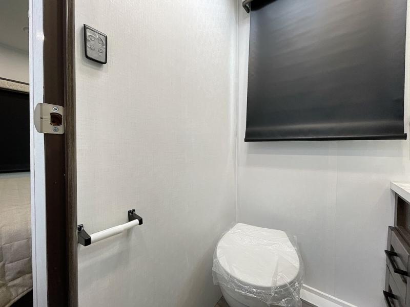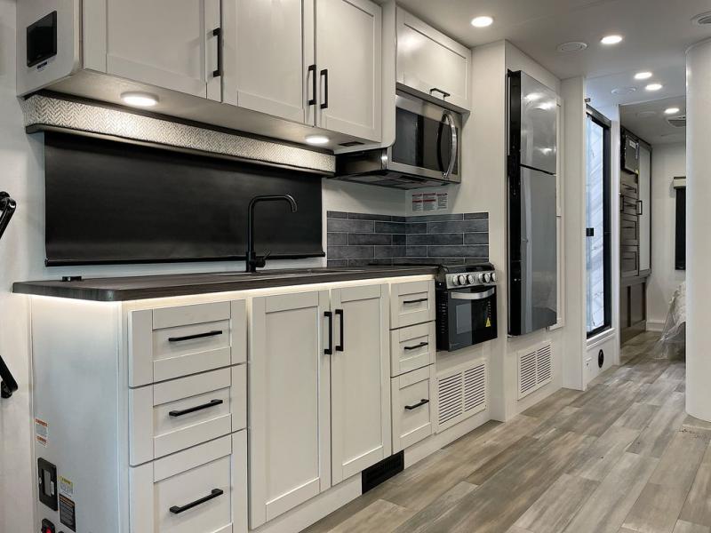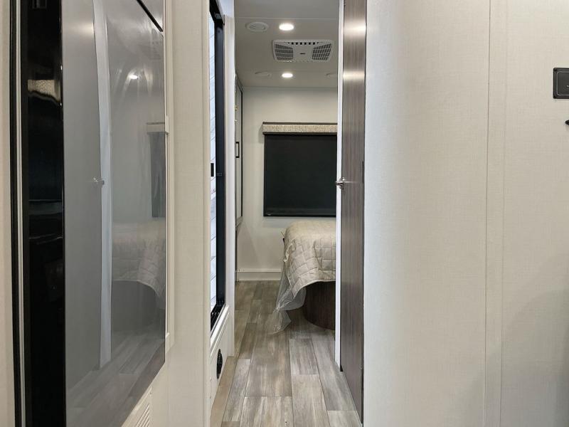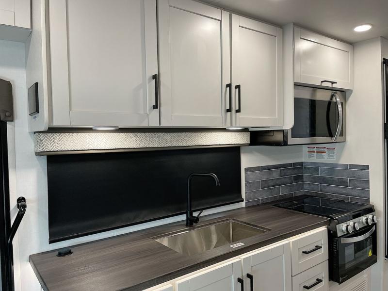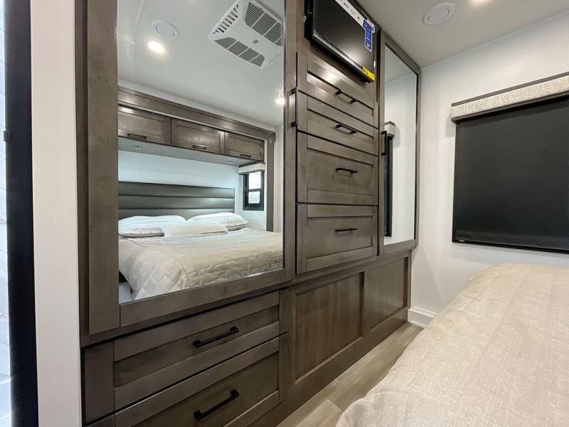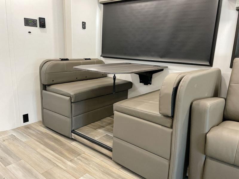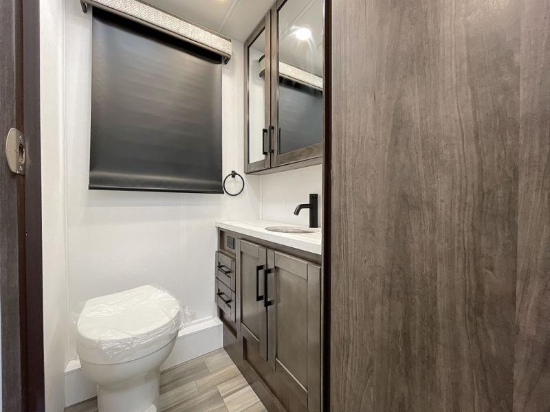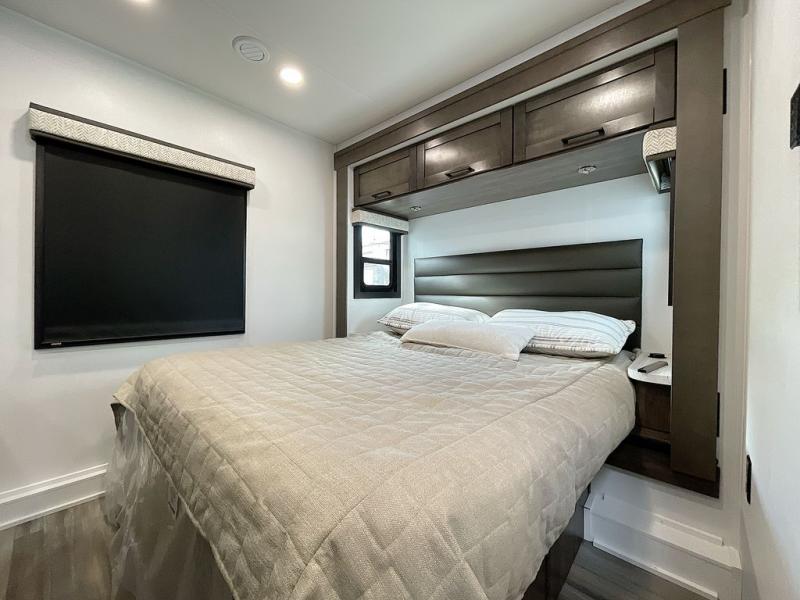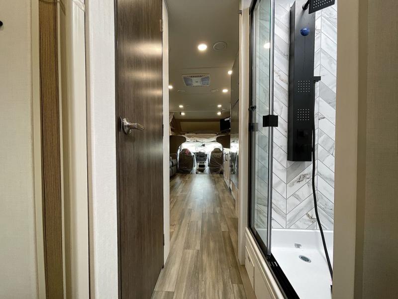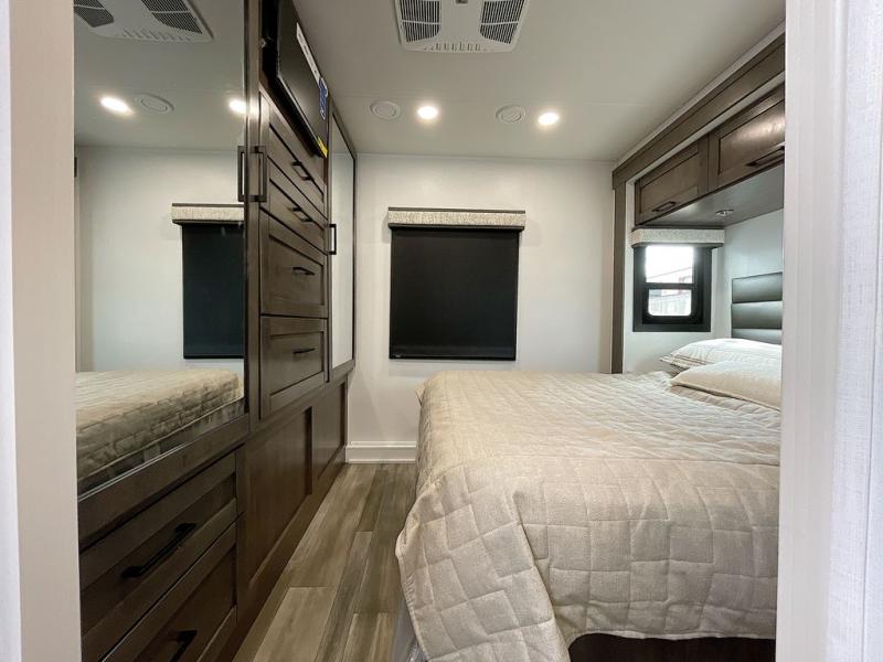 This motorhome includes double slides so you can enjoy more interior space, just like at home! The 42" x 70" booth dinette and 60" tri-fold sofa are in great view of the LED HD Smart TV, and your guests can sleep here, as well as on the cab-over bunk. This Greyhawk kitchen includes a Furrion all-in-one cooktop and oven, a residential-size microwave, and a pantry to store dry goods. You will find a convenient 30" x 36" shower, with the private toilet and sink across the hall so two people can freshen up at once. And don't overlook the rear bedroom with its queen bed slide out, dual bedroom wardrobes, and cabinet!