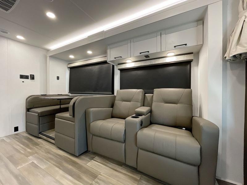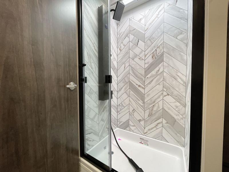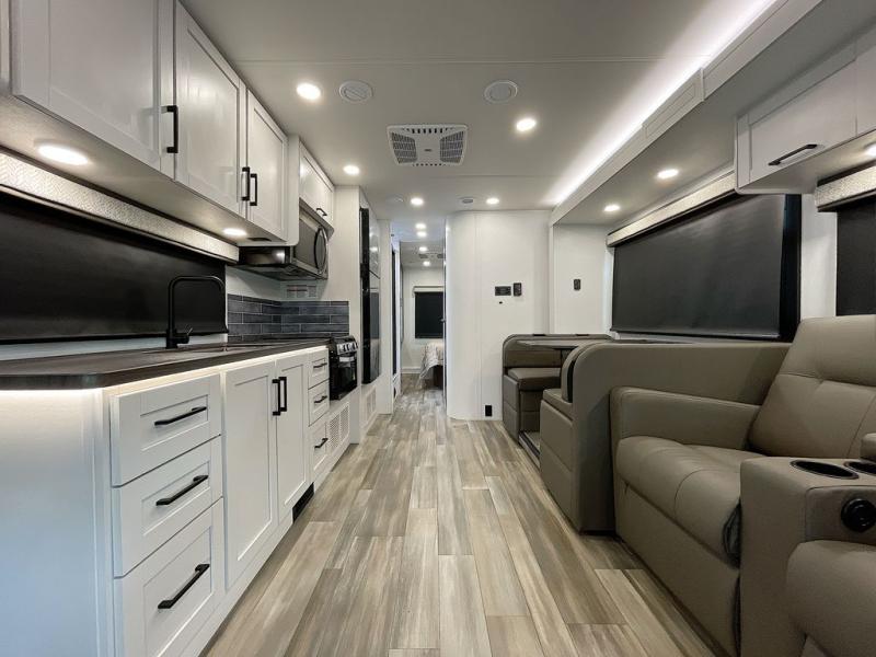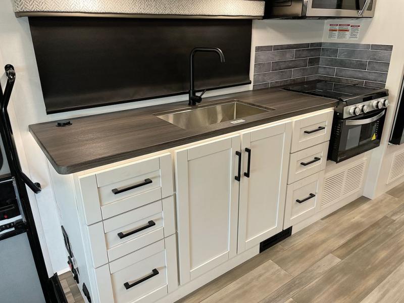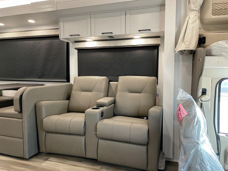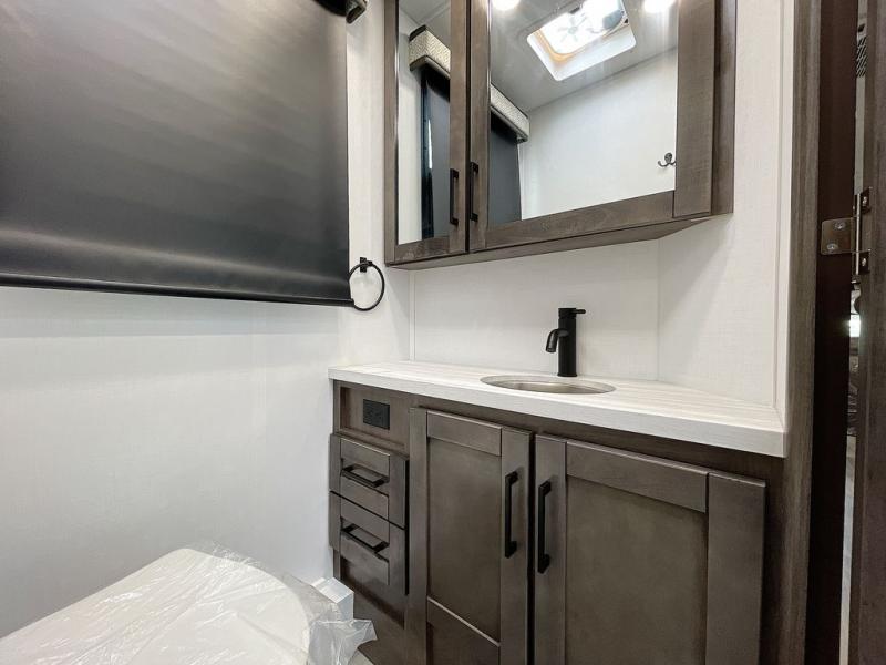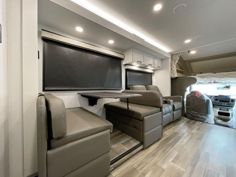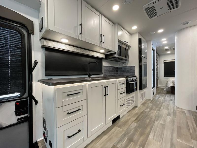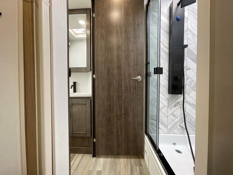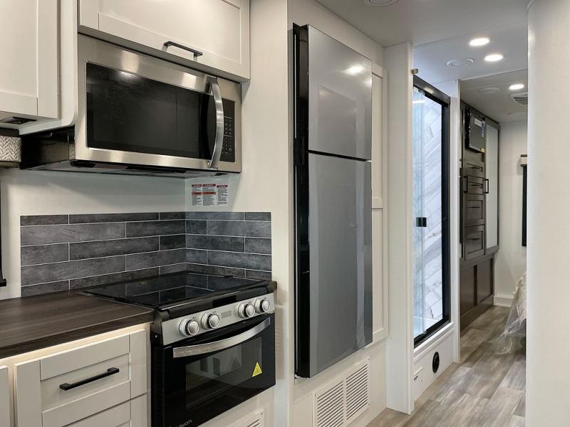 This motorhome includes double slides so you can enjoy more interior space, just like at home! The 42" x 70" booth dinette and 60" tri-fold sofa are in great view of the LED HD Smart TV, and your guests can sleep here, as well as on the cab-over bunk. This Greyhawk kitchen includes a Furrion all-in-one cooktop and oven, a residential-size microwave, and a pantry to store dry goods. You will find a convenient 30" x 36" shower, with the private toilet and sink across the hall so two people can freshen up at once. And don't overlook the rear bedroom with its queen bed slide out, dual bedroom wardrobes, and cabinet!