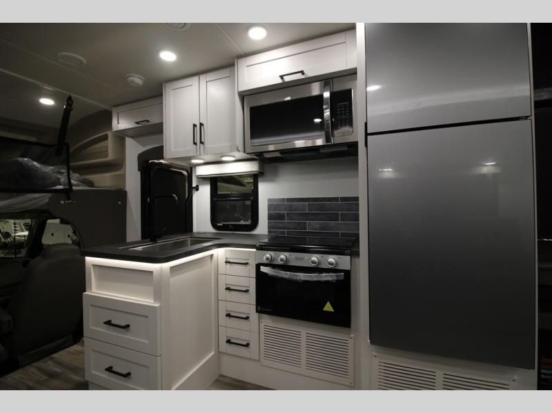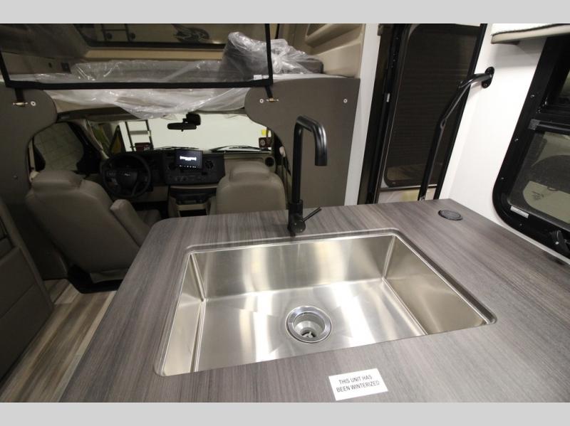 With any Greyhawk Class C gas motorhome by Jayco you will experience smooth sailing thanks to the JRIDE PLUS that comes with Koni shock absorbers, a computer-balanced driveshaft, Hellwig helper springs, and more. The Ford E-450 chassis with a 7.3L V8 325 HP engine will power your excursions, and you'll appreciate the added safety features for your peace of mind. Each model features a Sony infotainment center with Apple CarPlay and Android Auto, backup and side-view cameras, and a tire pressure monitor system the driver is sure to appreciate. Durable construction begins with Stronghold VBL roof, floor and sidewalls, bead-foam insulation, and a one-piece seamless fiberglass front cap. Head inside to find blackout night roller shades, LED-lit pressed countertops, an 84" interior ceiling height, and hardwood cabinet doors and drawers.