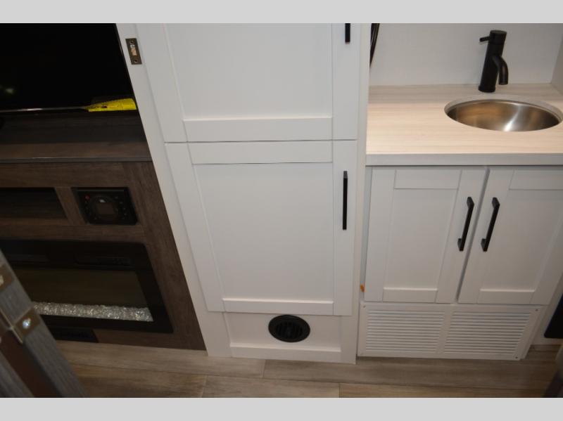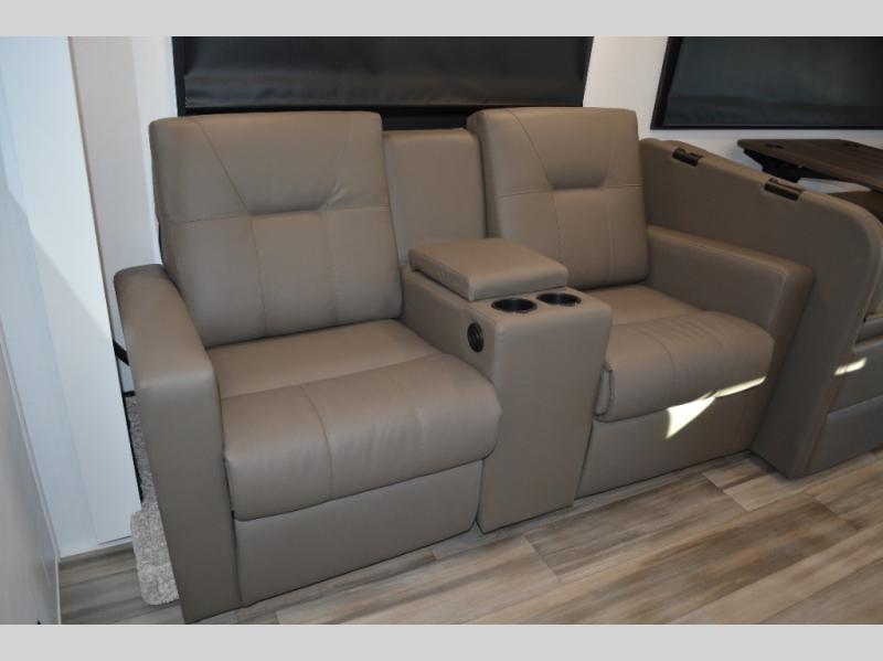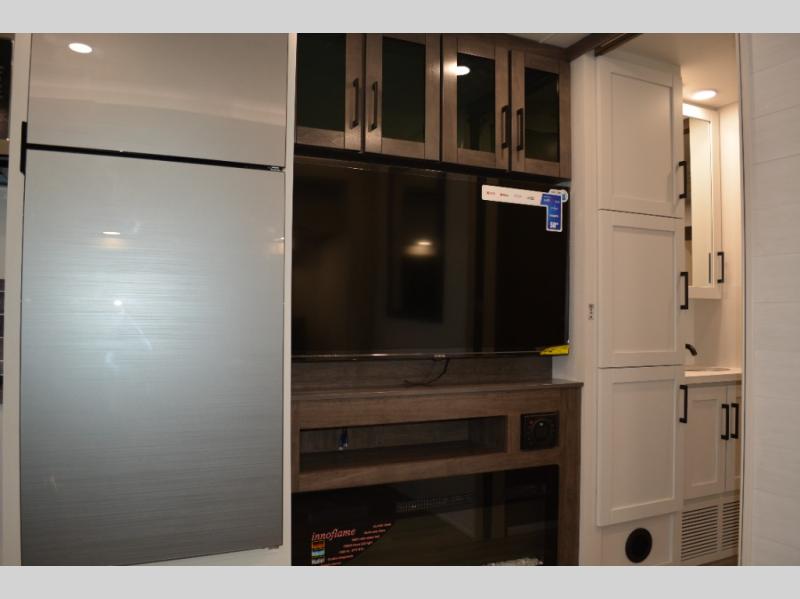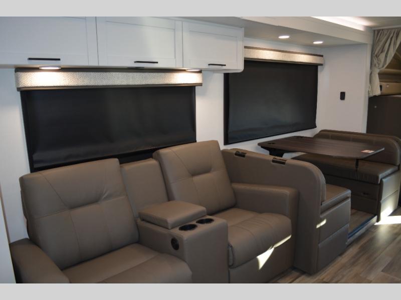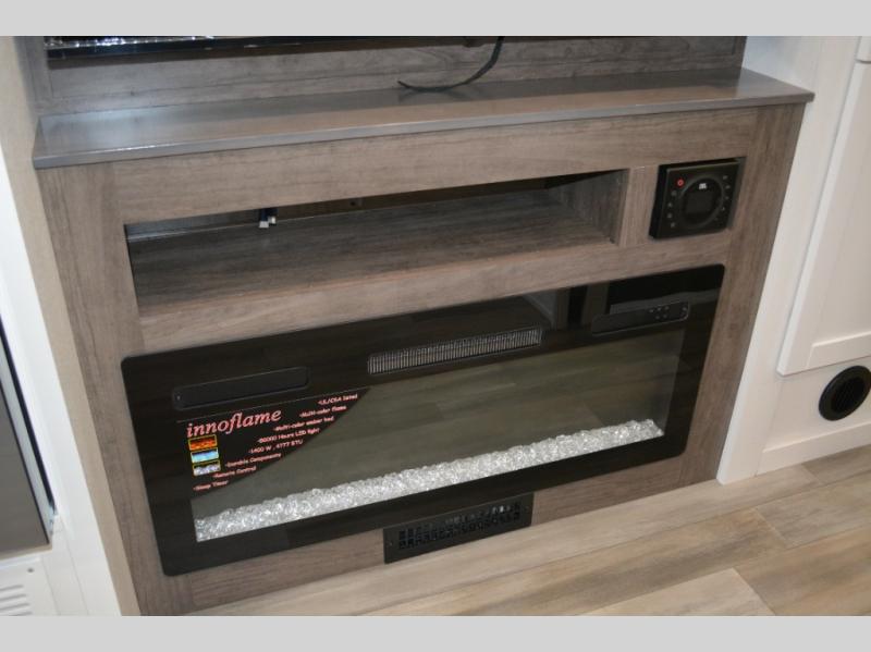 Pack your bags and head to your favorite camping spot in this spacious motorhome for six to seven. The little ones will love the cab-over bunk, and you'll have your own private bedroom in the back. There is also 72" theater seating and a 42" x 70" booth dinette that will serve as seating and sleeping space as well. This model will feel more like home with its fireplace, entertainment center with a 50" TV, and spacious living area. There is also a private toilet and shower, with the sink across the hall for convenience.
