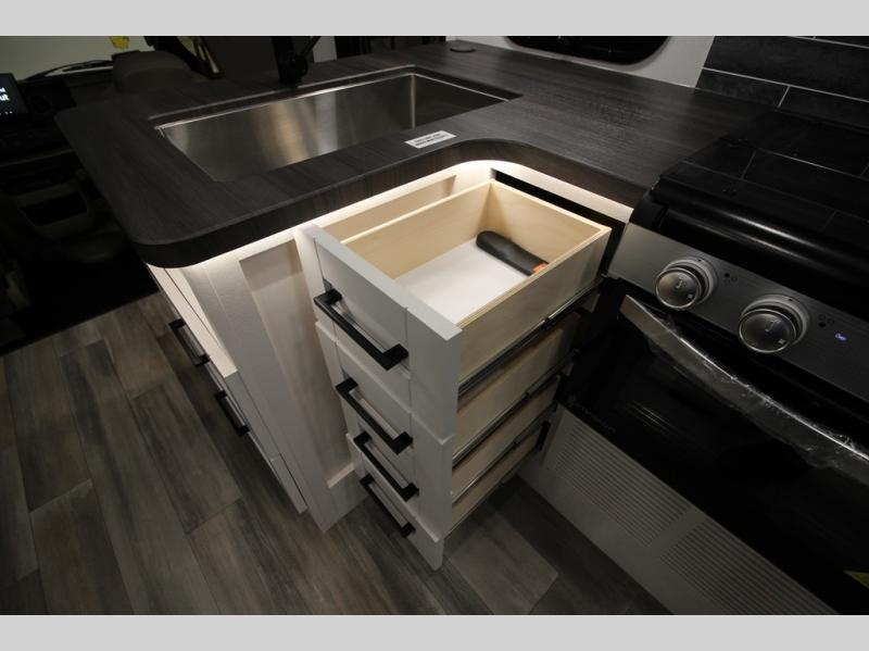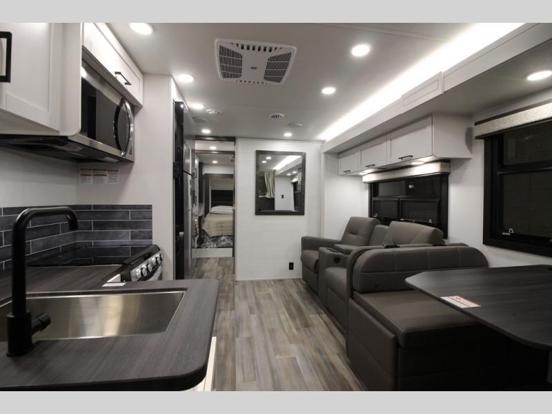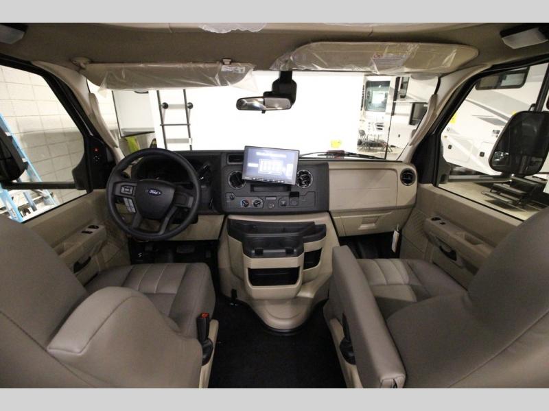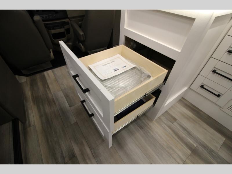With any Greyhawk Class C gas motorhome by Jayco you will experience smooth sailing thanks to the JRIDE PLUS that comes with Koni shock absorbers, a computer-balanced driveshaft, Hellwig helper springs, and more. The Ford E-450 chassis with a 7.3L V8 325 HP engine will power your excursions, and you'll appreciate the added safety features for your peace of mind. Each model features a Sony infotainment center with Apple CarPlay and Android Auto, backup and side-view cameras, and a tire pressure monitor system the driver is sure to appreciate. Durable construction begins with Stronghold VBL roof, floor and sidewalls, bead-foam insulation, and a one-piece seamless fiberglass front cap. Head inside to find blackout night roller shades, LED-lit pressed countertops, an 84" interior ceiling height, and hardwood cabinet doors and drawers.