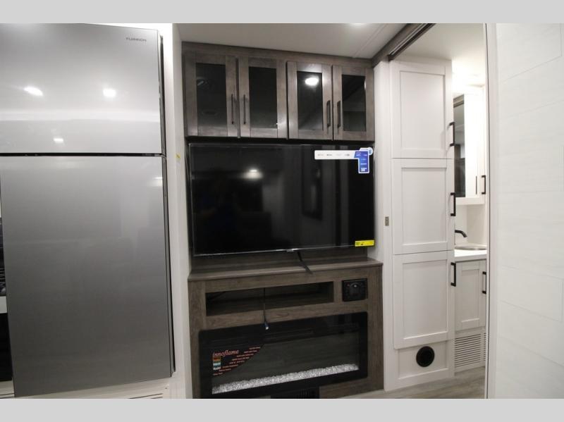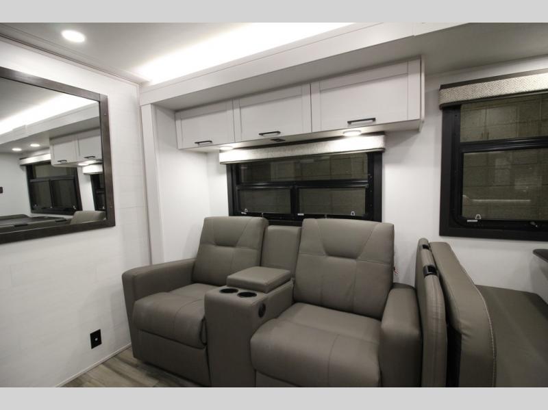 Pack your bags and head to your favorite camping spot in this spacious motorhome for six to seven. The little ones will love the cab-over bunk, and you'll have your own private bedroom in the back. There is also 72" theater seating and a 42" x 70" booth dinette that will serve as seating and sleeping space as well. This model will feel more like home with its fireplace, entertainment center with a 50" TV, and spacious living area. There is also a private toilet and shower, with the sink across the hall for convenience.