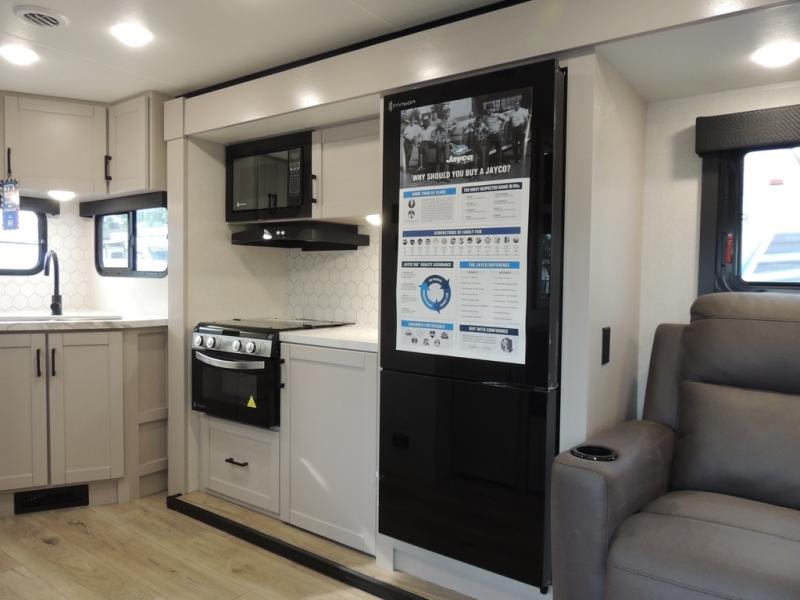 With any Jay Feather travel trailer by Jayco, you will enjoy lightweight towing, convenient exterior amenities, and at-home comforts inside! The Overlander 1 Solar Package included within the Jay Sport Package comes with a 200W solar panel and a 30-amp digital controller so you can enjoy some off-grid camping. There is also a modern graphics package, Solid fold-down step with aluminum tread steps on the main entry doorstep, and Climate Shield 0 -100° F tested weather insulation package that will allow you to camp in various types of climates. The Customer Value Package will make time outdoors easier than ever with a power tongue jack and Automotive-style aluminum rims, plus radial tires with self-adjusting electric brakes. More exterior features include a Keyed-Alike doors, a Magnum Truss roof system, and the list goes on! And we haven't even touched on the interior comforts, like the seamless countertops and Residential vinyl flooring throughout, decorative kitchen backsplash, handcrafted hardwood door/drawer fronts, and multiple USB charging ports to keep you going!