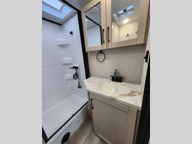 With any Jay Feather travel trailer by Jayco, you will enjoy lightweight towing, convenient exterior amenities, and at-home comforts inside! The Overlander 1 Solar Package included within the Jay Sport Package comes with a 200W solar panel and a 30-amp digital controller so you can enjoy some off-grid camping. There is also a modern graphics package, Solid fold-down step with aluminum tread steps on the main entry doorstep, and Climate Shield 0 -100° F tested weather insulation package that will allow you to camp in various types of climates. The Customer Value Package will make time outdoors easier than ever with a power tongue jack and Automotive-style aluminum rims, plus radial tires with self-adjusting electric brakes. More exterior features include a Keyed-Alike doors, a Magnum Truss roof system, and the list goes on! And we haven't even touched on the interior comforts, like the seamless countertops and Residential vinyl flooring throughout, decorative kitchen backsplash, handcrafted hardwood door/drawer fronts, and multiple USB charging ports to keep you going!