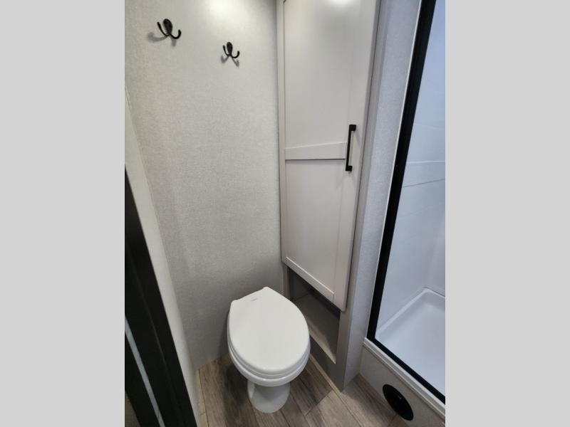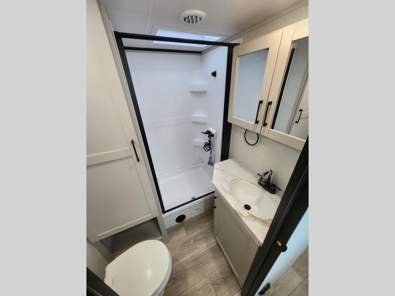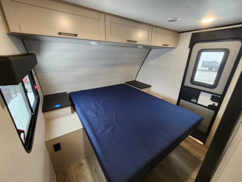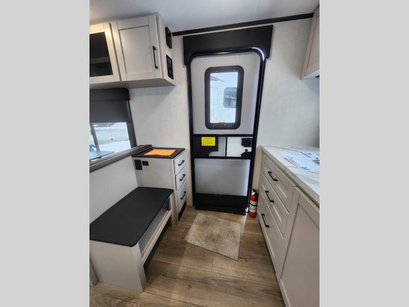 The chef of your group will love this rear kitchen trailer with generous counter space to prep meals! Your crew can dine at the booth dinette or under the 20' power awning with LED lights, and when you're ready to relax, the theater seat will provide comfort. There is also a storage cabinet with a bench that will allow you to utilize this space however you need it! The spacious full bath will let you clean up each day, and the front private bedroom is sure to make you feel at home. Here, you'll find a queen bed, three wardrobes, plus one of the dual entry doors for added convenience!