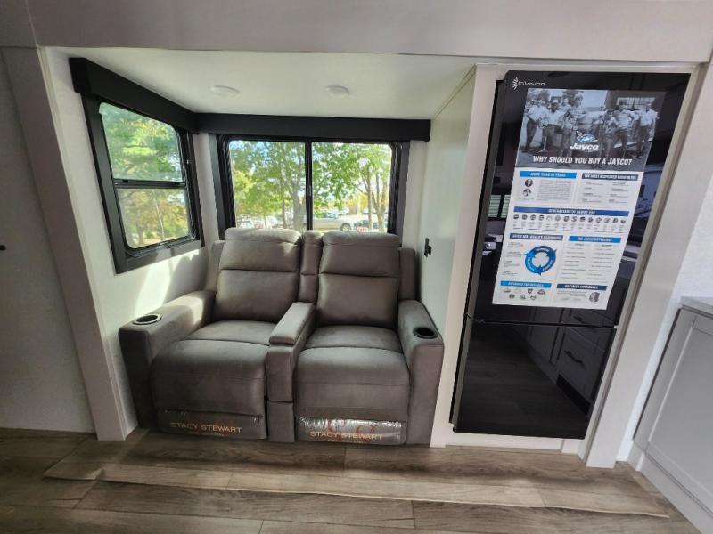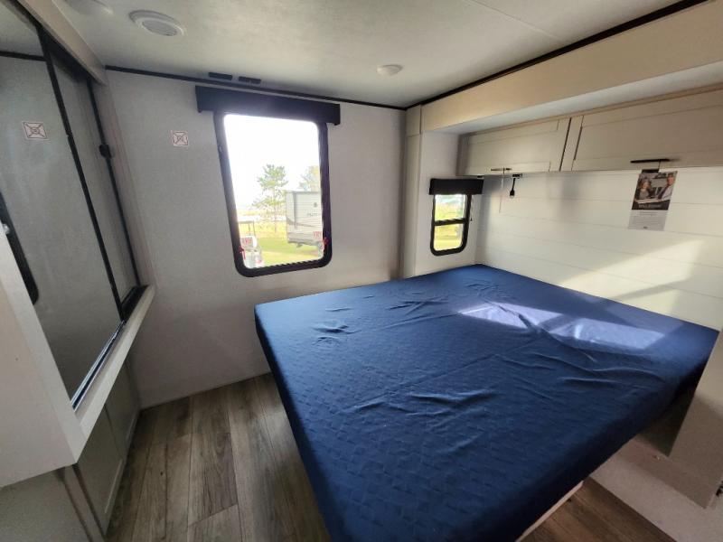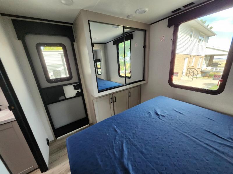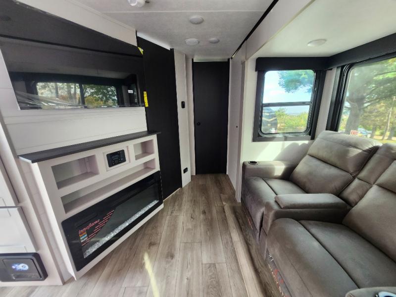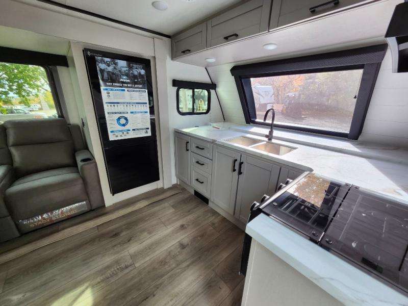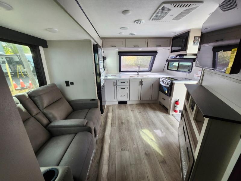 Step inside this spacious travel trailer through the front entry and you find the front kitchen that spans the width of the unit, providing plenty of counter space for meal prep. The kitchen is fully equipped with a stainless-steel sink, a decorative backsplash, a 3-burner cooktop, and an 11-cu. ft. 12V refrigerator, perfect for storing all your groceries. Overhead shelves offer convenient storage, and a pantry adds extra space for essentials. Next to the kitchen, you’ll find 60" theater seating, ideal for enjoying meals or watching your favorite shows on the LED Smart TV. As you move down the hall, you’ll come to a full bathroom featuring a radius shower and two entry doors for easy access. At the rear of the trailer, the comfortable bedroom features a 60" x 80" Queen bed, a sliding mirror door closet for added storage, and a second entry door to the exterior.
