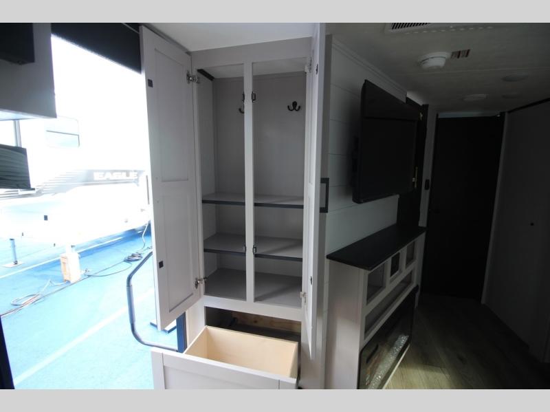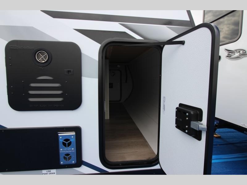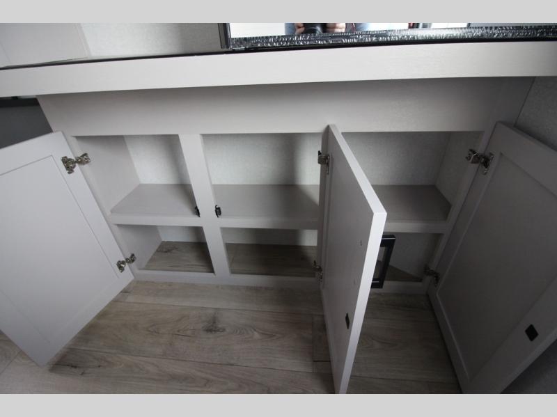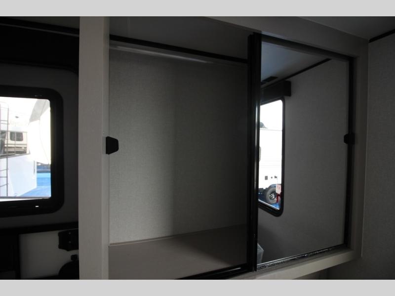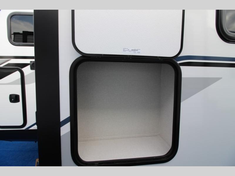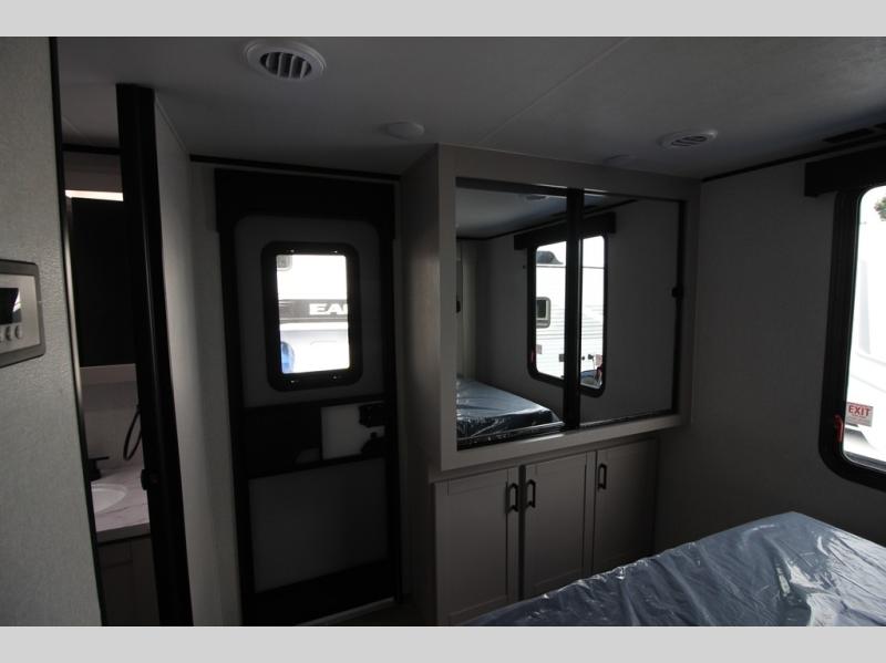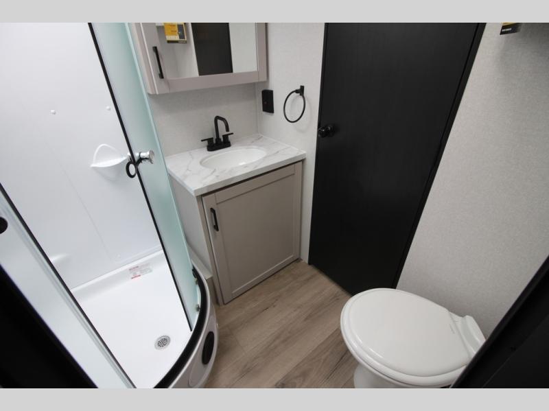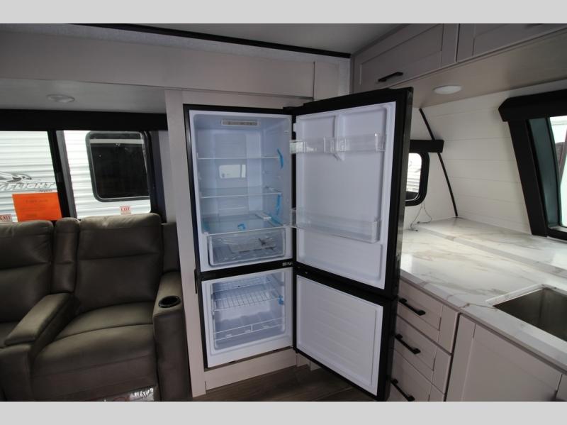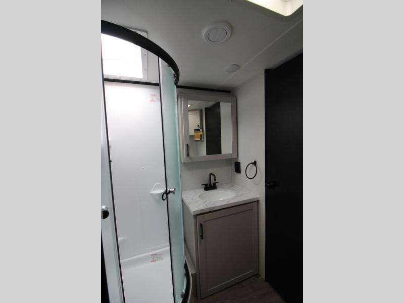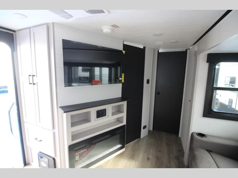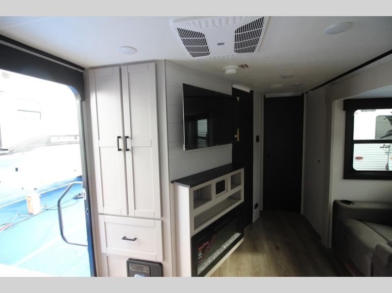 Step inside this spacious travel trailer through the front entry and you find the front kitchen that spans the width of the unit, providing plenty of counter space for meal prep. The kitchen is fully equipped with a stainless-steel sink, a decorative backsplash, a 3-burner cooktop, and an 11-cu. ft. 12V refrigerator, perfect for storing all your groceries. Overhead shelves offer convenient storage, and a pantry adds extra space for essentials. Next to the kitchen, you’ll find 60" theater seating, ideal for enjoying meals or watching your favorite shows on the LED Smart TV. As you move down the hall, you’ll come to a full bathroom featuring a radius shower and two entry doors for easy access. At the rear of the trailer, the comfortable bedroom features a 60" x 80" Queen bed, a sliding mirror door closet for added storage, and a second entry door to the exterior.