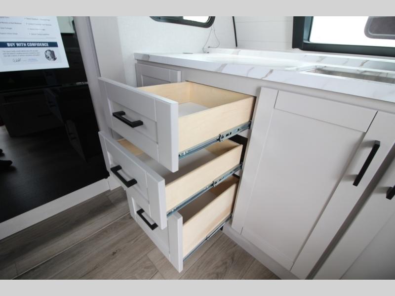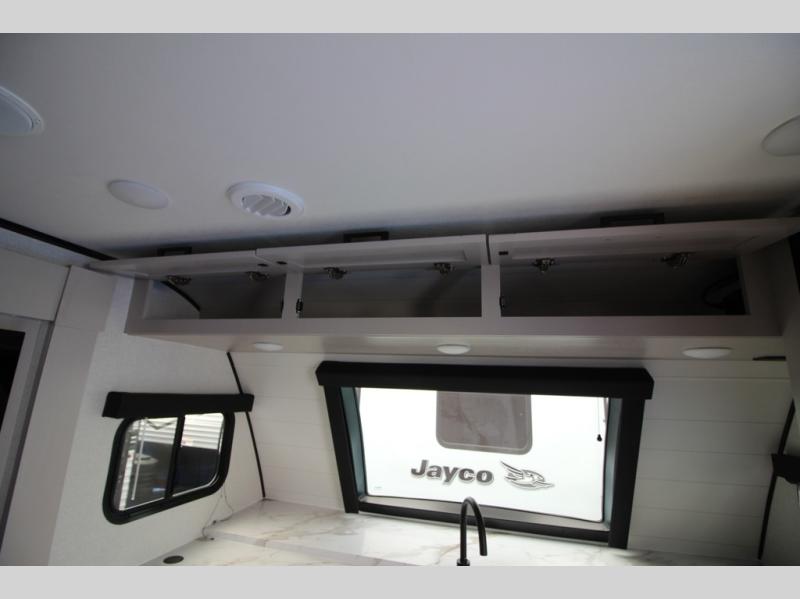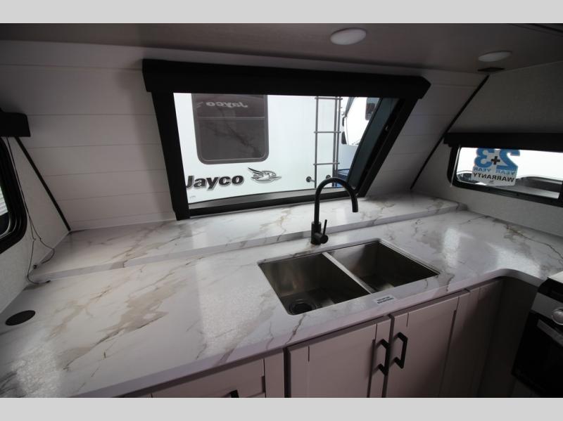 With any Jay Feather travel trailer by Jayco, you will enjoy lightweight towing, convenient exterior amenities, and at-home comforts inside! The Overlander 1 Solar Package included within the Jay Sport Package comes with a 200W solar panel and a 30-amp digital controller so you can enjoy some off-grid camping. There is also a modern graphics package, Solid fold-down step with aluminum tread steps on the main entry doorstep, and Climate Shield 0 -100° F tested weather insulation package that will allow you to camp in various types of climates. The Customer Value Package will make time outdoors easier than ever with a power tongue jack and Automotive-style aluminum rims, plus radial tires with self-adjusting electric brakes. More exterior features include a Keyed-Alike doors, a Magnum Truss roof system, and the list goes on! And we haven't even touched on the interior comforts, like the seamless countertops and Residential vinyl flooring throughout, decorative kitchen backsplash, handcrafted hardwood door/drawer fronts, and multiple USB charging ports to keep you going!