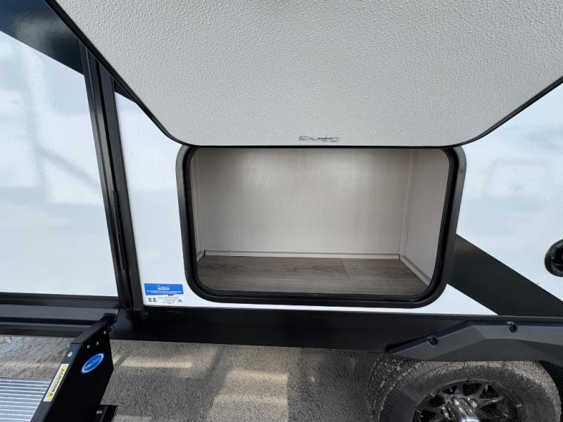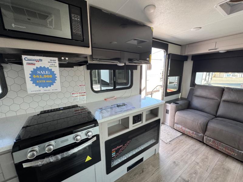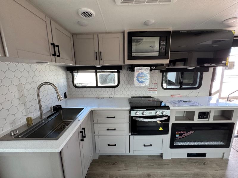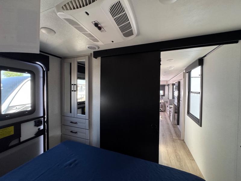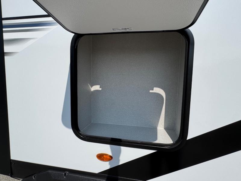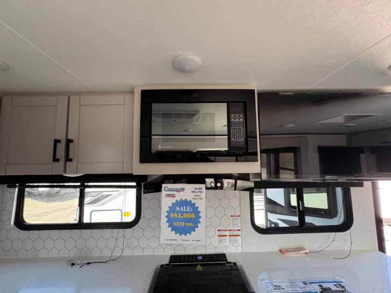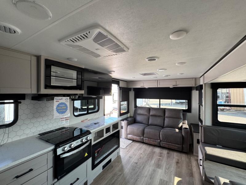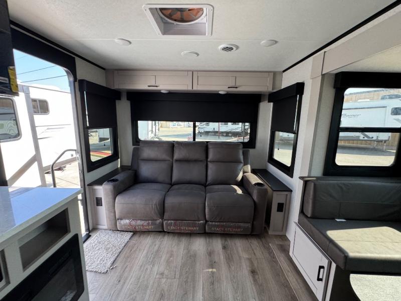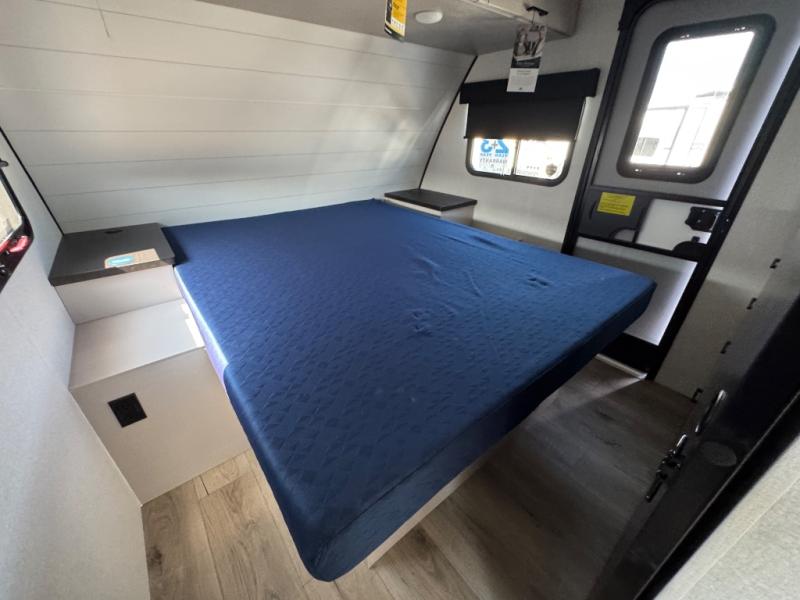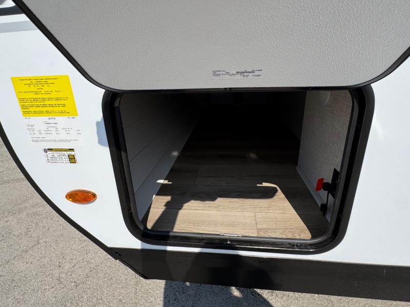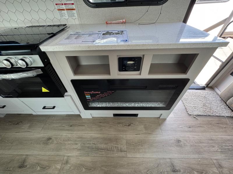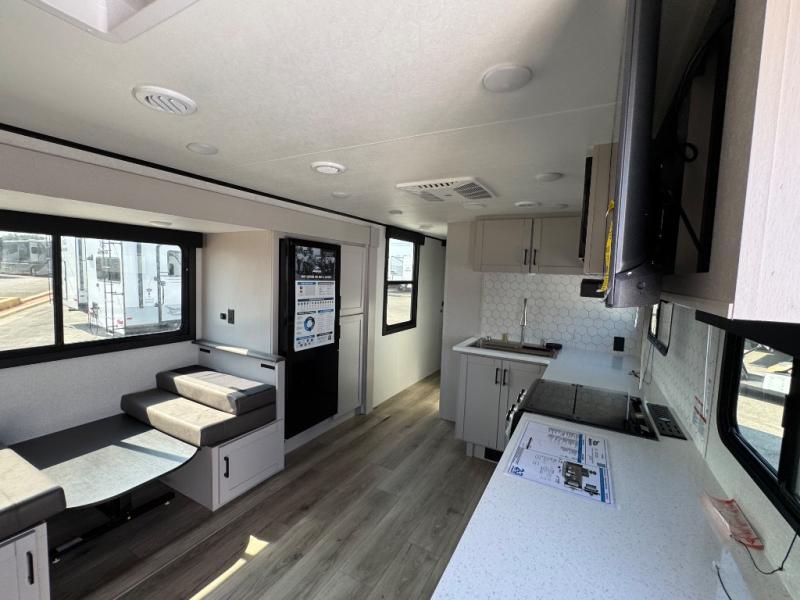 You will experience a smooth flow of traffic in and out of this travel trailer with dual entry doors! The front private bedroom has one of these entrances and a 60" x 80" queen bed with wardrobes on either side to keep your clothes looking nice. The full bathroom has a shower for you to freshen up in each morning and a linen closet to keep your towels close. You will appreciate all of the countertop space to prepare your meal and cook it on the three burner cooktop then enjoy it at the booth dinette. If there happen to be any leftovers then you can store them inside the 11 cu. ft. 12V refrigerator. And the rear theater seating comes with trays to set your bowl of popcorn or drink on!
