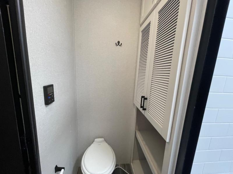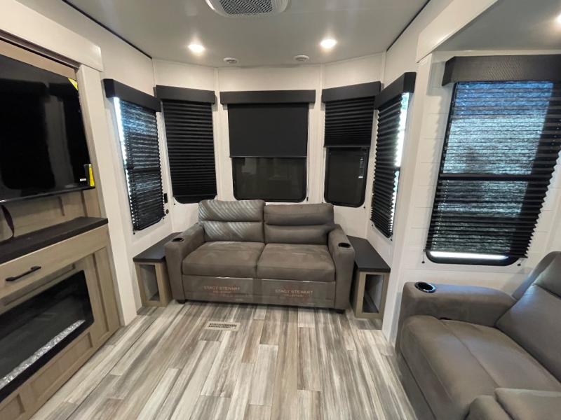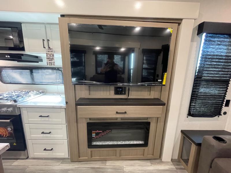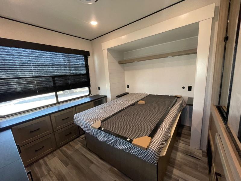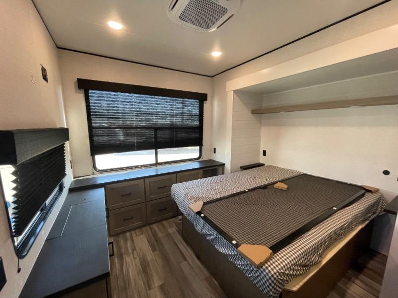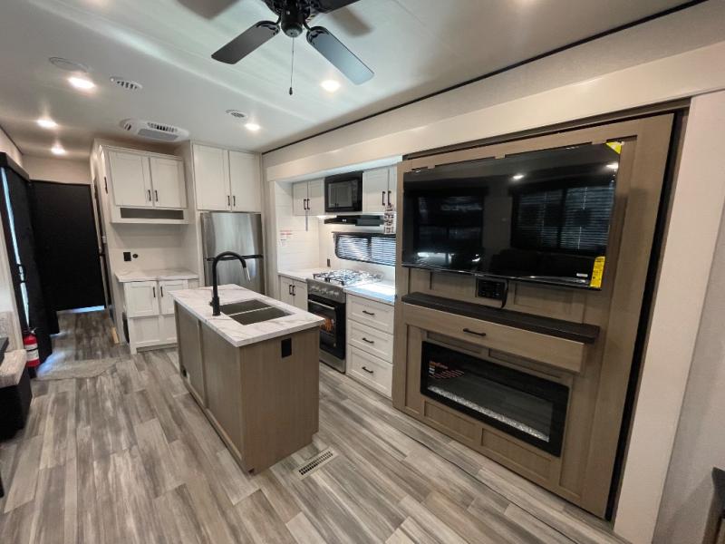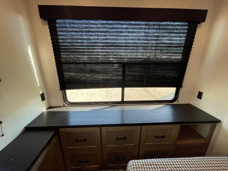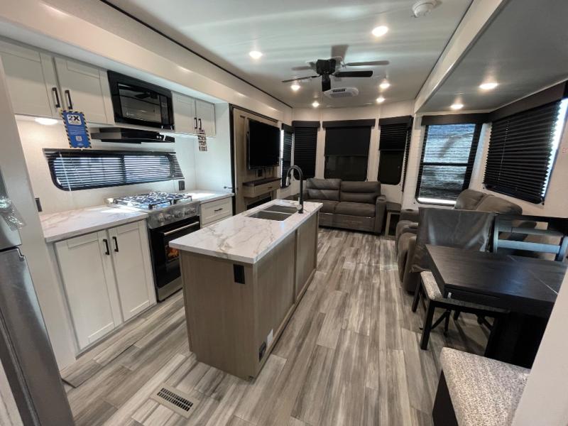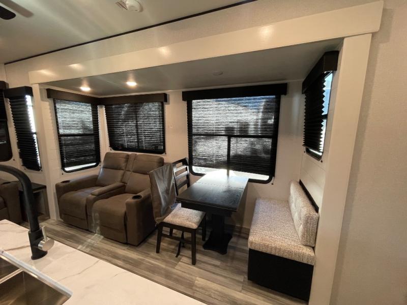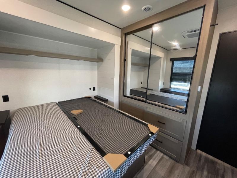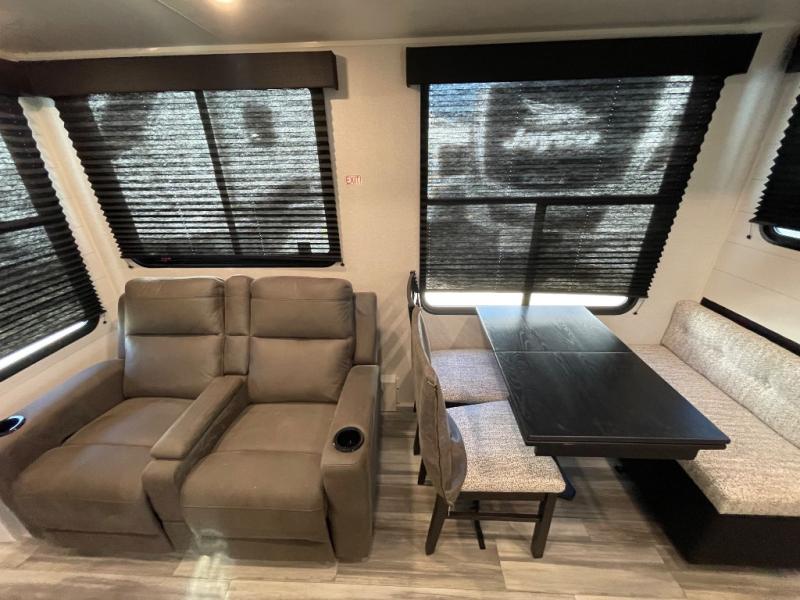 Your crew of four will love extended stays in this triple slide out trailer! Once you've unpacked your bags, you can head to the kitchen to prepare lunch on the cooktop and kitchen island. There is a table and chairs with a bench to dine at, and you can relax on the theater seat after your meal is cleaned up. A front tri-fold sofa will provide more seating space, along with sleeping space for guests. A full bath includes washer and dryer prep if you plan to add these appliances, and the rear private bedroom is sure to make you feel right at home. There is a queen bed slide, a wardrobe, vanity, and large dresser so nothing gets left behind!