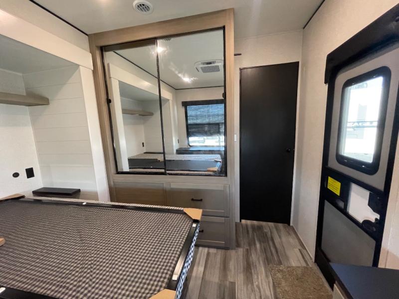 Each Jay Flight Bungalow travel trailer by Jayco features a Magnum Truss roof system, 12 in. I-Class cambered structural steel I-beams, and an insulated and enclosed underbelly for added protection against the elements. You will love the open living space and the atrium-style front wall, along with oversized side windows and hardwood look vinyl flooring. An on-demand tankless water heater will provide endless hot showers, and you're sure to stay comfortable with two A/C units. These travel trailers also include an AM/FM/Bluetooth stereo and marine grade exterior speakers, a power awning with an LED light, an outside shower, plus many more exterior conveniences!