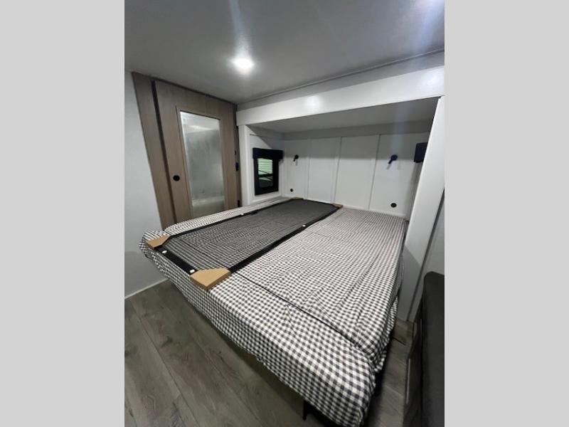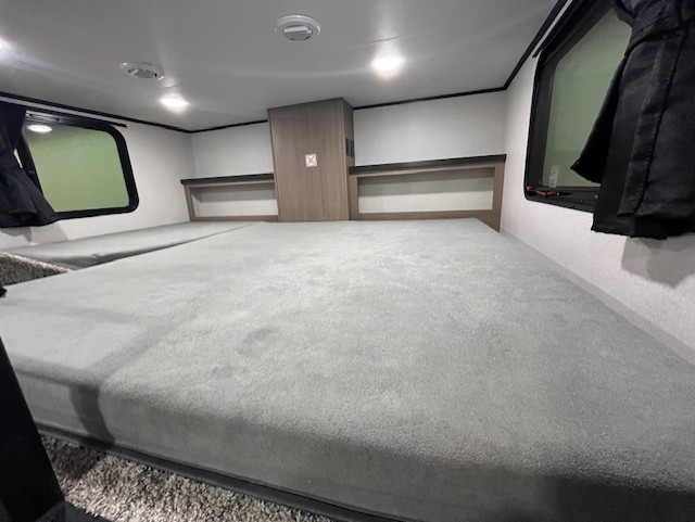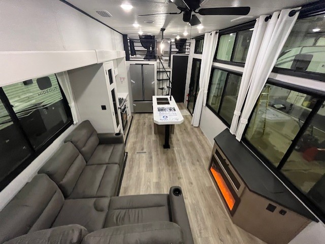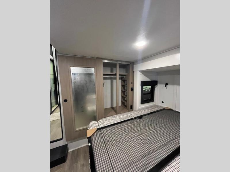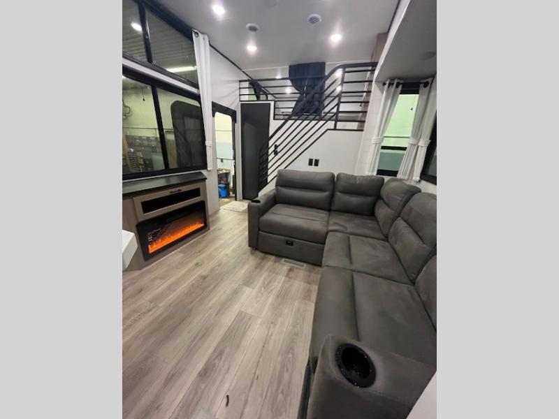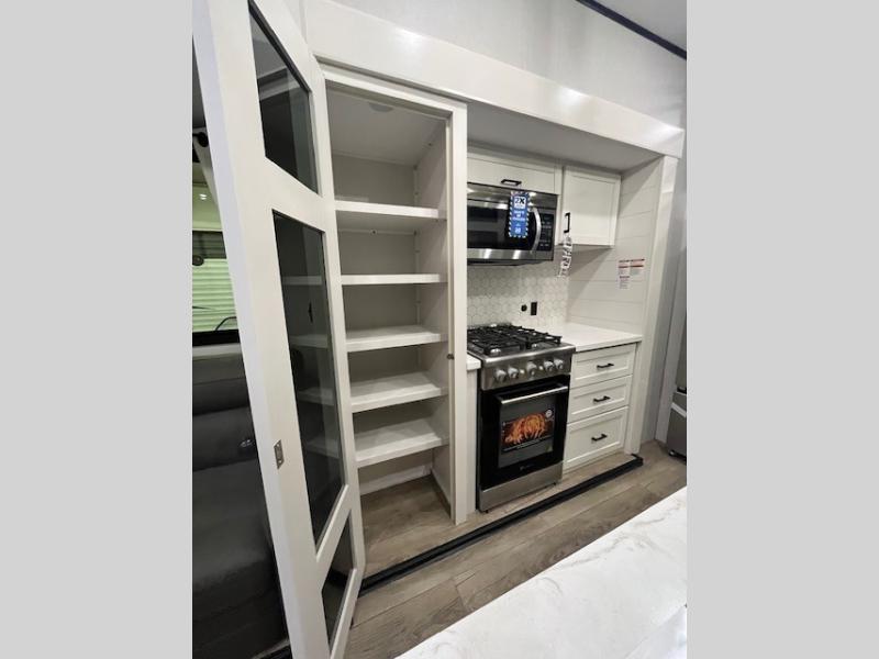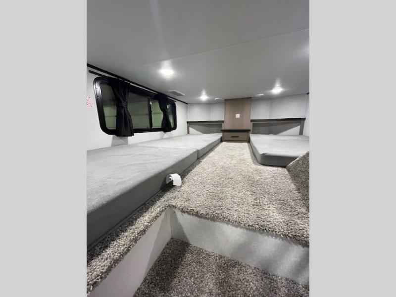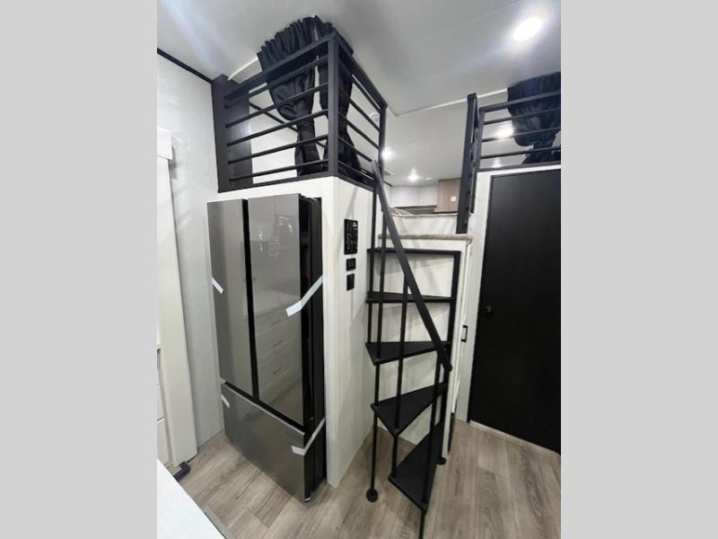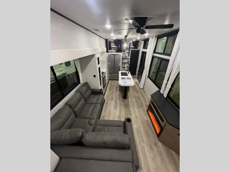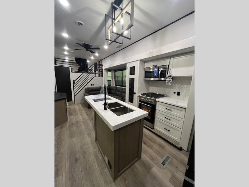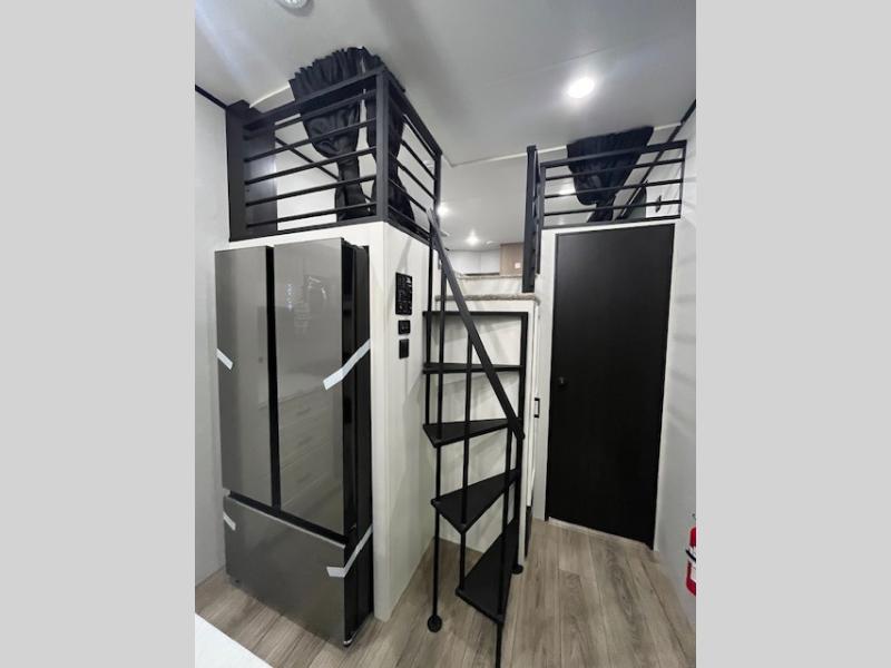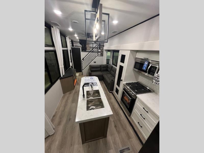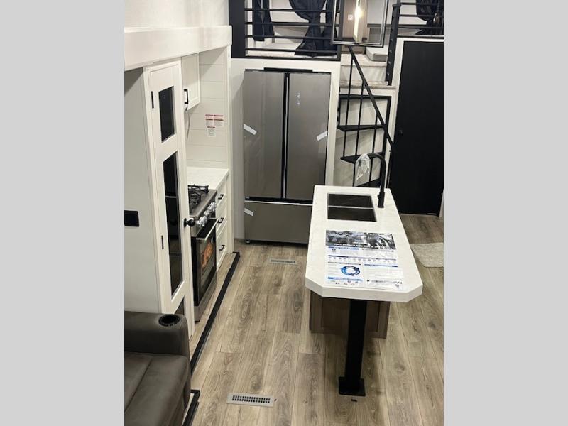 Travel in comfort with your family. You will love having your own bedroom up front with a queen bed, a bench with storage below, plus a dresser and overhead cabinet for your things. The front loft above the bedroom includes three bunk mats, a nightstand, and overhead shelves to keep this space tidy. In the living area, you will be able to enjoy the entertainment center, and a ceiling fan will keep the air moving while the chef cooks delicious meals in the morning. And you all can dine at the kitchen island which includes bar stools. The Kitchen is also fitted with a residential refrigerator, microwave, four cooktop burner, sink and pantry perfect to cook with luxury and comfort. Finally, you'll find a full rear bath with a walk-in shower plus washer and dryer prep. There is even a second loft above the bathroom for more sleeping or storage space!