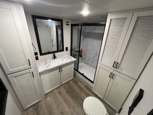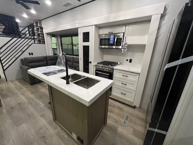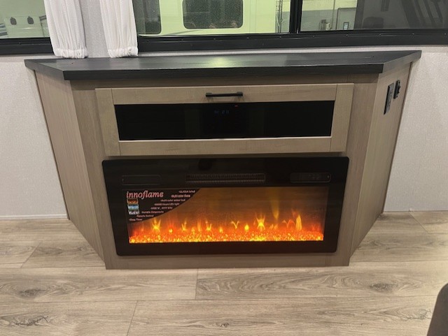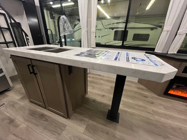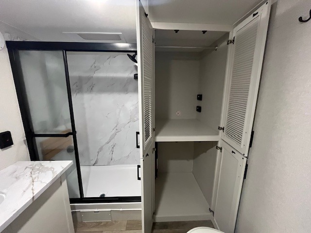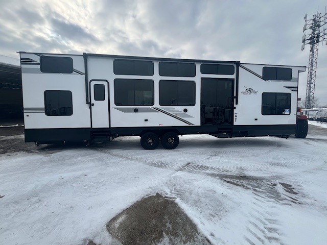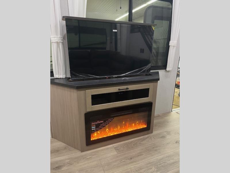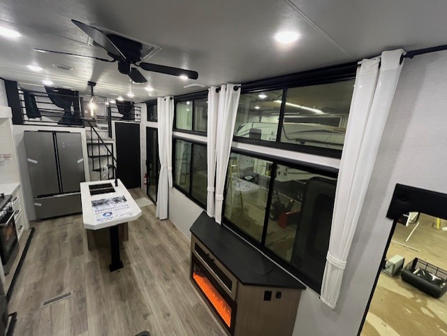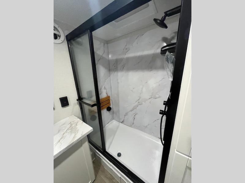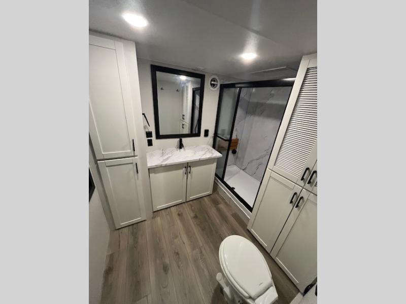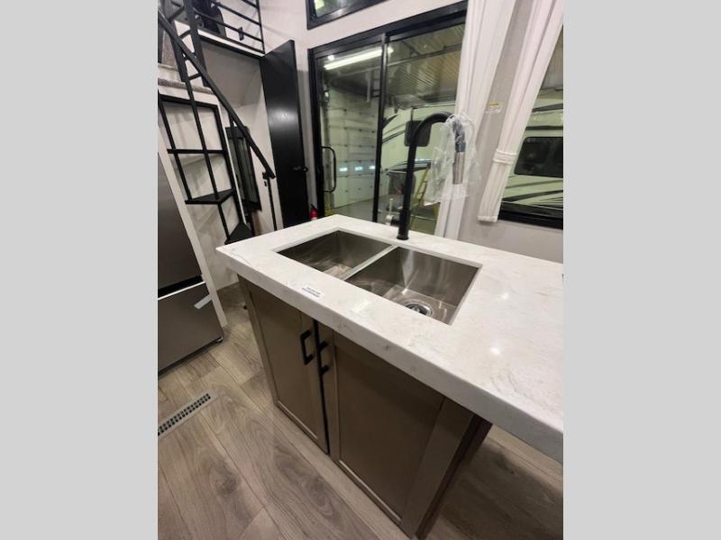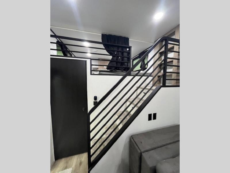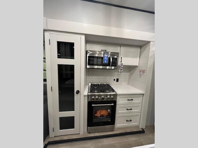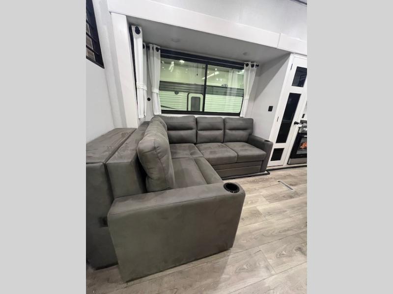 Travel in comfort with your family. You will love having your own bedroom up front with a queen bed, a bench with storage below, plus a dresser and overhead cabinet for your things. The front loft above the bedroom includes three bunk mats, a nightstand, and overhead shelves to keep this space tidy. In the living area, you will be able to enjoy the entertainment center, and a ceiling fan will keep the air moving while the chef cooks delicious meals in the morning. And you all can dine at the kitchen island which includes bar stools. The Kitchen is also fitted with a residential refrigerator, microwave, four cooktop burner, sink and pantry perfect to cook with luxury and comfort. Finally, you'll find a full rear bath with a walk-in shower plus washer and dryer prep. There is even a second loft above the bathroom for more sleeping or storage space!
