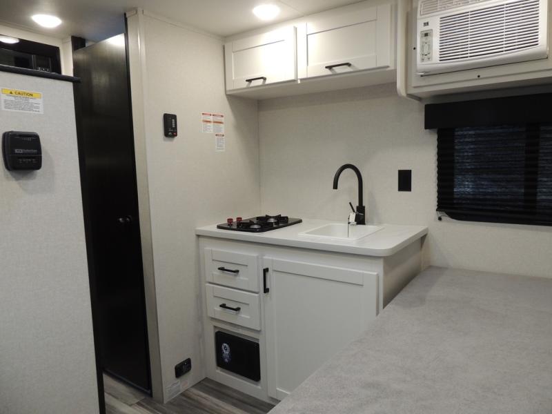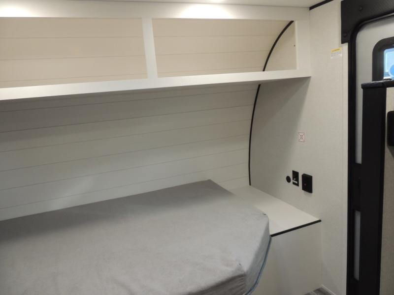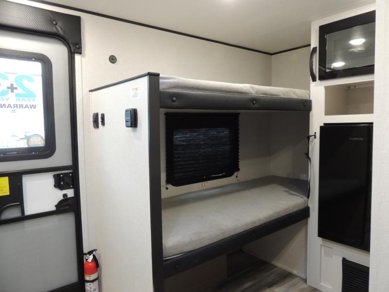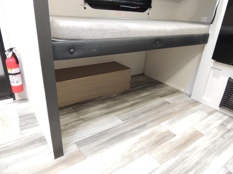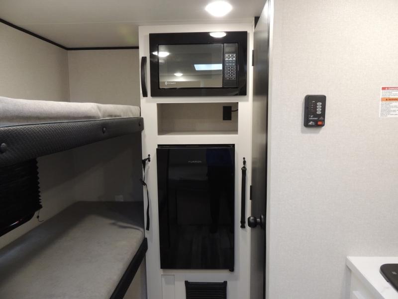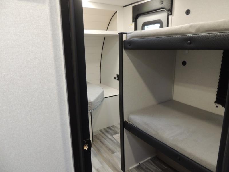 Your crew of four will love camping in this cozy travel trailer! There are bunk beds in the rear corner and a private bath in the other rear corner for easy nighttime use. You will have the front bed to yourselves, along with an overhead shelf and a nightstand/wardrobe for your clothes. The Customer Value Package on this Sport Edition model includes a 19K BTU furnace, stabilizer jacks, a power awning, an entry door with a window and shade prep, and many more stand-out features!