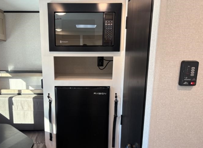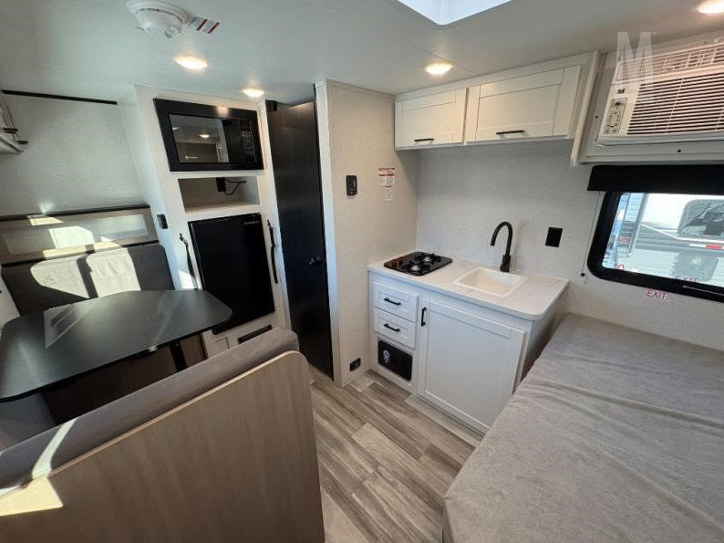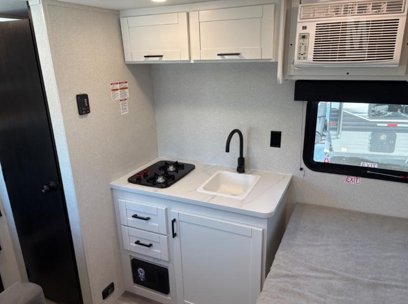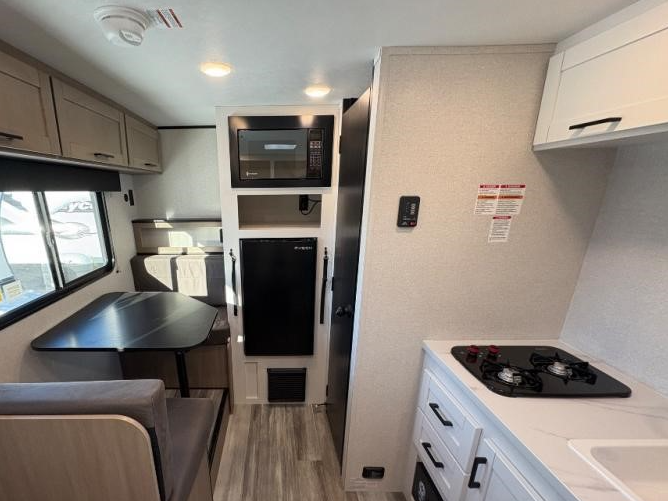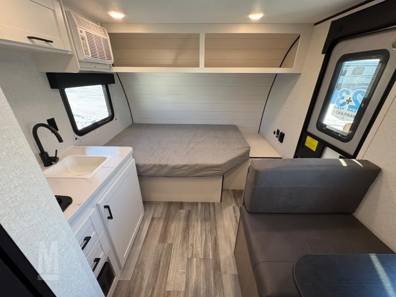 You will love camping in this cozy travel trailer! There is a rear corner booth dinette for dining space and a private bath in the other rear corner to freshen up. You will have the front bed to yourselves, along with an overhead shelf and a nightstand/wardrobe for your clothes. The Customer Value Package on this Sport Edition model includes a 19K BTU furnace, stabilizer jacks, a power awning, an entry door with a window and shade prep, and many more stand-out features!