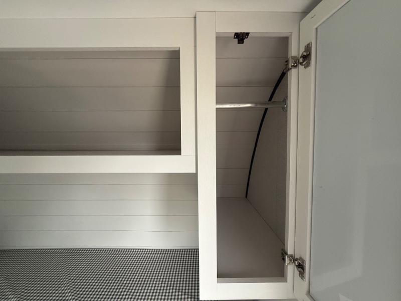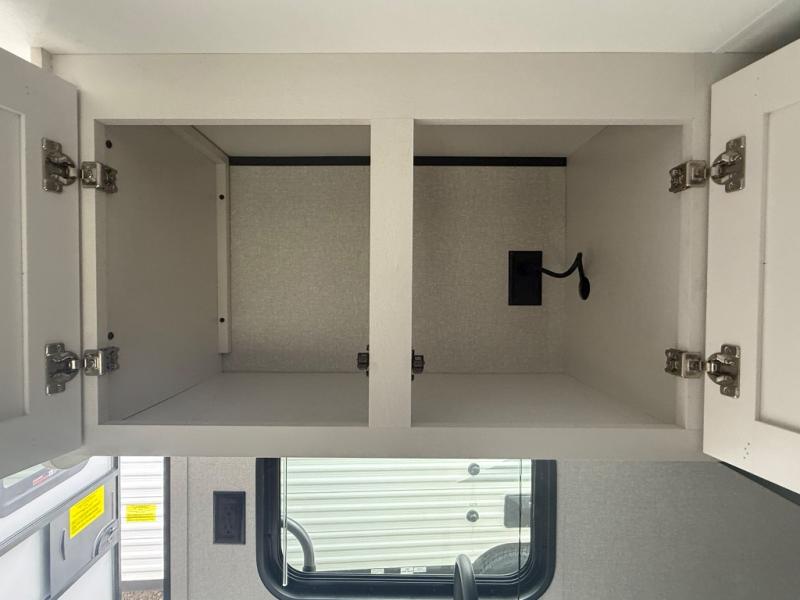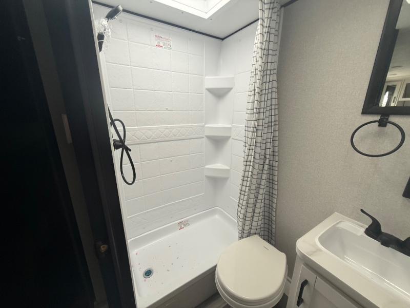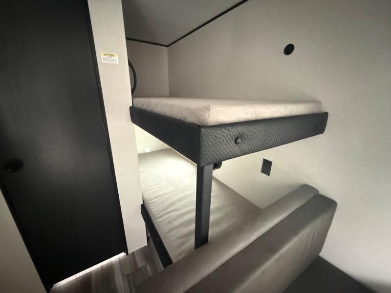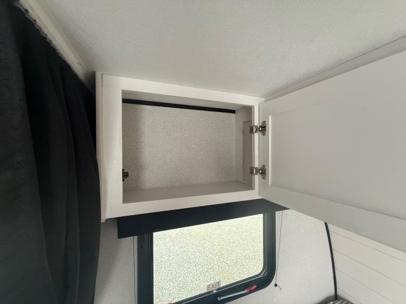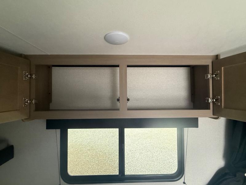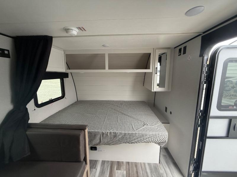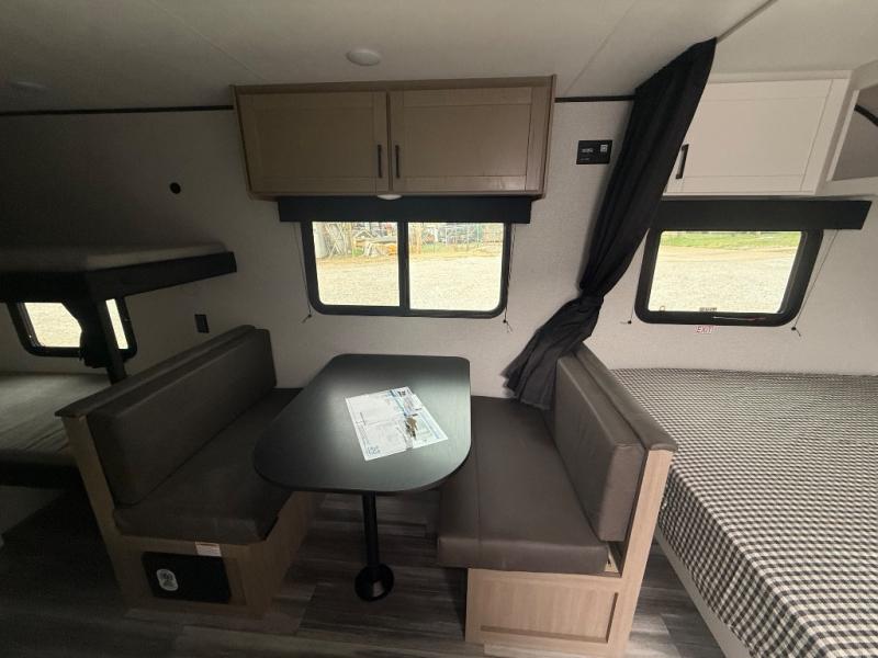 Your crew of five will love camping in this single-axle travel trailer! There are bunk beds in the rear corner and a full bath in the other rear corner for easy nighttime use. You will have the front queen bed to yourselves, along with a privacy curtain, overhead shelf, and a nightstand/wardrobe for your clothes. The booth dinette provides a place to dine, play games, and even let an extra guest stay over.