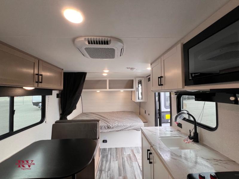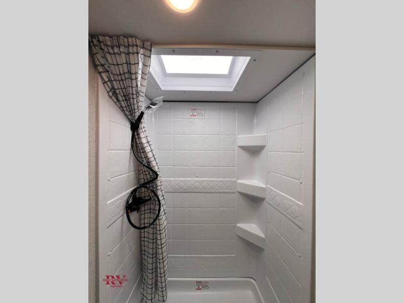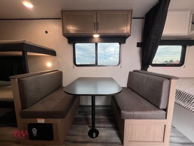 Your crew of five will love camping in this single-axle travel trailer! There are bunk beds in the rear corner and a full bath in the other rear corner for easy nighttime use. You will have the front queen bed to yourselves, along with a privacy curtain, overhead shelf, and a nightstand/wardrobe for your clothes. The booth dinette provides a place to dine, play games, and even let an extra guest stay over.