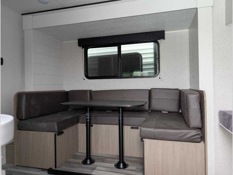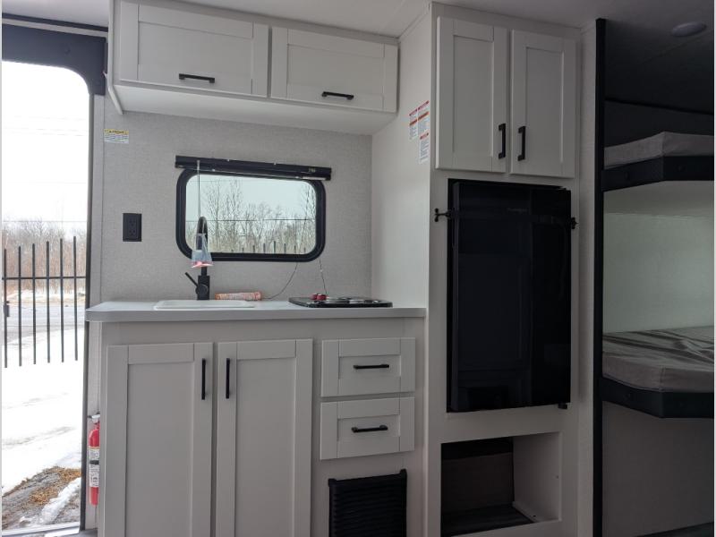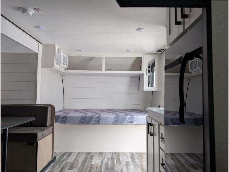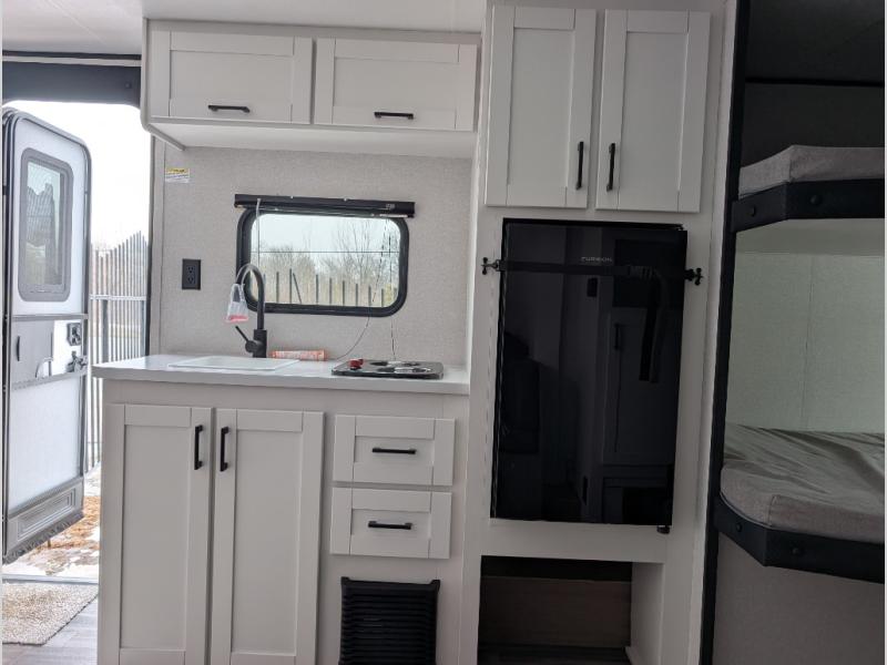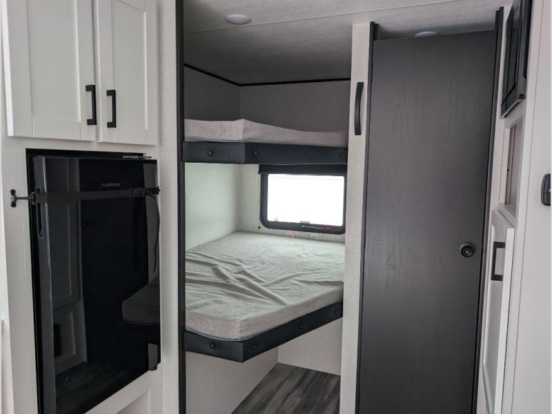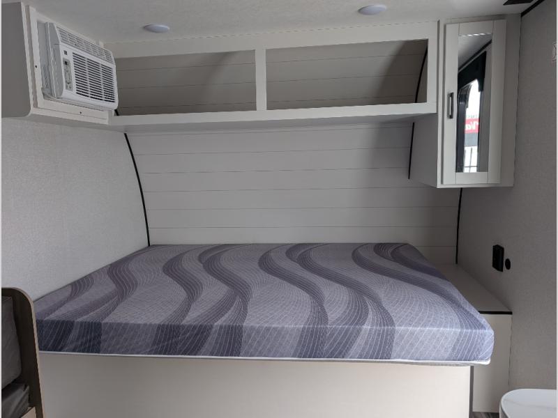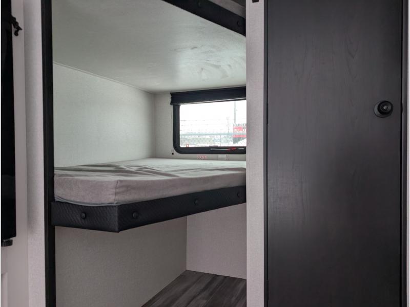 Your crew of eight will love camping in this travel trailer! There are double-size bunk beds in the rear corner and a private bath in the other rear corner for easy nighttime use. You will have the front queen bed to yourselves, along with an overhead shelf and a nightstand for your things. And the U-shaped dinette provides a place to dine, play games, and even let more guests sleep over. The Customer Value Package on this Sport Edition model includes a 19K BTU furnace, stabilizer jacks, a power awning, an entry door with a window and shade prep, and many more stand-out features!