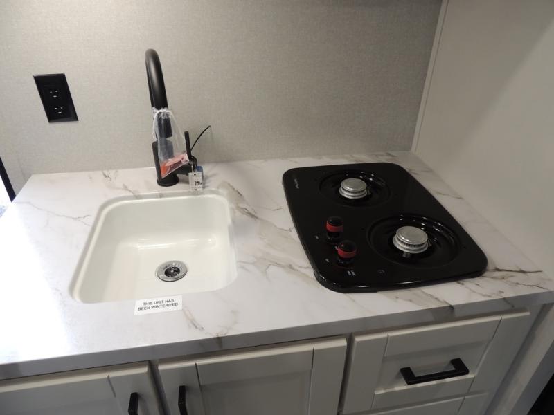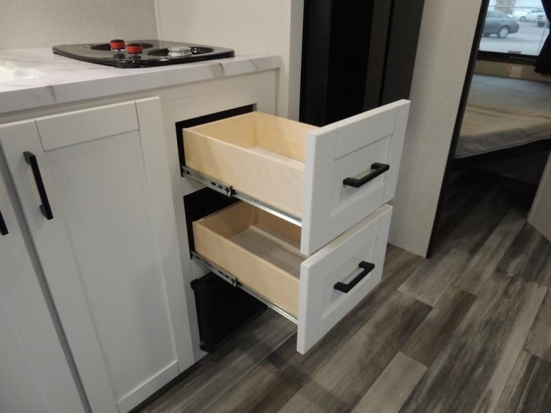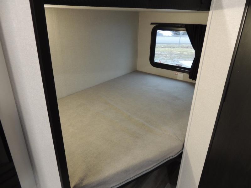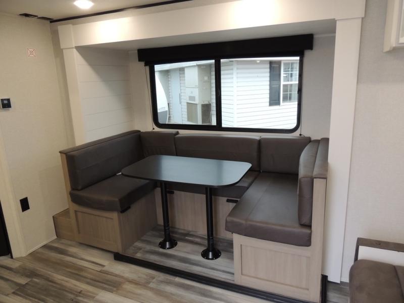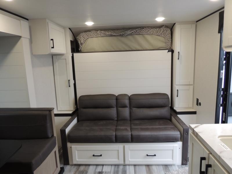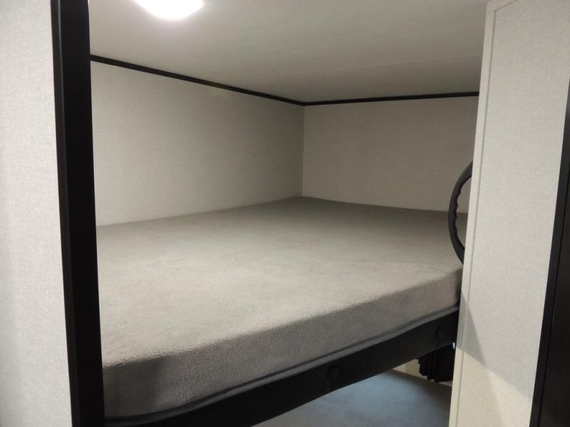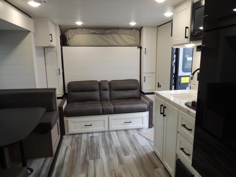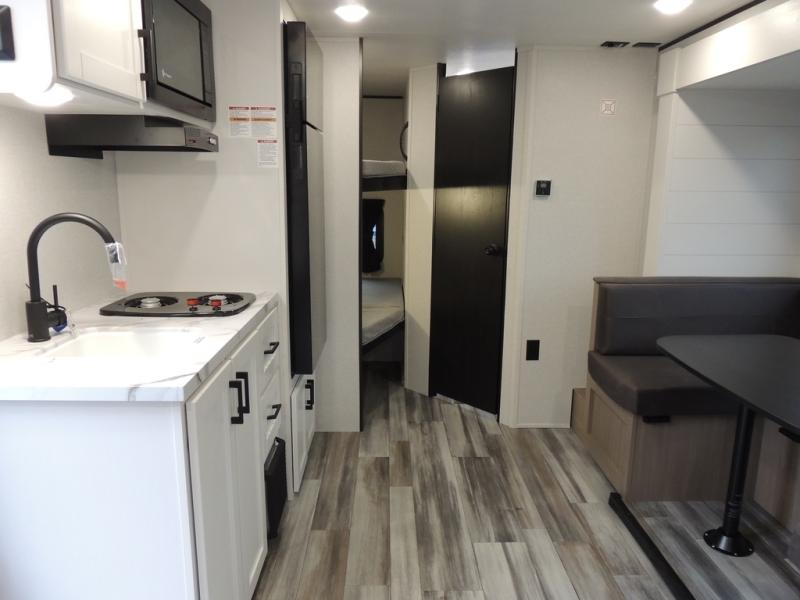 Any time spent in this travel trailer will be time well spent! You can easily sleep eight people each night thanks to the double-size bunks, front Murphy bed, and U-shaped dinette within the slide out. There is a full bath next to the bunks for easy nighttime use, and the linen closet will be perfect for clean towels. A cooktop, microwave oven, and 8 cu. ft. 12V refrigerator will let you cook and store food, and there is an overhead cabinet for spices or snacks!