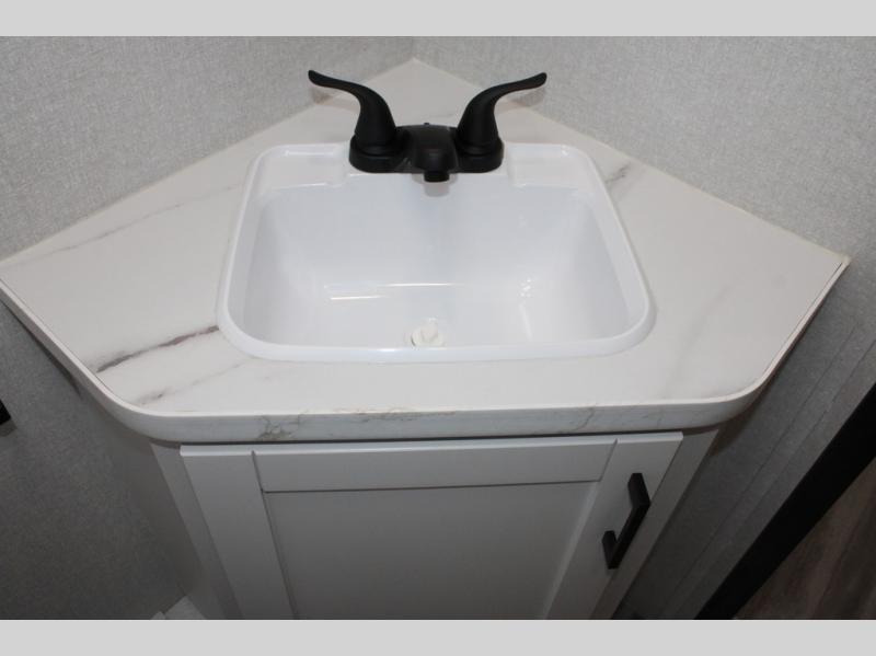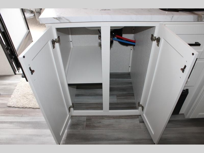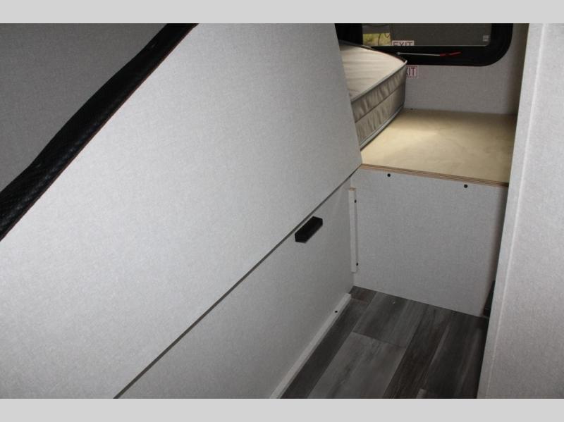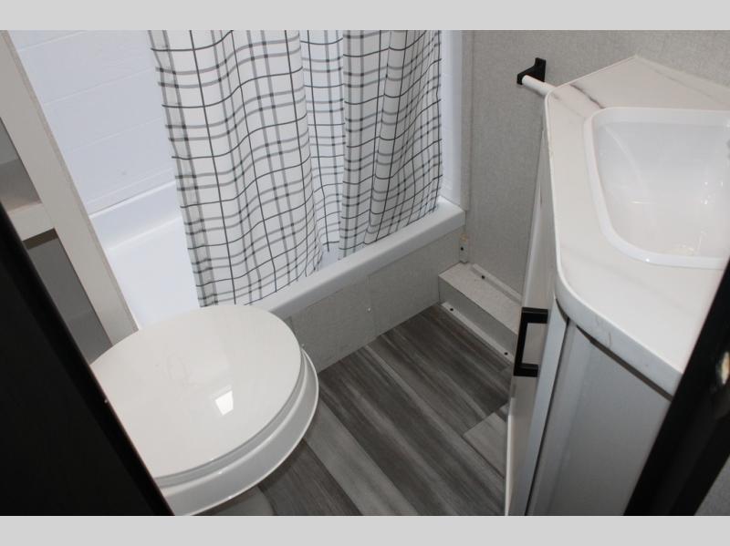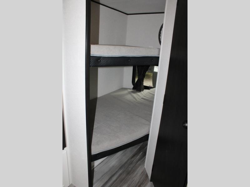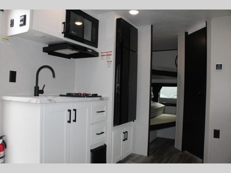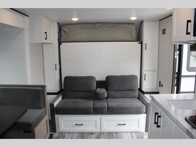 Any time spent in this travel trailer will be time well spent! You can easily sleep eight people each night thanks to the double-size bunks, front Murphy bed, and U-shaped dinette within the slide out. There is a full bath next to the bunks for easy nighttime use, and the linen closet will be perfect for clean towels. A cooktop, microwave oven, and 8 cu. ft. 12V refrigerator will let you cook and store food, and there is an overhead cabinet for spices or snacks!