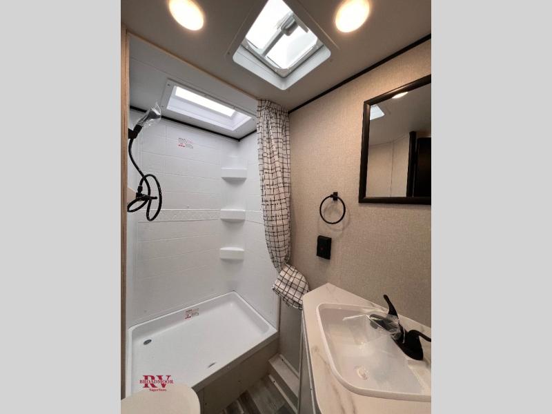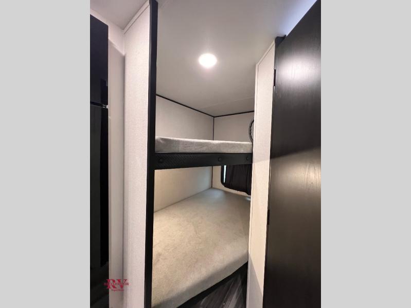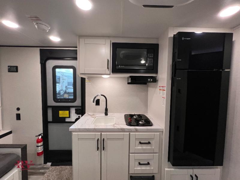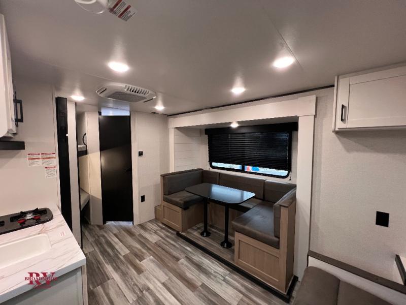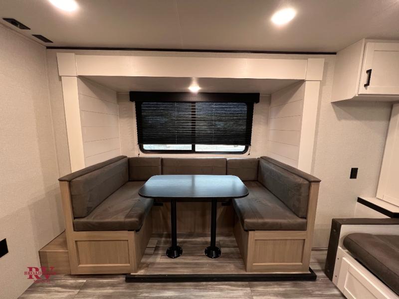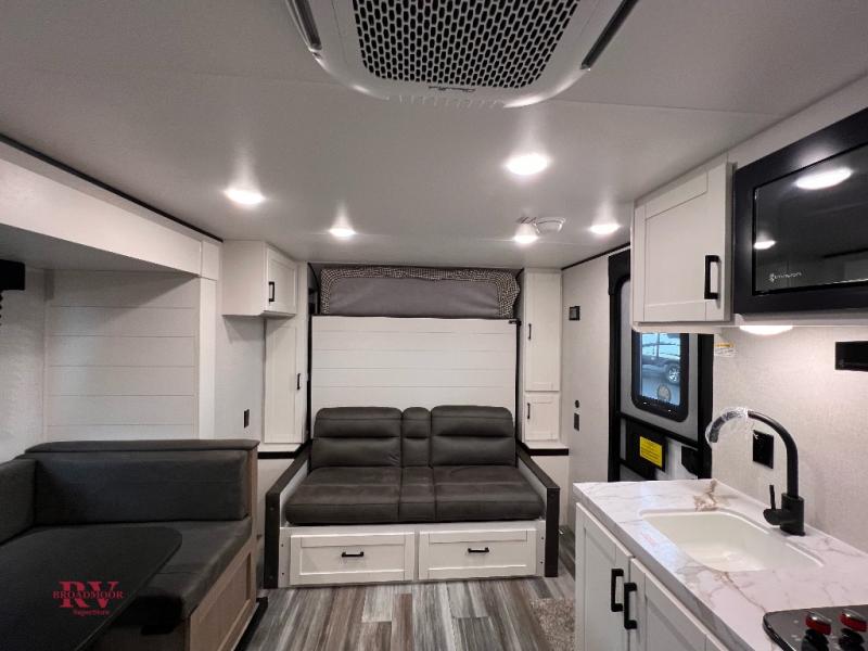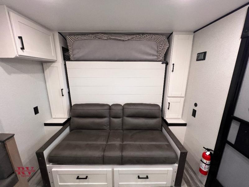 Any time spent in this travel trailer will be time well spent! You can easily sleep eight people each night thanks to the double-size bunks, front Murphy bed, and U-shaped dinette within the slide out. There is a full bath next to the bunks for easy nighttime use, and the linen closet will be perfect for clean towels. A cooktop, microwave oven, and 8 cu. ft. 12V refrigerator will let you cook and store food, and there is an overhead cabinet for spices or snacks!