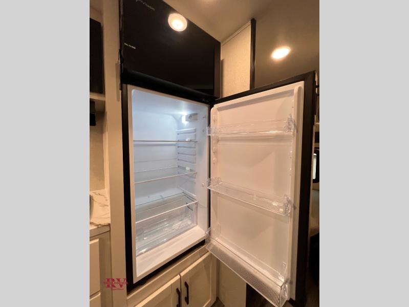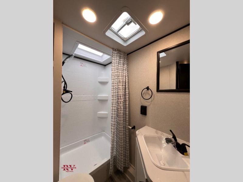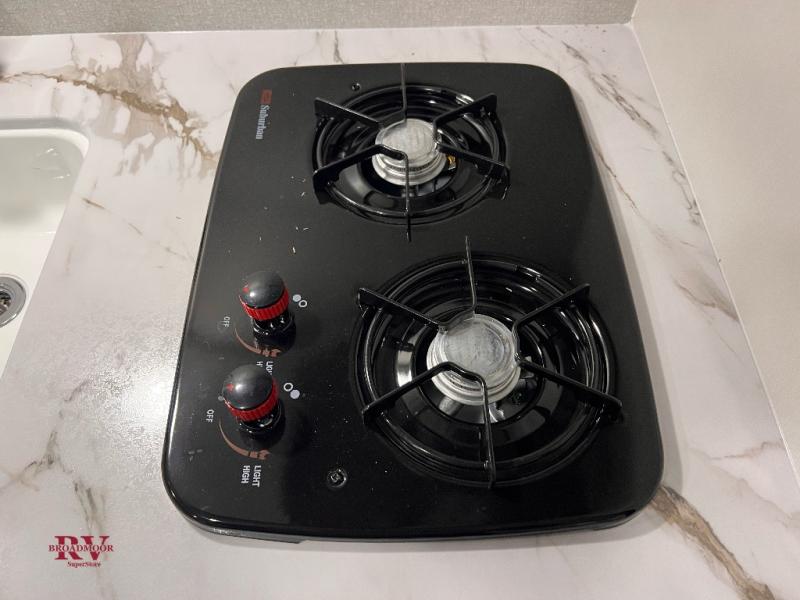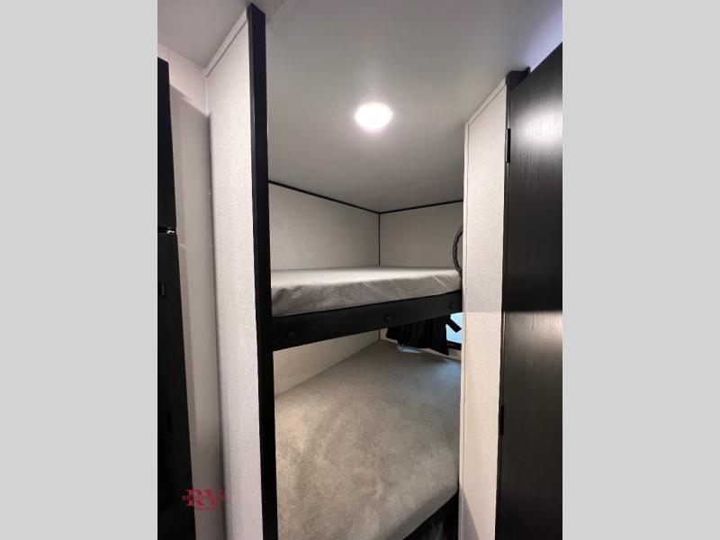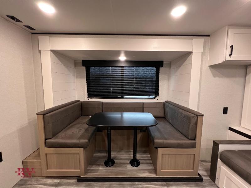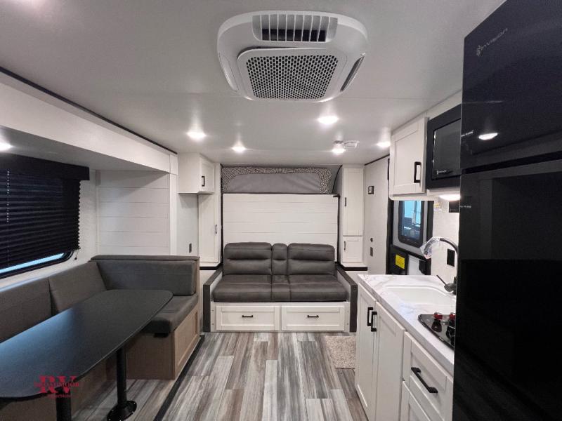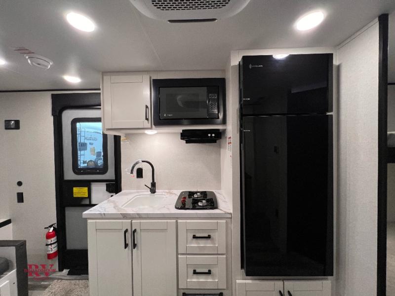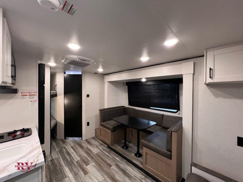 Any time spent in this travel trailer will be time well spent! You can easily sleep eight people each night thanks to the double-size bunks, front Murphy bed, and U-shaped dinette within the slide out. There is a full bath next to the bunks for easy nighttime use, and the linen closet will be perfect for clean towels. A cooktop, microwave oven, and 8 cu. ft. 12V refrigerator will let you cook and store food, and there is an overhead cabinet for spices or snacks!