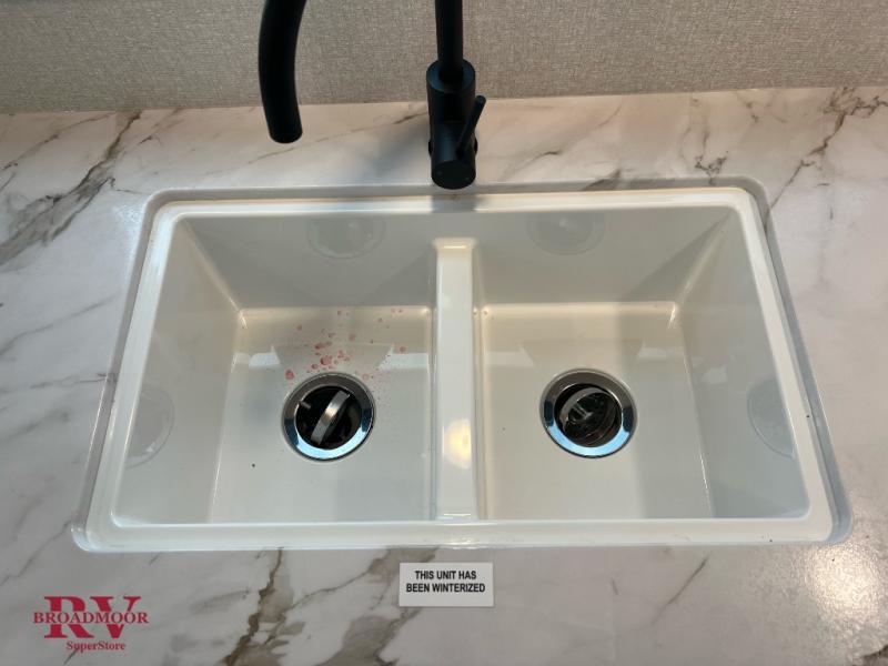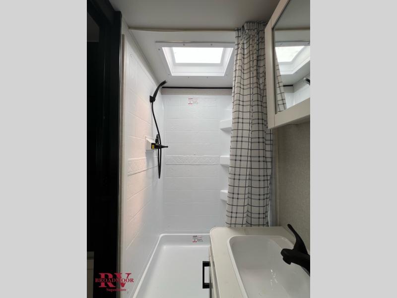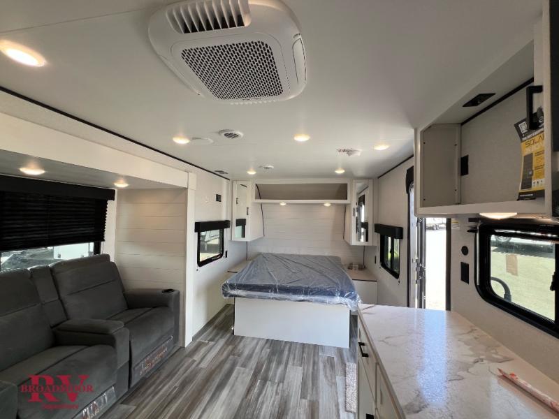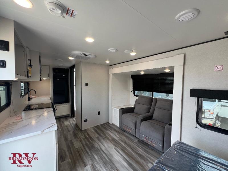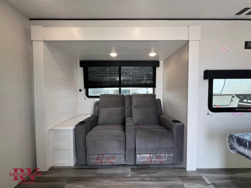 This couple's trailer will be perfect for weekend trips to the lake or extended stays at the campground. You can sleep on the front queen bed each night instead of on an air mattress, and the dual bedroom wardrobes will help keep your space organized. The theater seat with tables is within a slide for more floor space, and the fully-equipped kitchen will allow you to make meals each day. You'll also appreciate the rear corner full bath to stay clean throughout each trip!