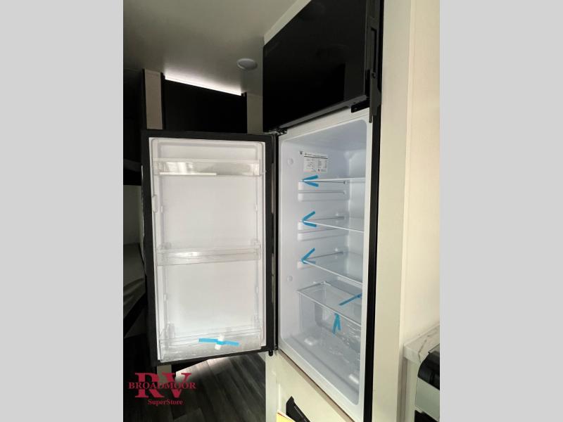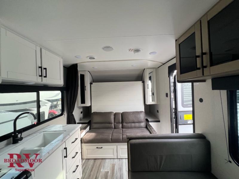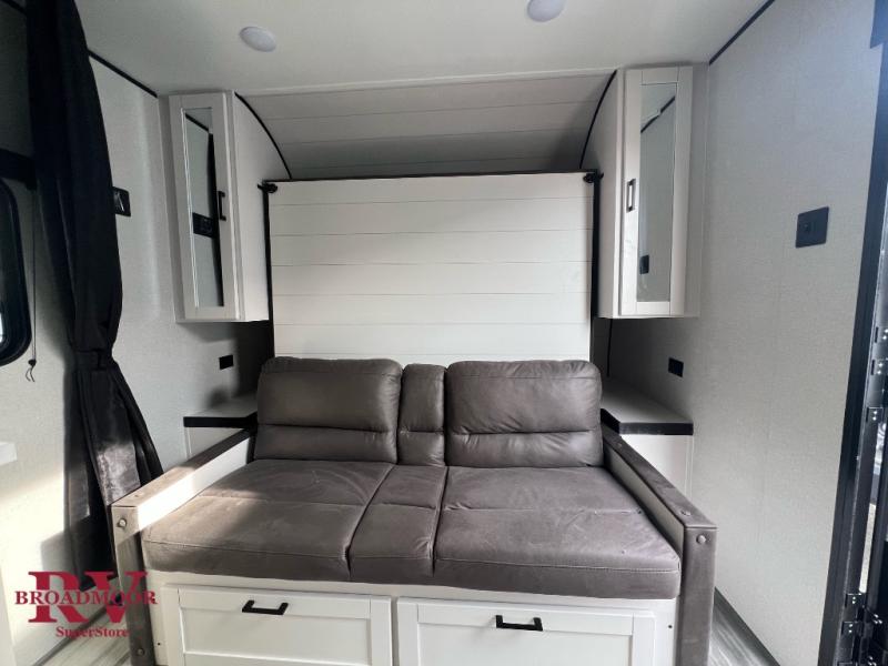 You'll love camping at the lake in this versatile travel trailer. Since there is a Murphy bed up front, you can fold it away in the morning to enjoy the Jack-knife sofa, plus there is a booth dinette for even more seating space. The microwave oven and cooktop in the kitchen allow you to make meals each day, and the 8 cu. ft. 12V refrigerator will keep perishables fresh. Your guests or the little ones are sure to love the double-size bunks, and the rear corner bath is right next to the bunks for easy nighttime use!