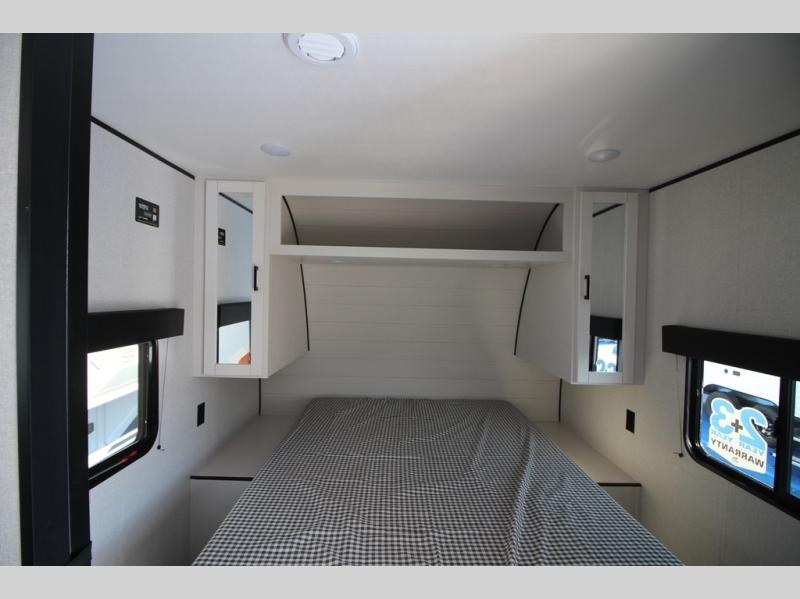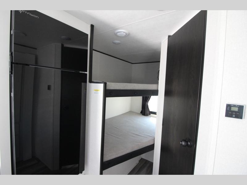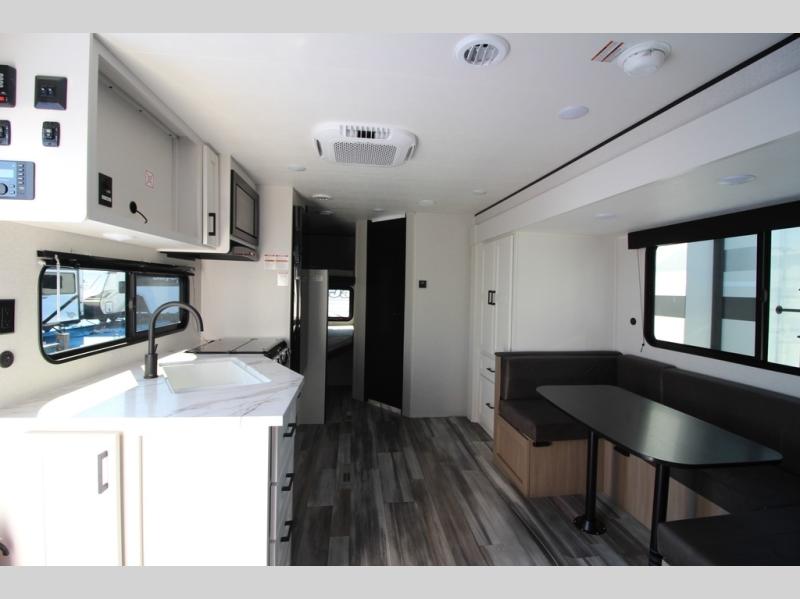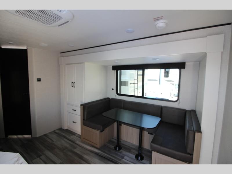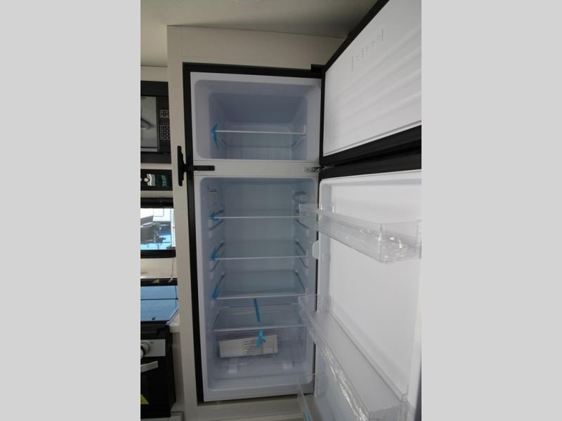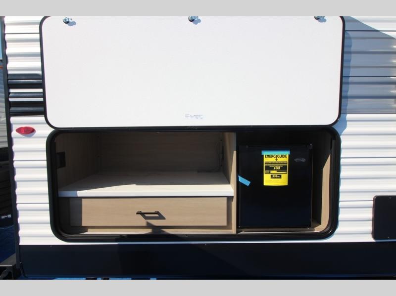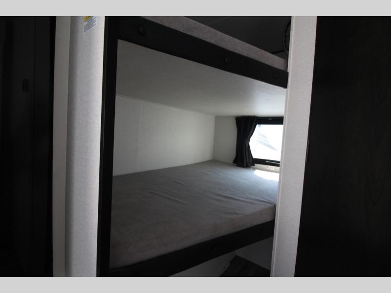 You can comfortably sleep eight people in this travel trailer thanks to the double-size bunks in back, the 60" x 80" queen bed in the front bedroom, plus the U-shaped dinette within the slide out! The chef of your crew will have a three burner cooktop and microwave oven to prepare meals, and everyone can store their favorite drinks in the 12V refrigerator inside or in the exterior refrigerator! This unit also includes ample storage space, including a large pantry and dual bedside wardrobes.