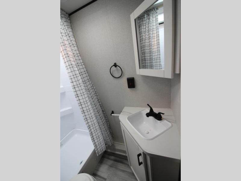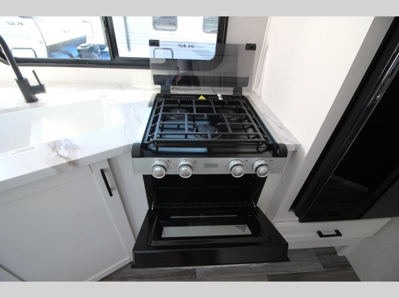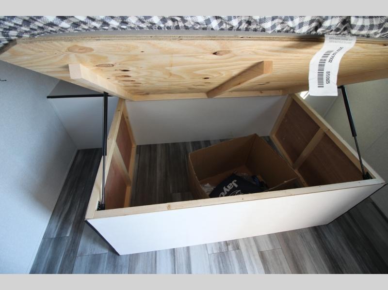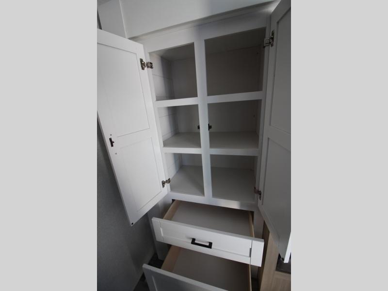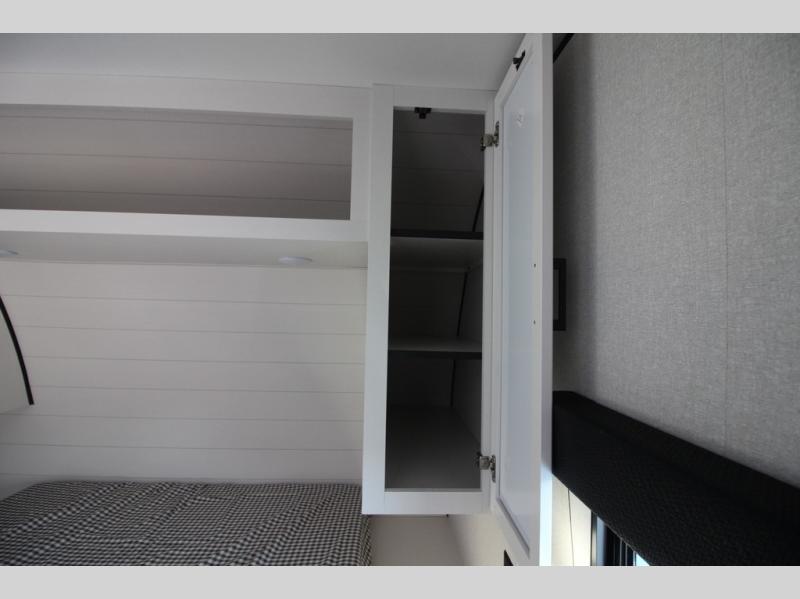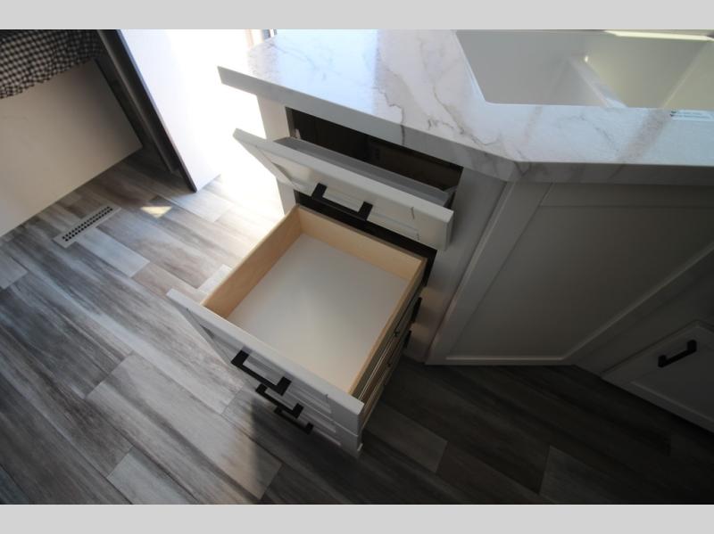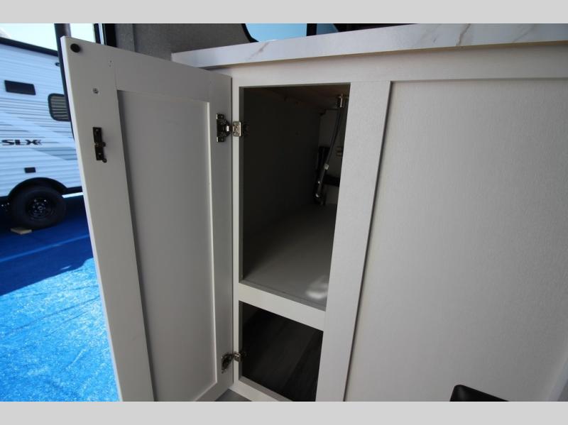You can comfortably sleep eight people in this travel trailer thanks to the double-size bunks in back, the 60" x 80" queen bed in the front bedroom, plus the U-shaped dinette within the slide out! The chef of your crew will have a three burner cooktop and microwave oven to prepare meals, and everyone can store their favorite drinks in the 12V refrigerator inside or in the exterior refrigerator! This unit also includes ample storage space, including a large pantry and dual bedside wardrobes.