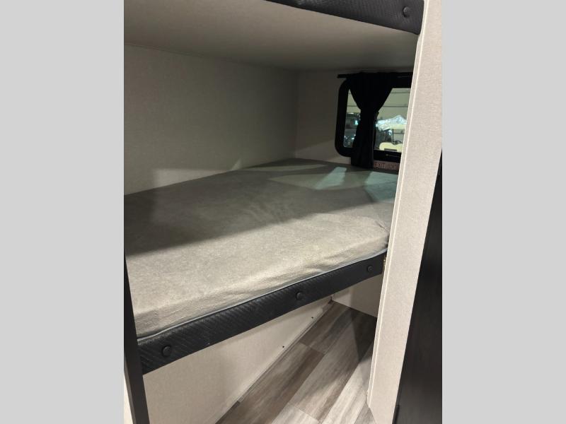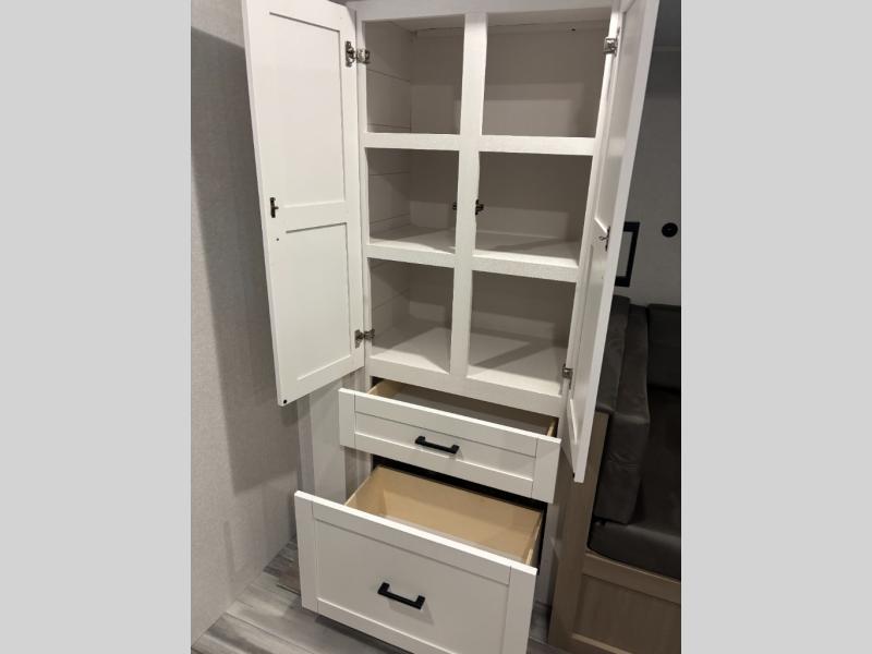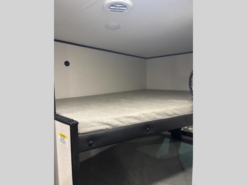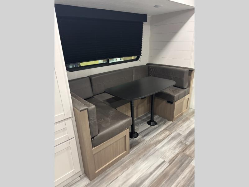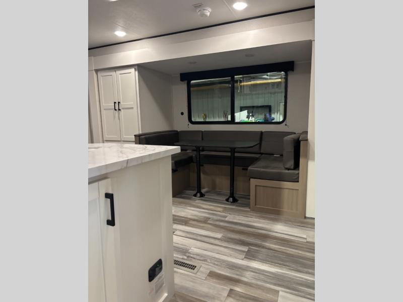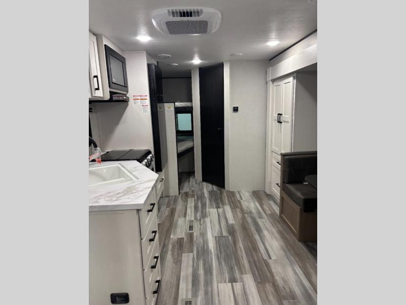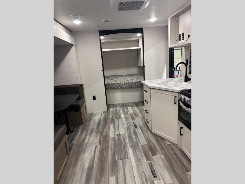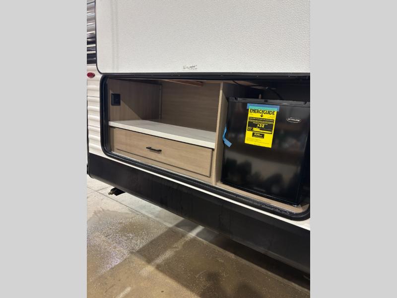 You can comfortably sleep eight people in this travel trailer thanks to the double-size bunks in back, the 60" x 80" queen bed in the front bedroom, plus the U-shaped dinette within the slide out! The chef of your crew will have a three burner cooktop and microwave oven to prepare meals, and everyone can store their favorite drinks in the 12V refrigerator inside or in the exterior refrigerator! This unit also includes ample storage space, including a large pantry and dual bedside wardrobes.