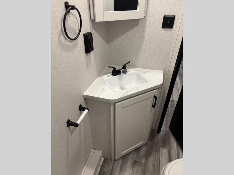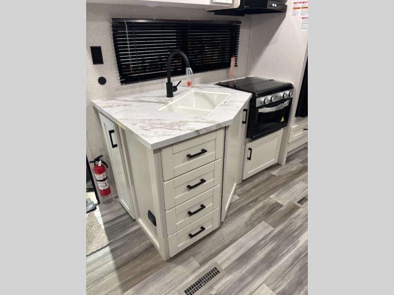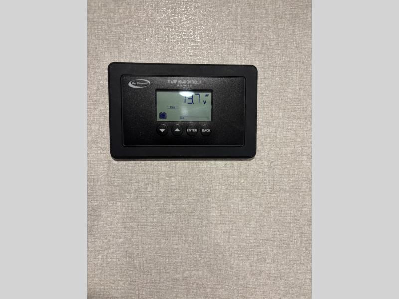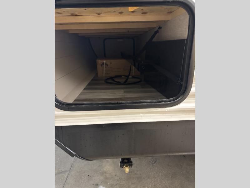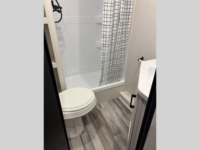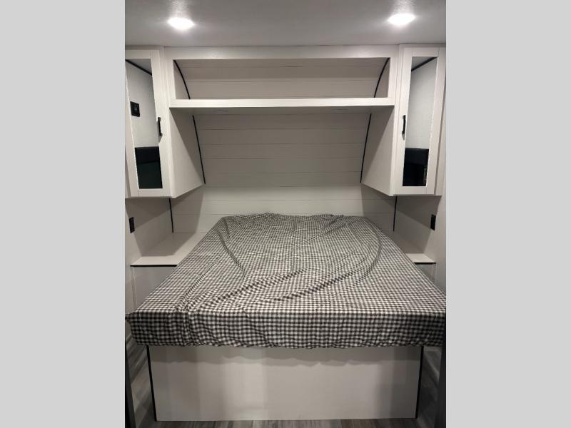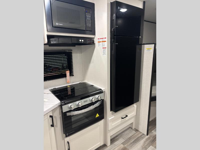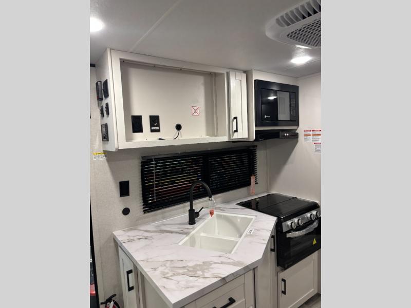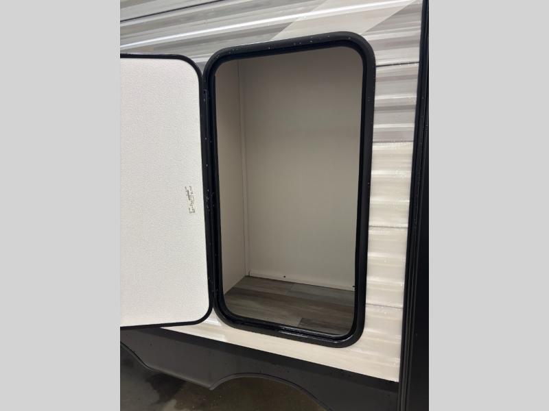You can comfortably sleep eight people in this travel trailer thanks to the double-size bunks in back, the 60" x 80" queen bed in the front bedroom, plus the U-shaped dinette within the slide out! The chef of your crew will have a three burner cooktop and microwave oven to prepare meals, and everyone can store their favorite drinks in the 12V refrigerator inside or in the exterior refrigerator! This unit also includes ample storage space, including a large pantry and dual bedside wardrobes.