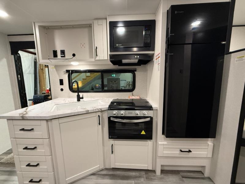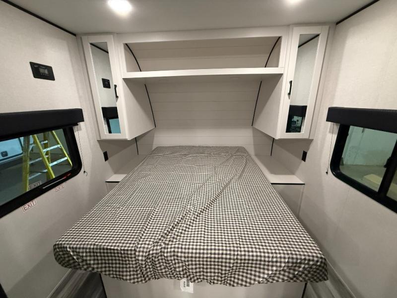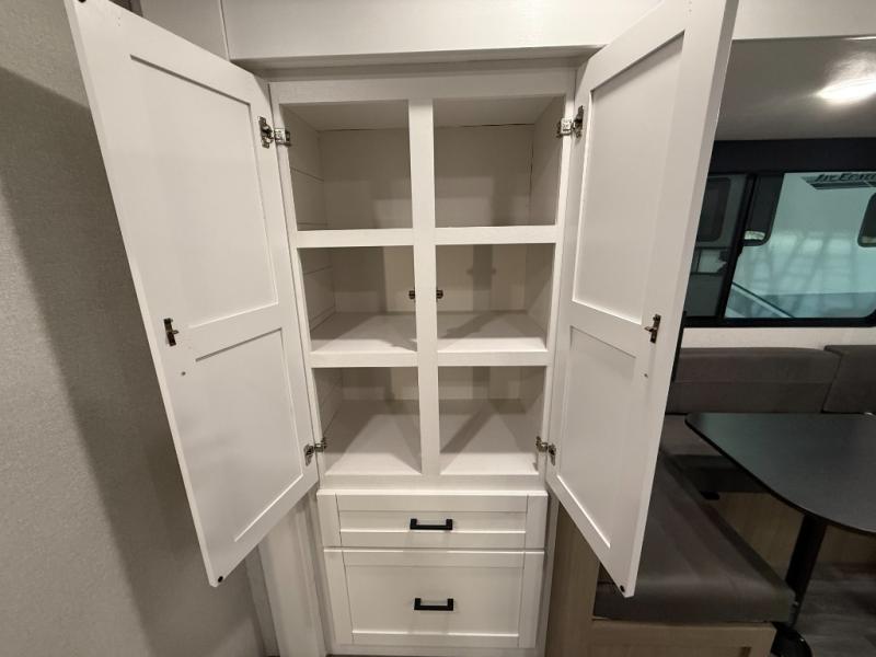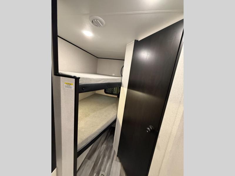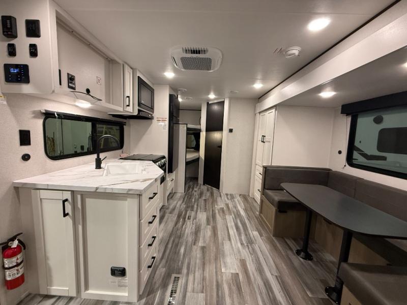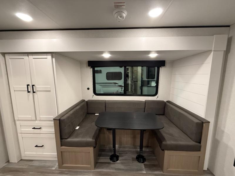 You can comfortably sleep eight people in this travel trailer thanks to the double-size bunks in back, the 60" x 80" queen bed in the front bedroom, plus the U-shaped dinette within the slide out! The chef of your crew will have a three burner cooktop and microwave oven to prepare meals, and everyone can store their favorite drinks in the 12V refrigerator inside or in the exterior refrigerator! This unit also includes ample storage space, including a large pantry and dual bedside wardrobes.