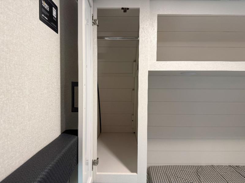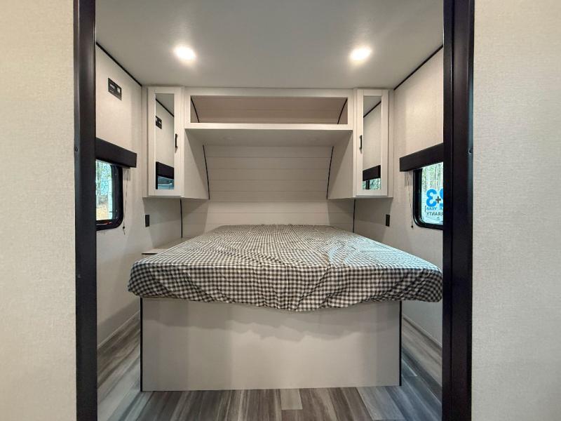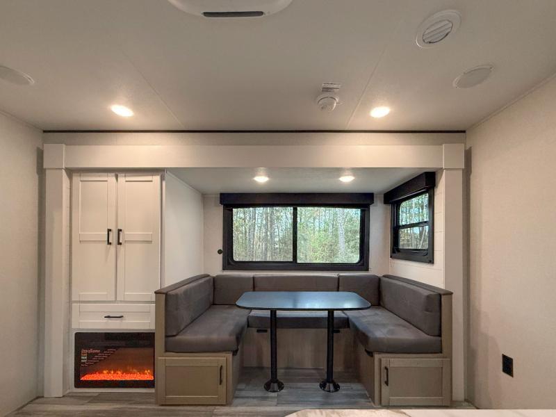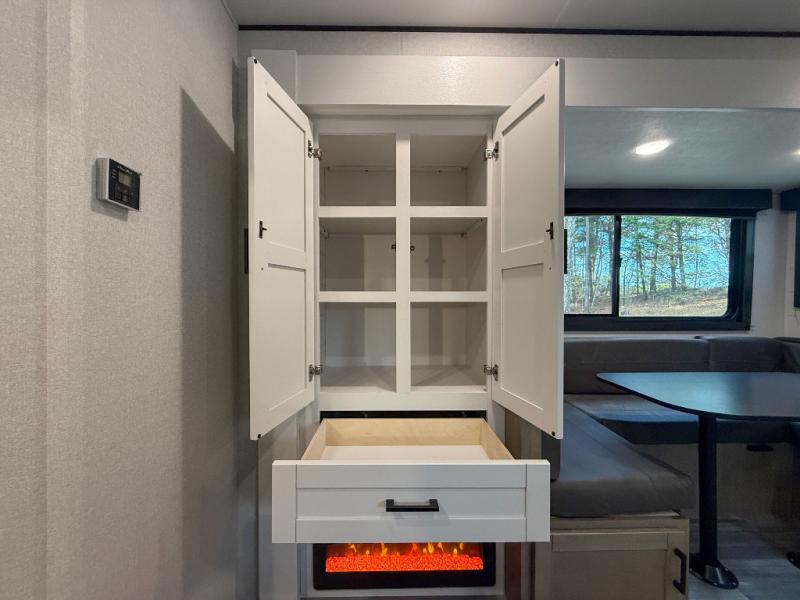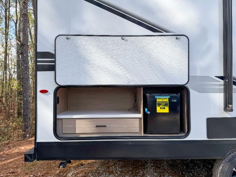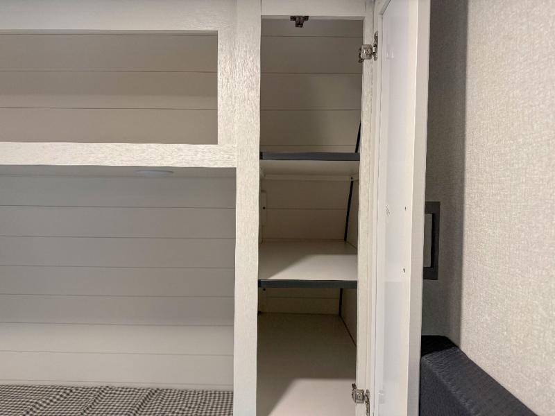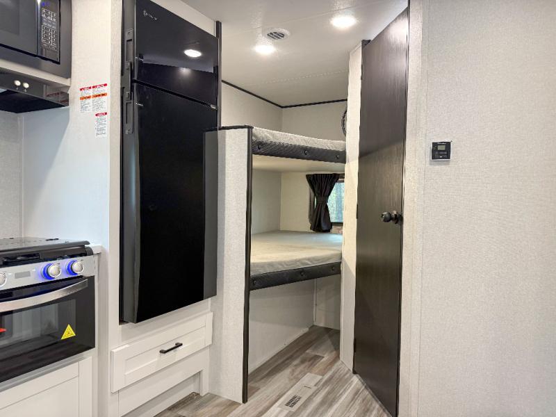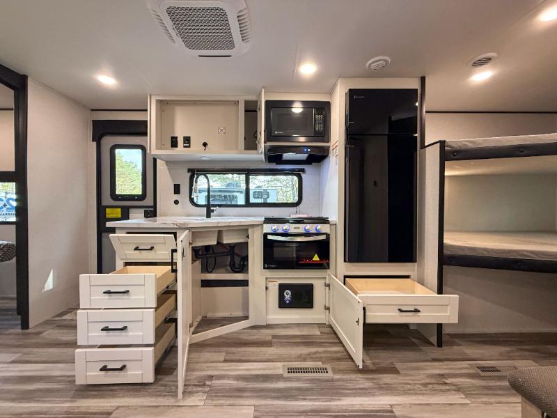 You can comfortably sleep eight people in this travel trailer thanks to the double-size bunks in back, the 60" x 80" queen bed in the front bedroom, plus the U-shaped dinette within the slide out! The chef of your crew will have a three burner cooktop and microwave oven to prepare meals, and everyone can store their favorite drinks in the 12V refrigerator inside or in the exterior refrigerator! This unit also includes ample storage space, including a large pantry and dual bedside wardrobes.